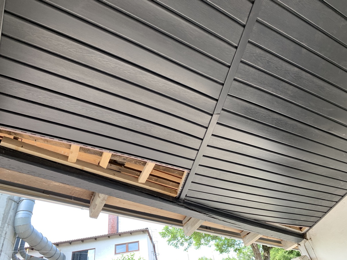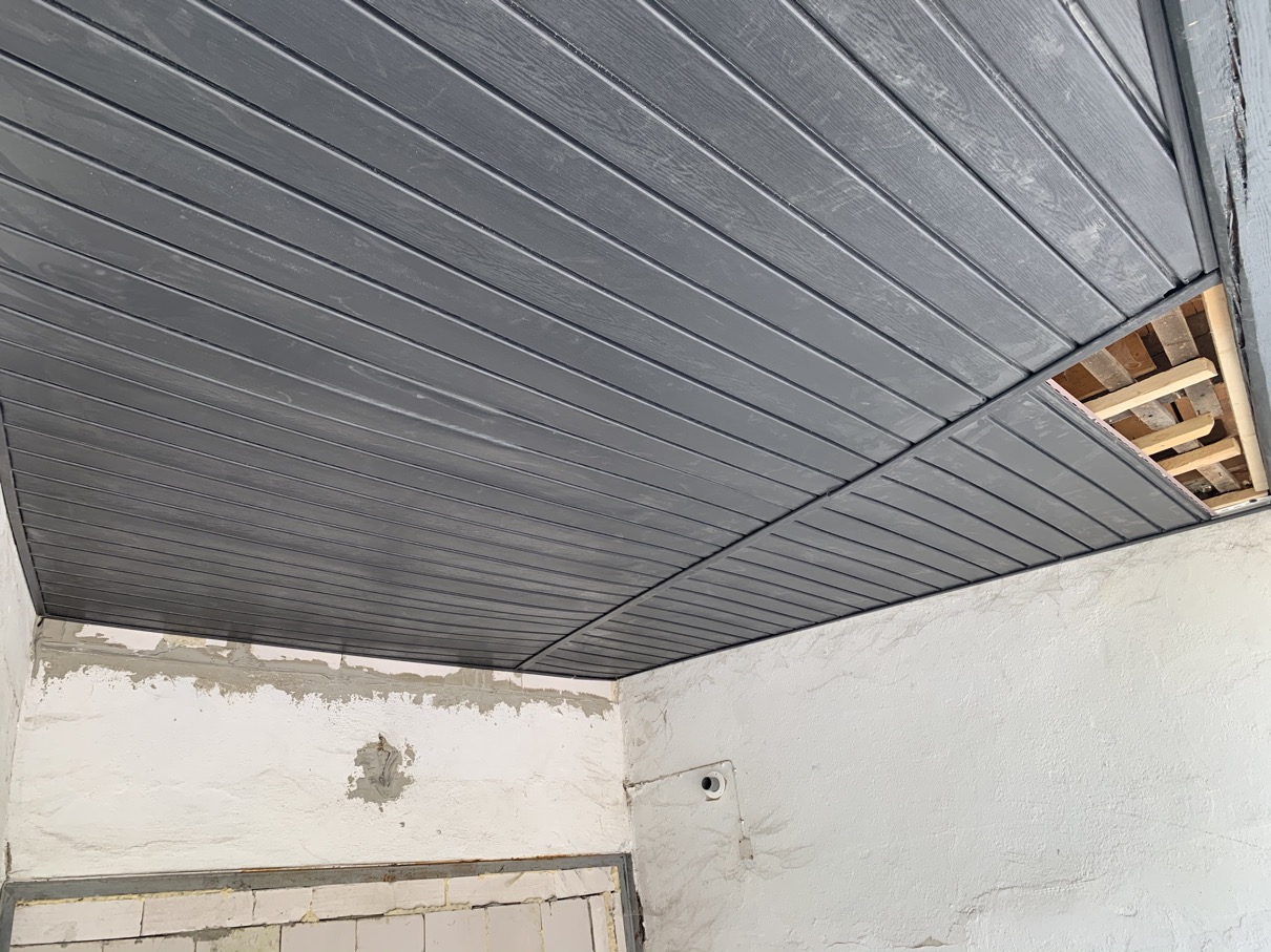 ----> mit dem "Eingangsportal" geht es weiter: hier muss der Sichtbalken abgeschliffen werden und dann anthrazit gestrichen werden (Anthrazit so wie das Dach, die Traufbleche und die Fensteraussenrahmen); danach wird dann 30er Anthrazit-Paneele im Portalbereich eingebracht. Jede Paneele muss mind. zweimal geschnitten werden, um in dieses unwillige Trapez Eingang zu finden - der Geduldsfaden ist gaaaaaaanz dünn (und zugegeben: einige Paneele haben den Segelschein erworben 😂).