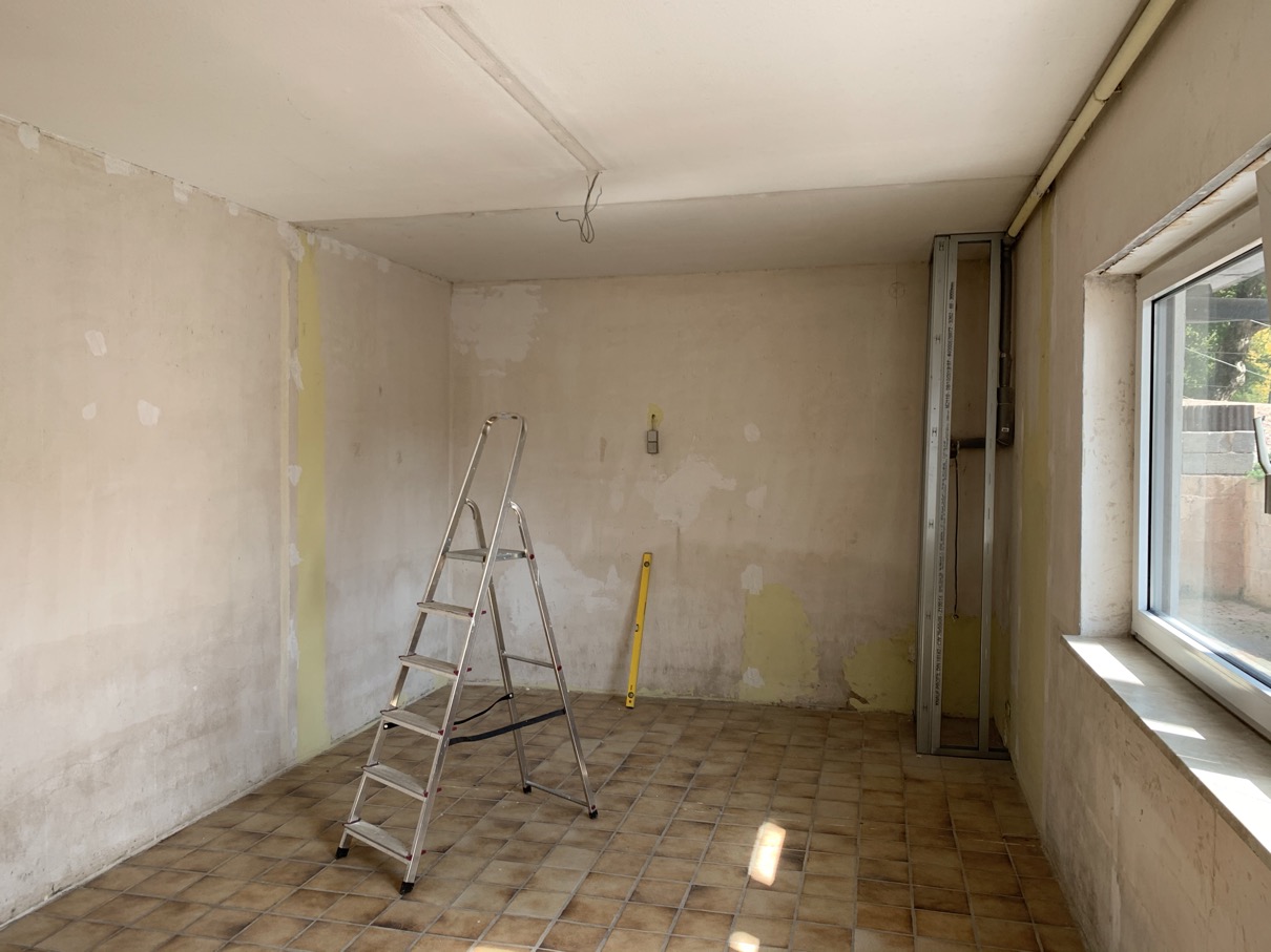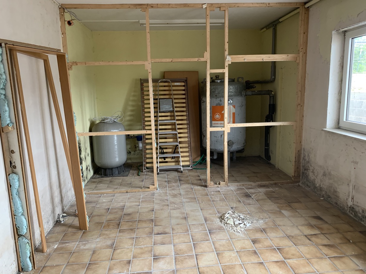 Ständerwand aus OSB- und Rigipsplatten zu zwei Kesselanlagen des stillgelegten Hauswasserwerkes (als noch eine funktionierende Quelle vorhanden war) kann raumvergrößernd entfernt werden. |