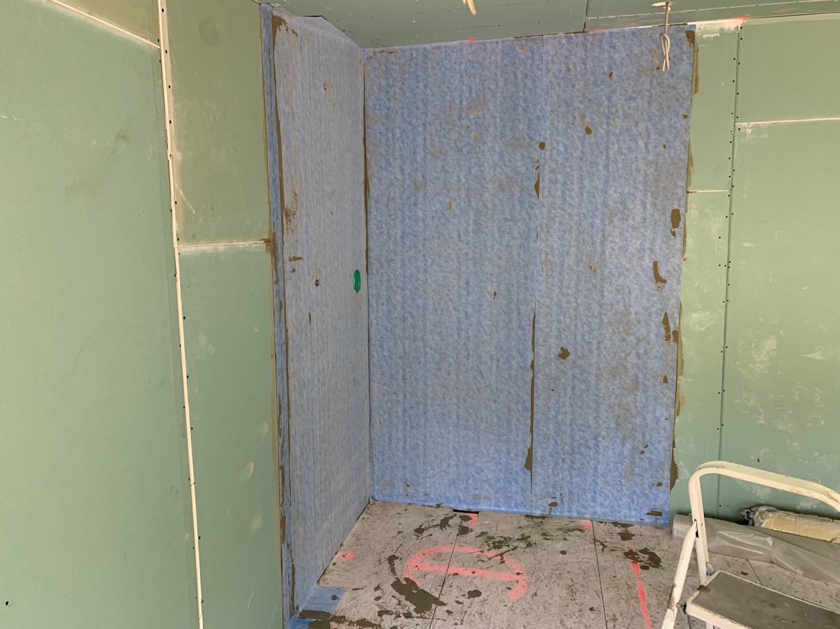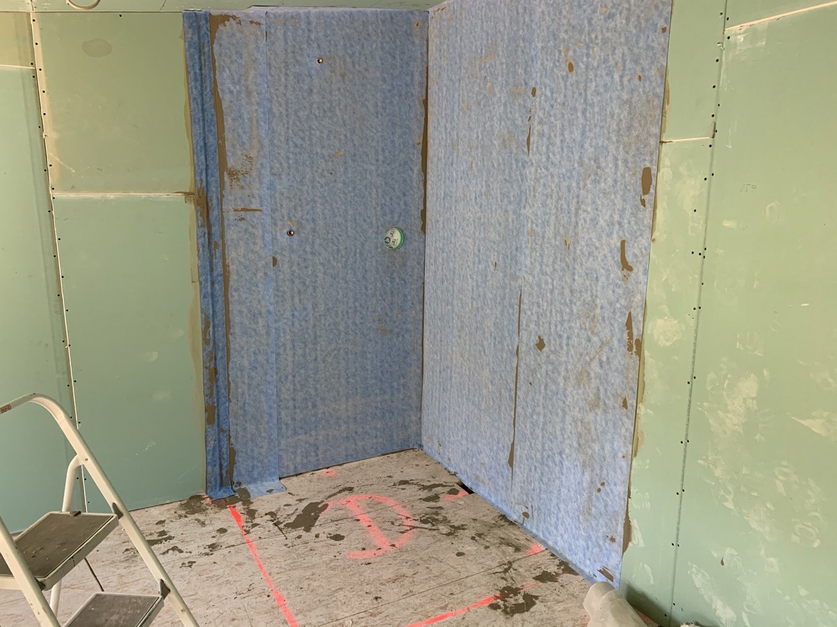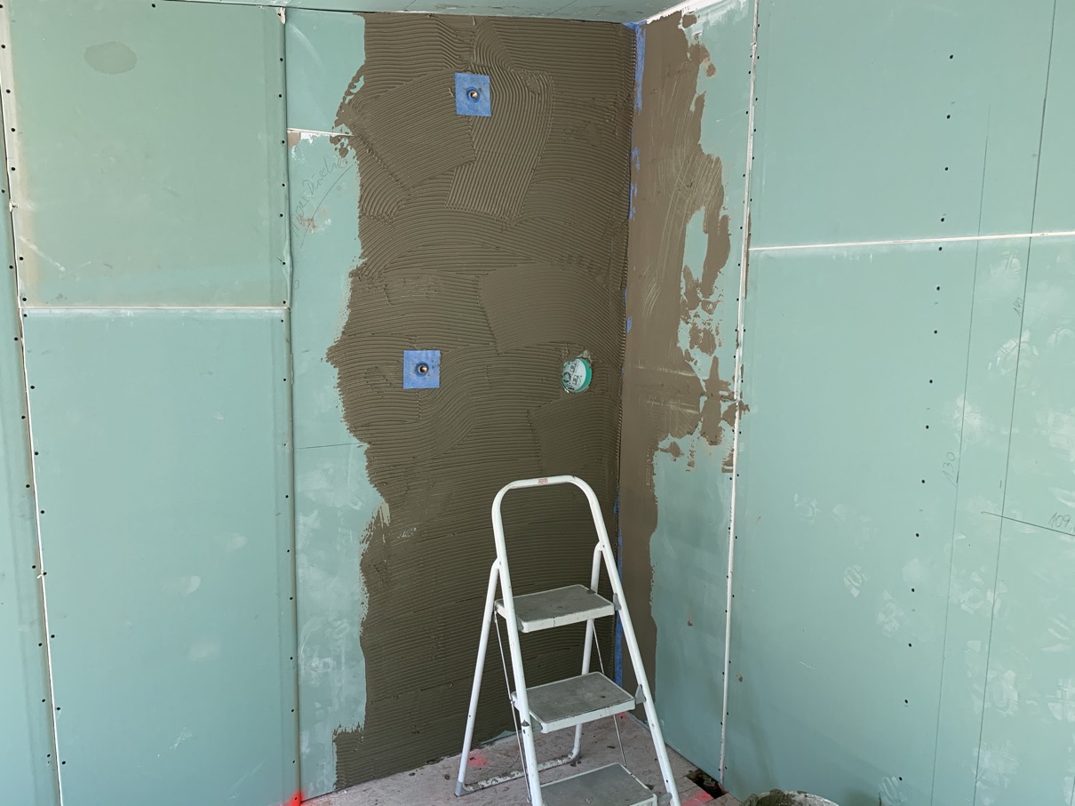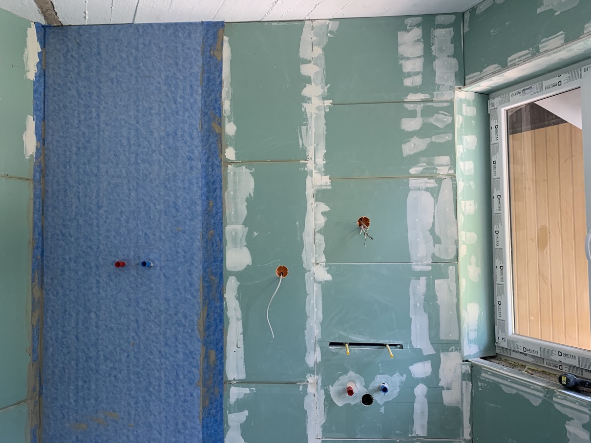 Später wird dann auch noch der Boden und die Bodenanschlüsse zur Wand nochmals mit einer Dichtbahn versehen 😊.