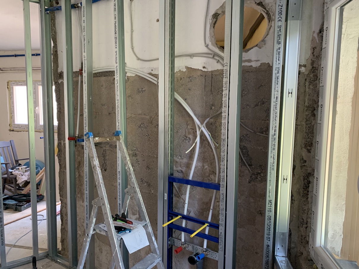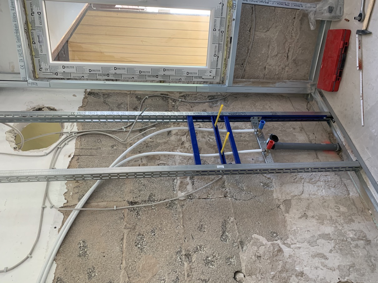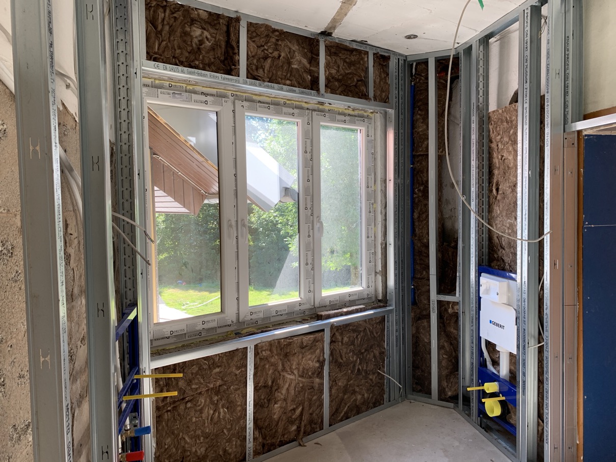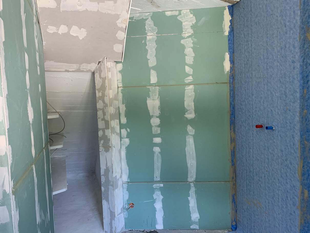 da war er wieder - mein geliebter Trockenbau; Profile anbringen, Waschbecken- und Toilettenvorrüstung, Isolation der Außenwand und natürlich Geräuschisolation der Fallrohre .... und dann kommt wieder der Gips - erst die eine Lage und dann die doppelte Beplankung (um nicht mit dem Material immer durch das Apartment laufen zu müssen habe ich erst die doppelte Beplankung im gesamten Bad außer der Trennseite zum Hauswirtschaftsraum gemacht).