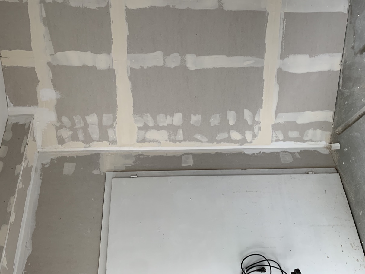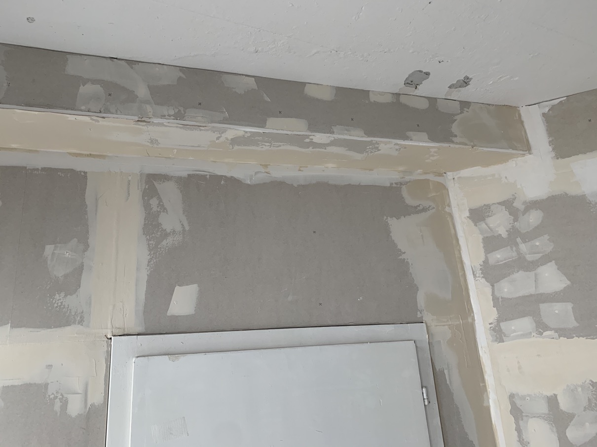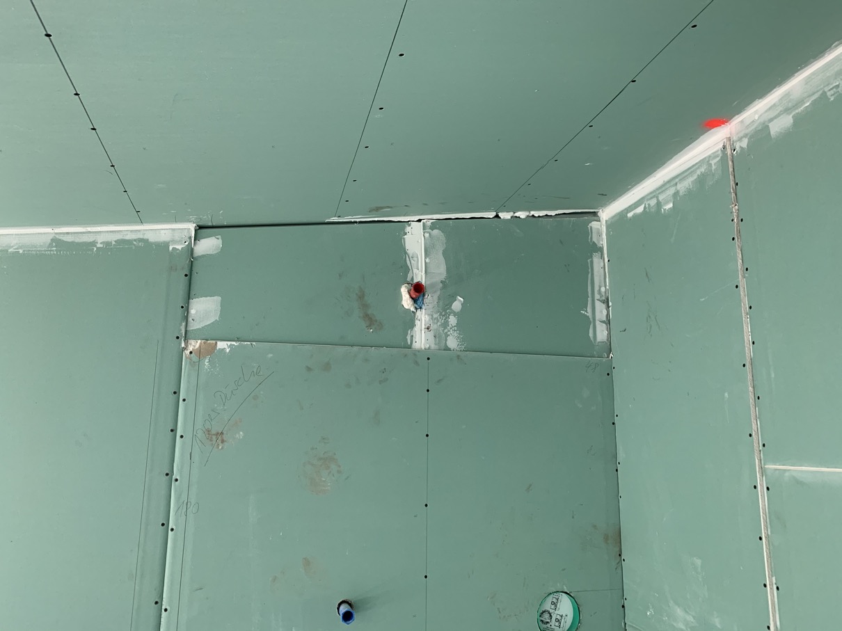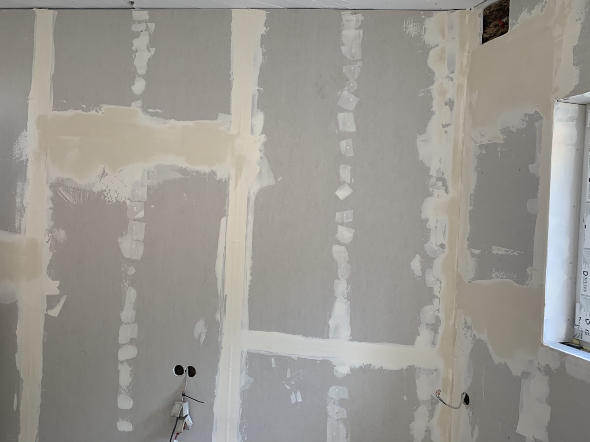 Schrauben vergipst, Kurt-Band in die Innenecken eingelegt und dann die Quer- und danach die Längsfugen vergipst. Damit ist die Qualitätsstufe Q1 erreicht. |
