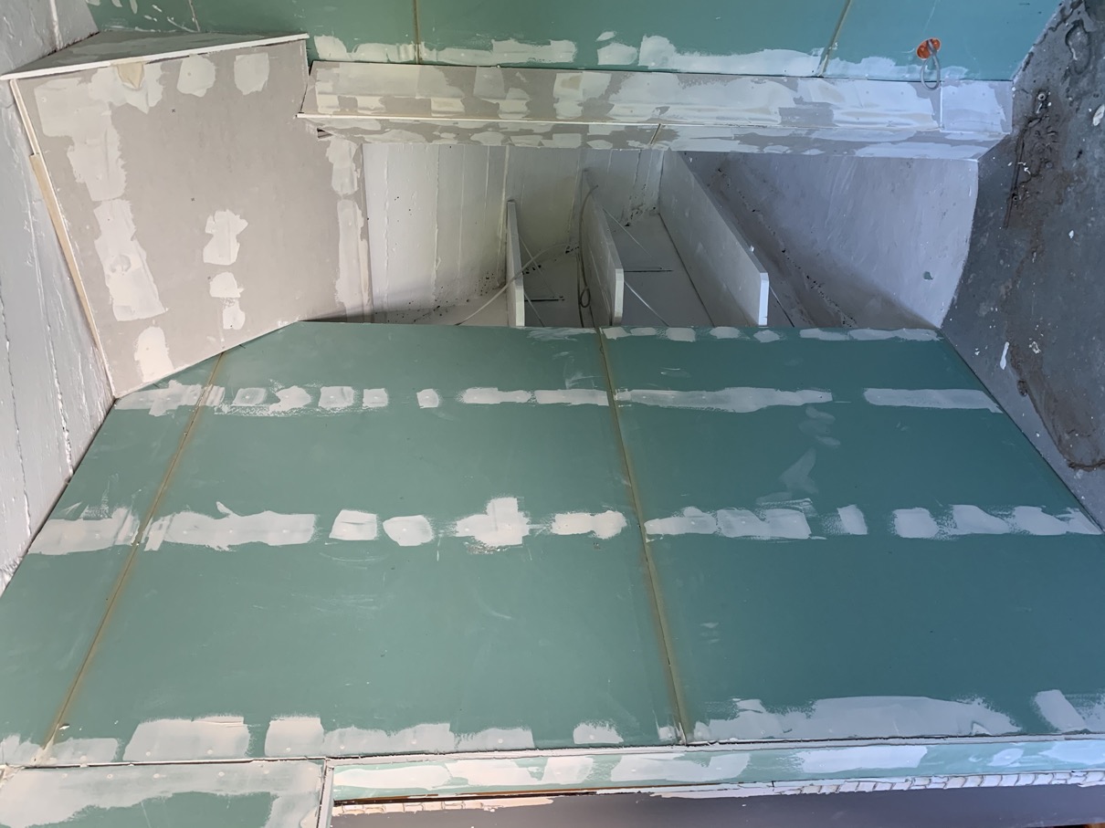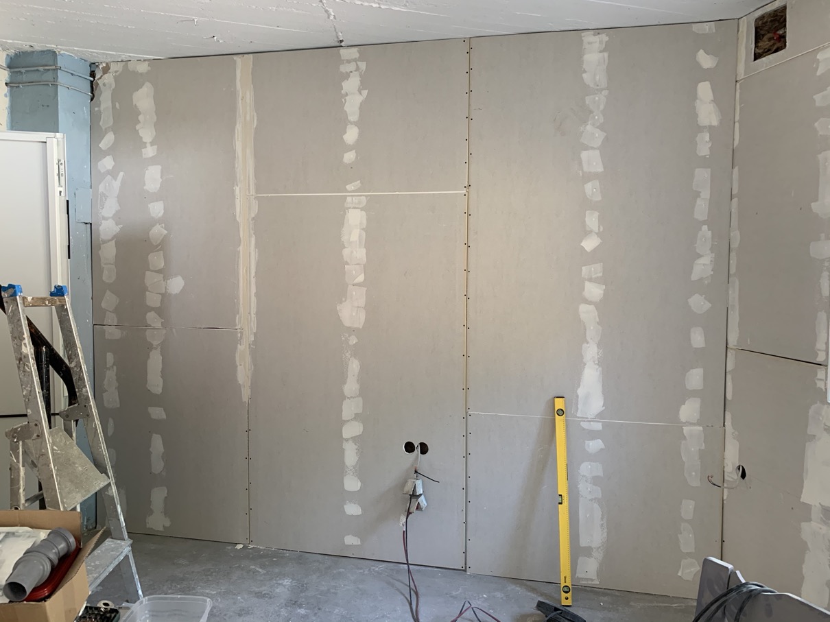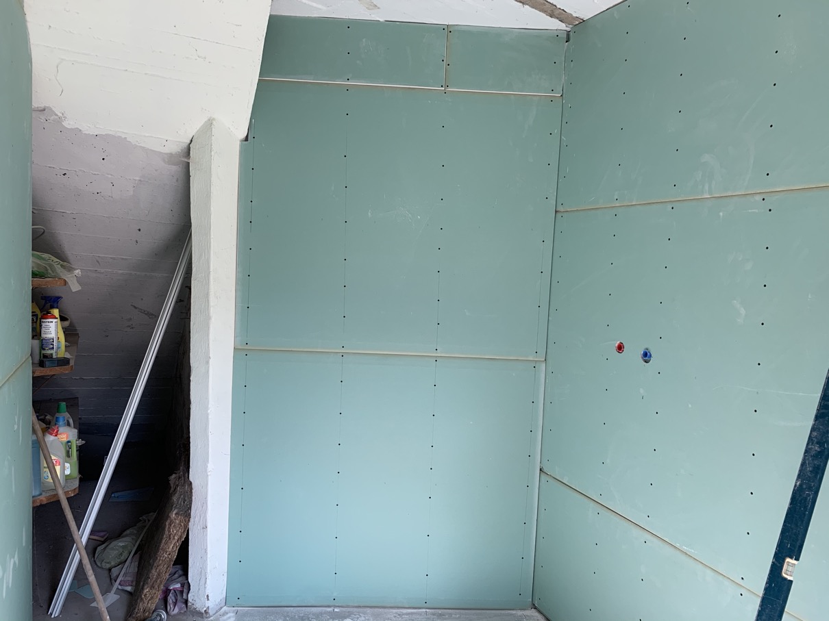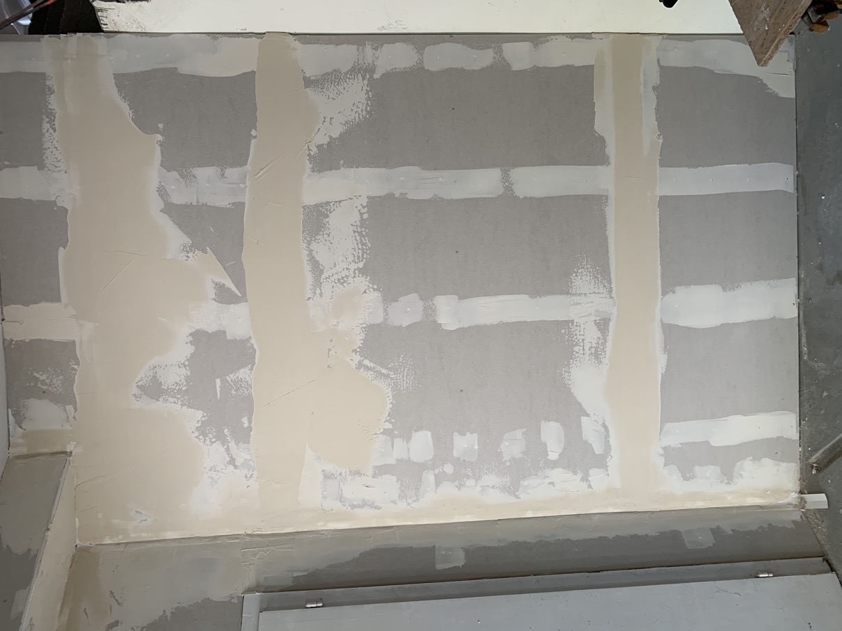 Schrauben vergipst, Kurt-Band in die Innenecken eingelegt und dann die Quer- und danach die Längsfugen vergipst. Damit ist die Qualitätsstufe Q1 erreicht. |