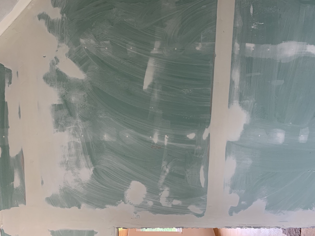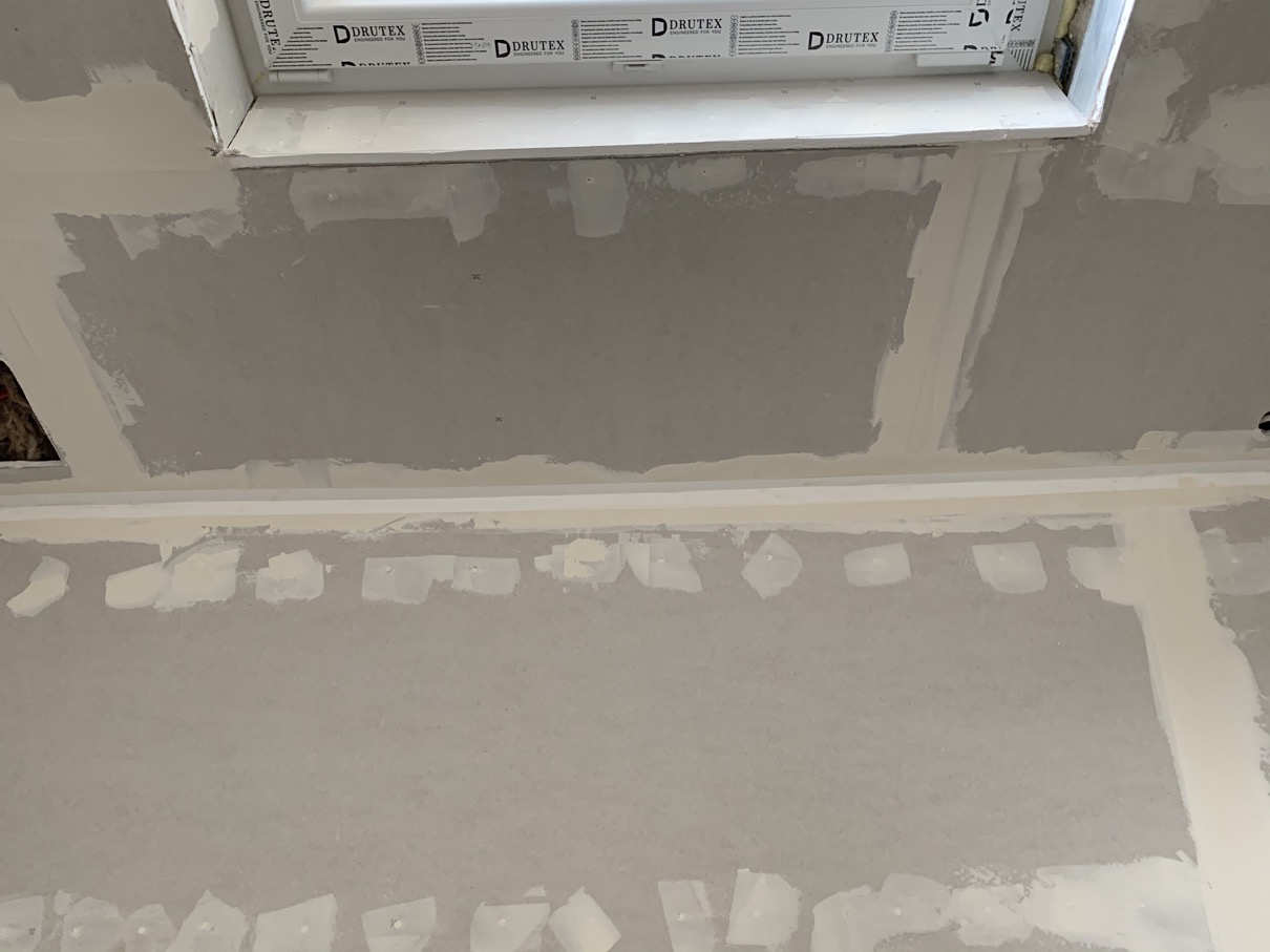 kommende Arbeiten (wenn alles getrocknet ist): zunächst die Querfugen ausspachteln und dann mit Armierungsband versehen und am nächsten Tag denn die Längsfugen füllen und ebenfalls mit Armierungsband versehen; erst dann kommen die Innenecken und die Fenster etc. |