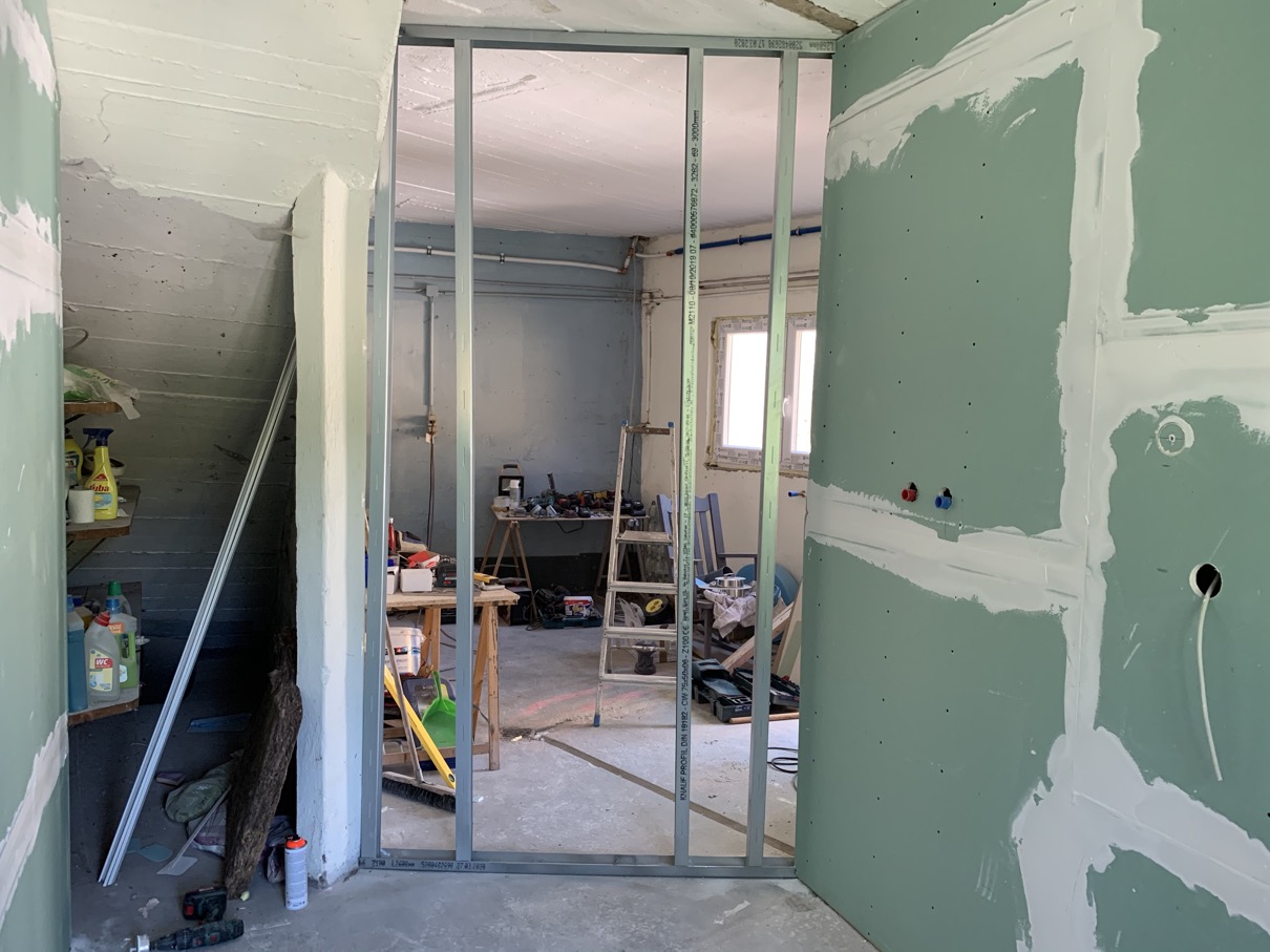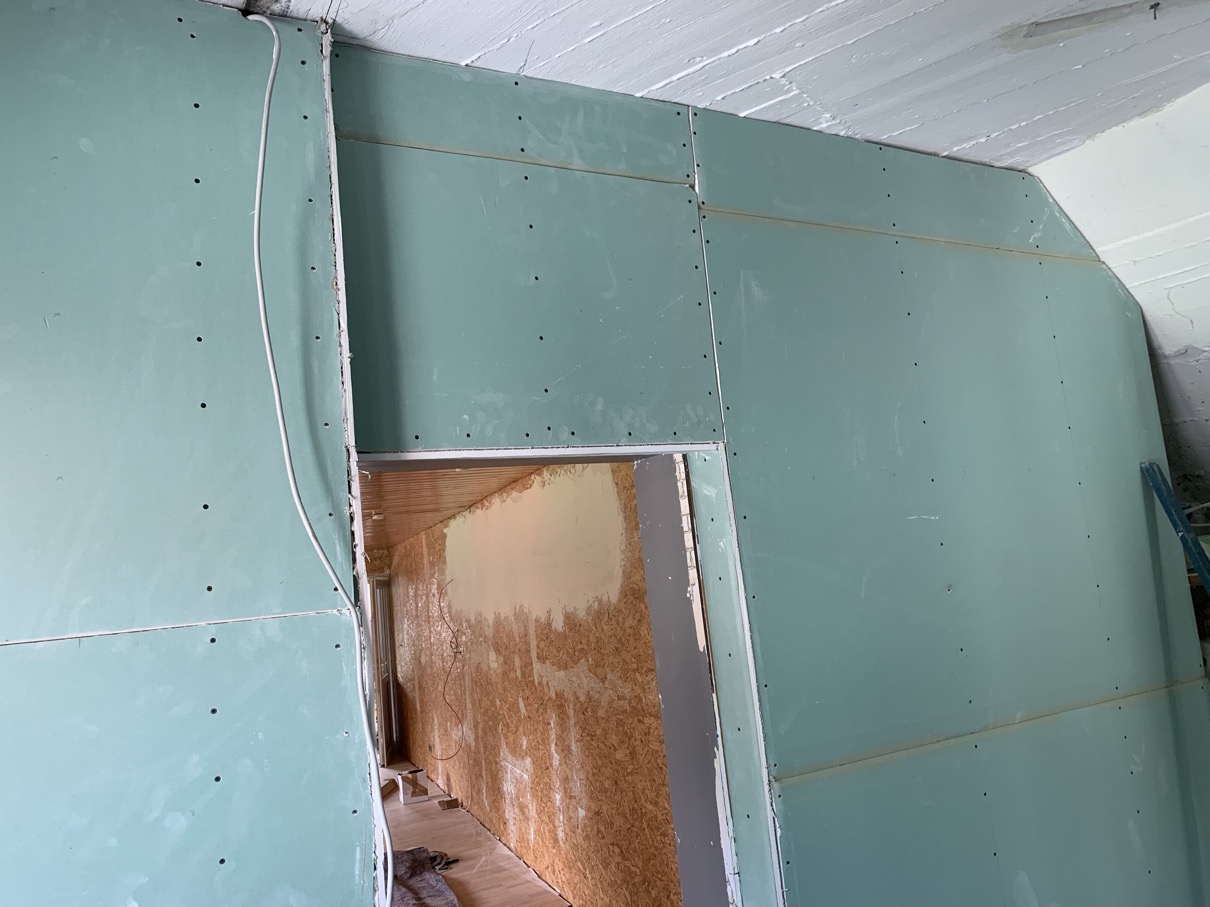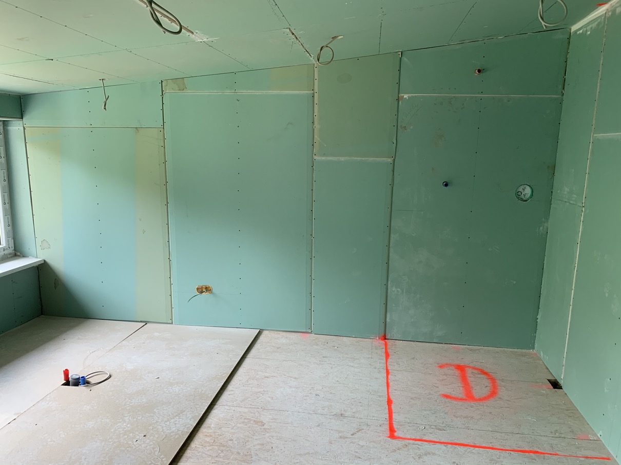 damit ist auch (jedenfalls offiziell) der Trockenbau in der gesamten Etage beendet; das Material, das noch im Hintergrund zu sehen ist ---> ja, der Kaminofen, der sicherlich nicht mehr aus dem Haus entfernt wird 😂 - war schwer genug, den in die Bude zu bekommen 😏.