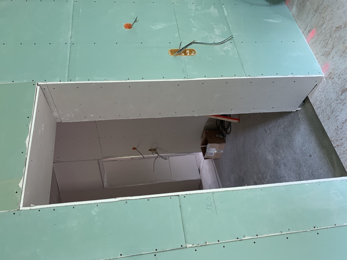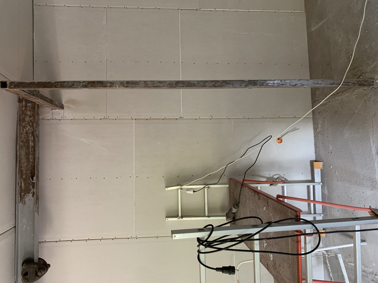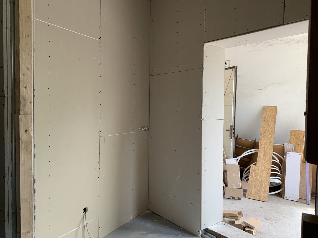 damit ist auch (jedenfalls offiziell) der Trockenbau in der gesamten Etage beendet; das Material, das noch im Hintergrund zu sehen ist ---> ja, der Kaminofen, der sicherlich nicht mehr aus dem Haus entfernt wird 😂 - war schwer genug, den in die Bude zu bekommen 😏.