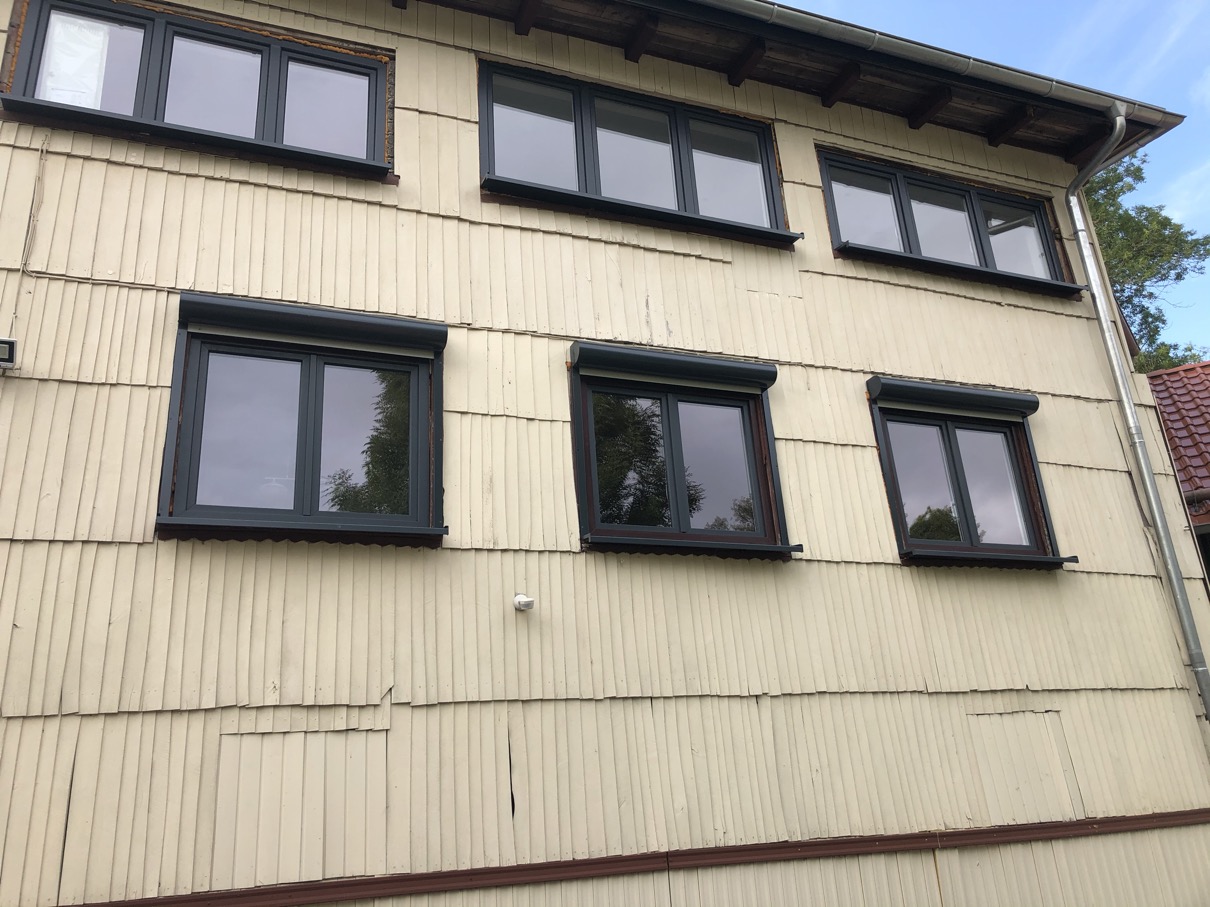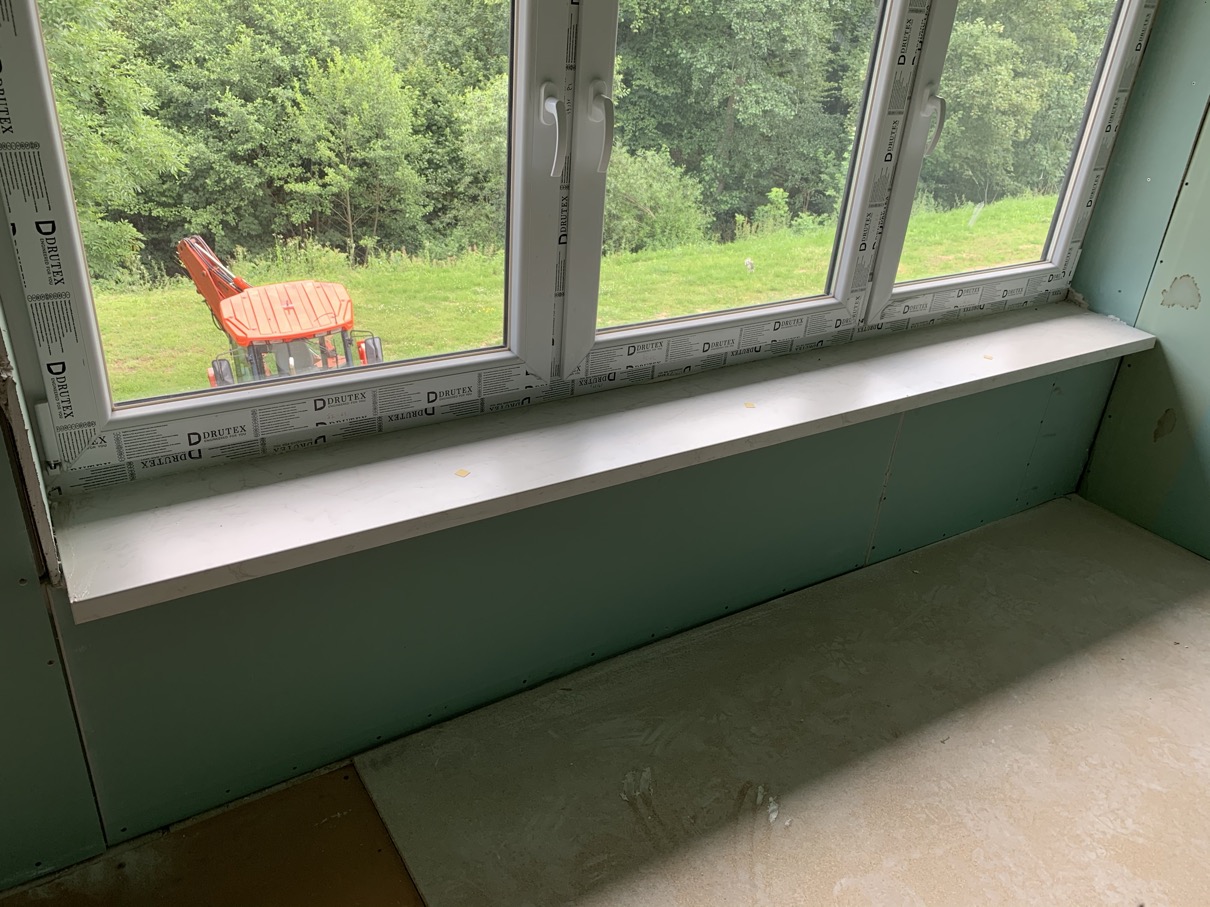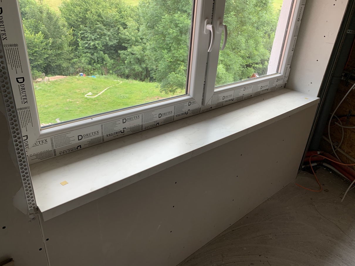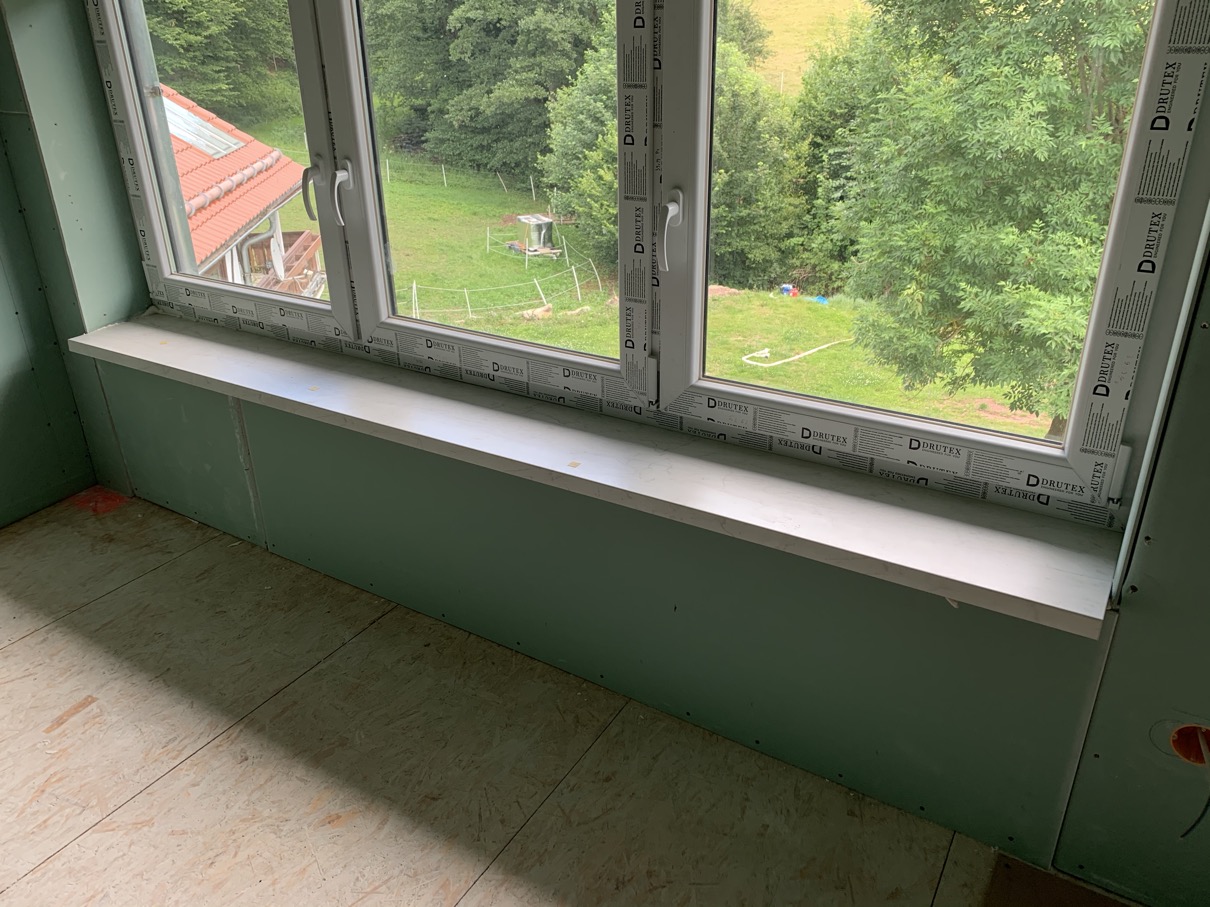 Zwischenzeitlich sind auch die Fensterbänke (Werzalit) angeliefert worden .... und eingebaut -> hier nur mal ein kleiner Ausschnitt der 13 zu setzenden Fensterbänke: