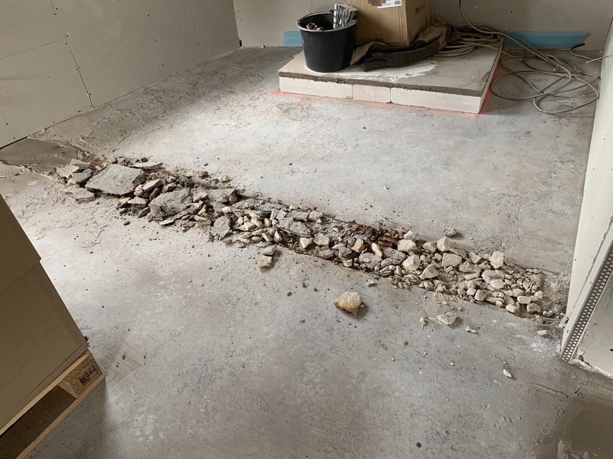 ... und weiter mit den Restarbeiten .... -> der Übergang vom Wohnzimmer zur Kaminecke hat Aufschüttungen im Fußboden, die entfernt werden müssen; hier muss der Bohrhammer helfen: