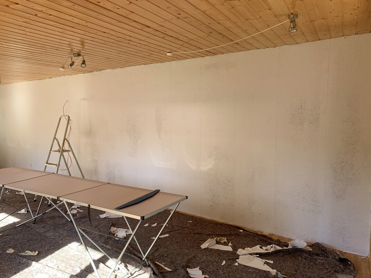 ... wenn ich schon mal die Tapete und den Kleister an den Händen habe ... noch schnell ein paar "Fetzen" im ehemaligen Mitarbeiter-Aufenthaltsraum angebracht 😂; die bisherige Raufaser musste teilweise wegen Schwarzschimmel entfernt werden 😡.