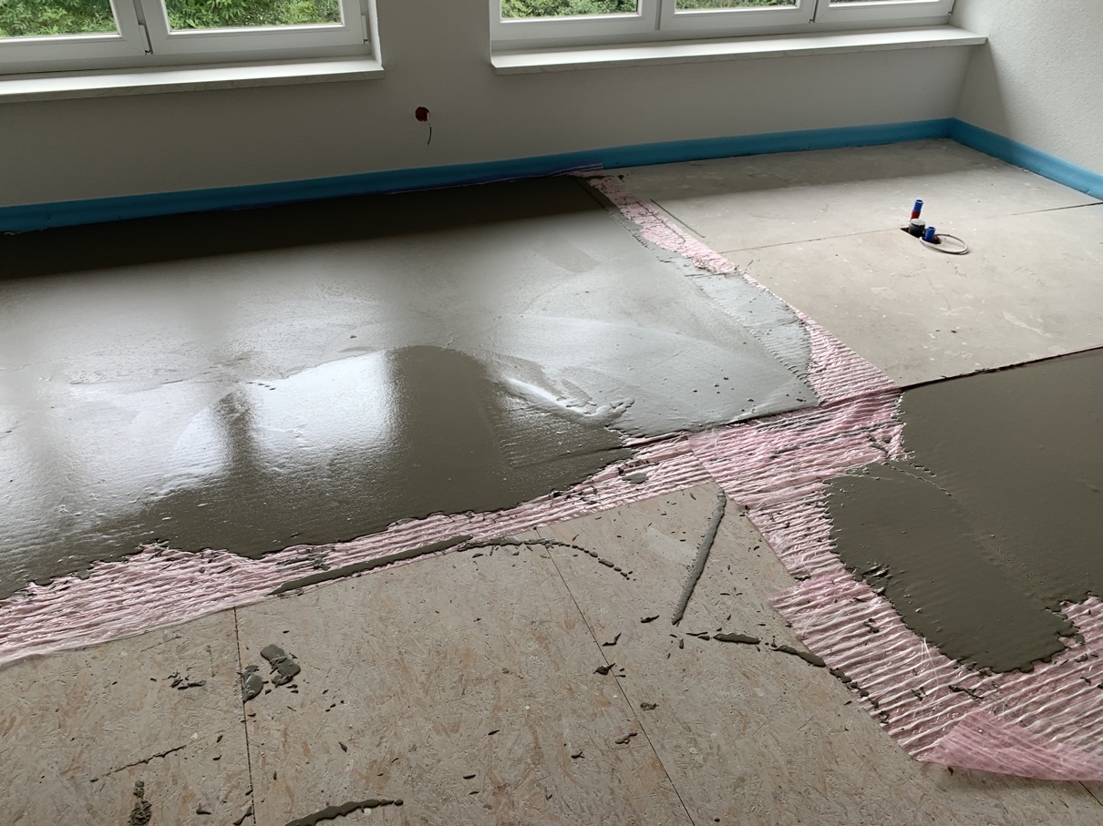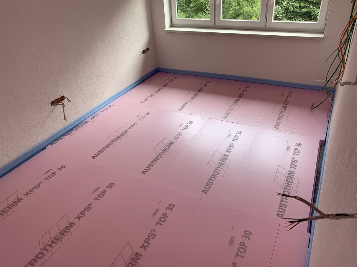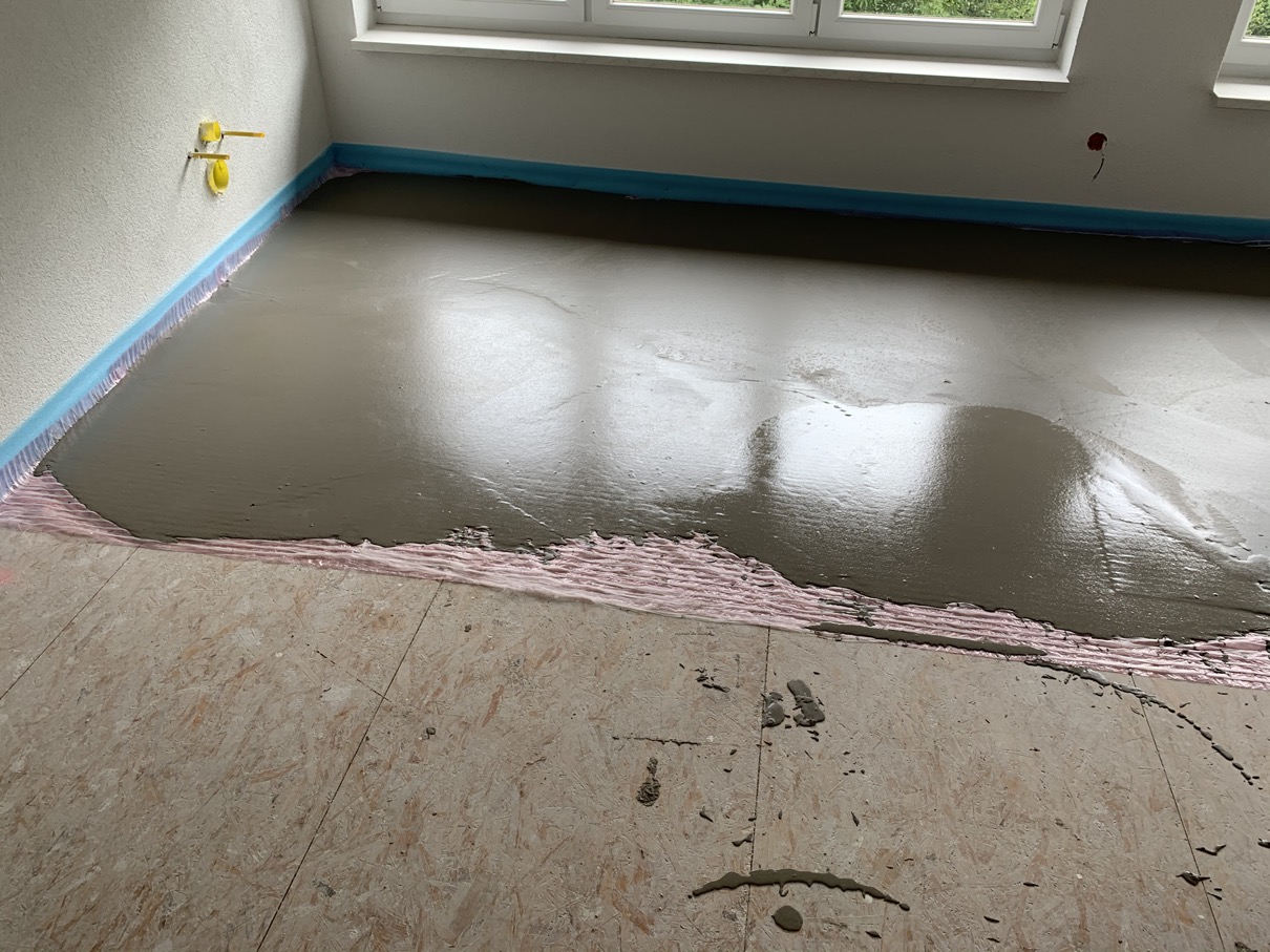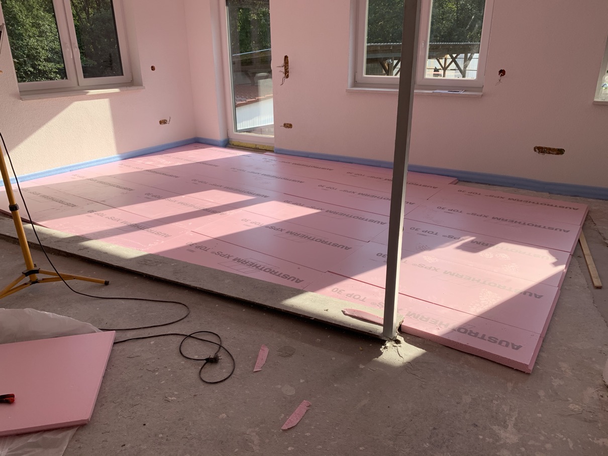 Nachdem ich den kompletten Boden mit der Isolierung ausgelegt hatte habe ich beim darüberlaufen ziemliche "Absätze" festgestellt, die sich m.E. auch nach den Platten für die Fußbodenheizung und den darüber liegenden Trockenestrich nicht bereinigen lassen .... also teilweise wieder ausbauen und mit Fließestrich ausfüllen ...->