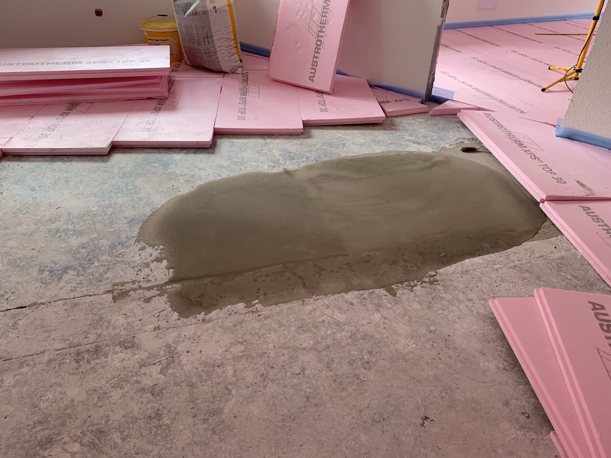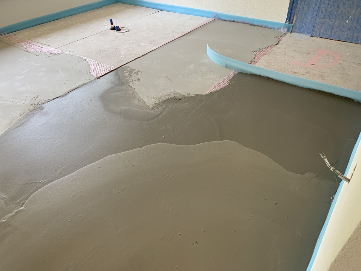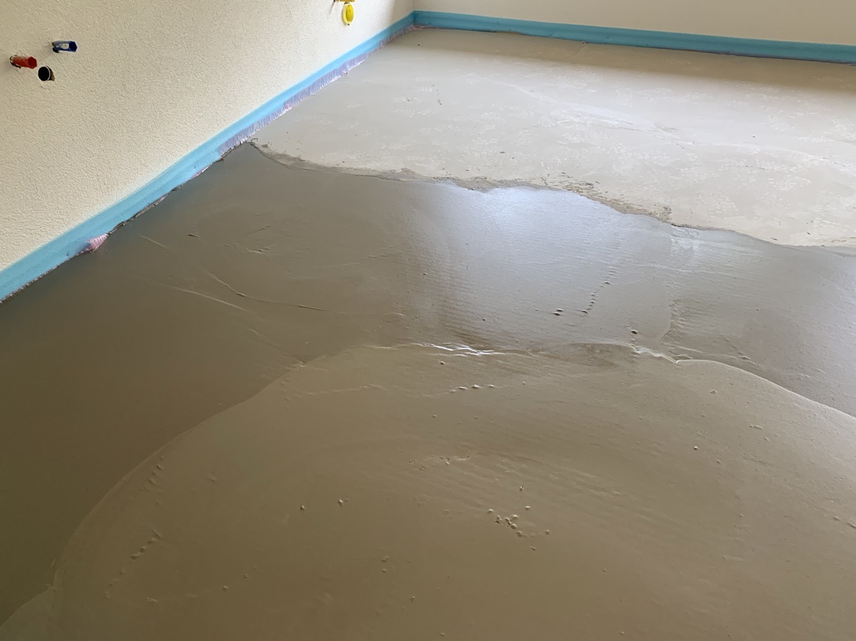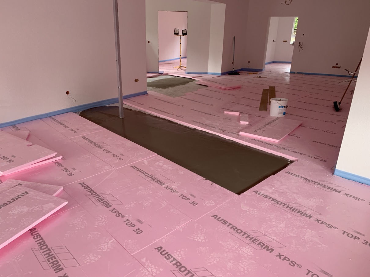 Nachdem ich den kompletten Boden mit der Isolierung ausgelegt hatte habe ich beim darüberlaufen ziemliche "Absätze" festgestellt, die sich m.E. auch nach den Platten für die Fußbodenheizung und den darüber liegenden Trockenestrich nicht bereinigen lassen .... also teilweise wieder ausbauen und mit Fließestrich ausfüllen ...->