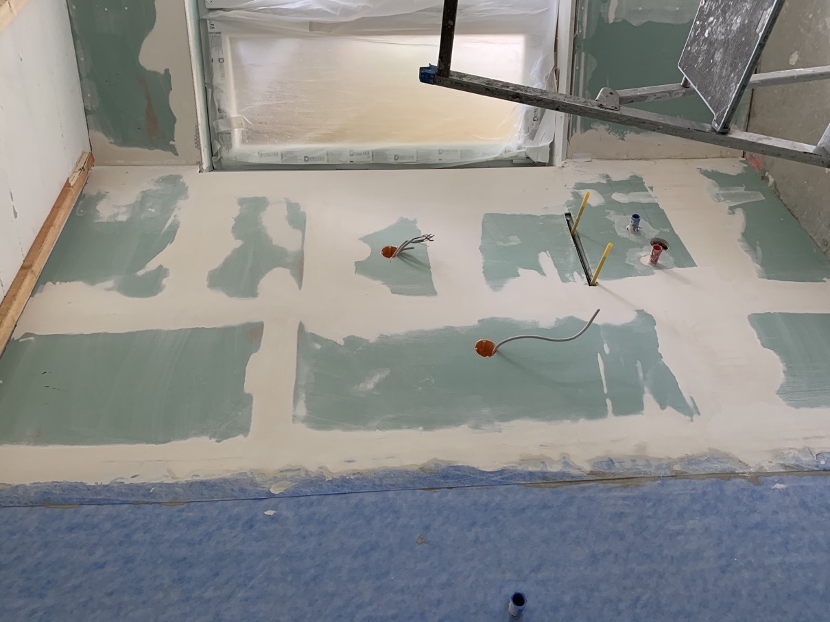 Jetzt geht es wieder in den UG-Bereich: es muss noch das Vlies im Bad eingeklebt werden und dann, da im UG-Bereich die Putzarbeiten von mir durchgeführt werden, zunächst alle Schraublöcher verschlossen werden: