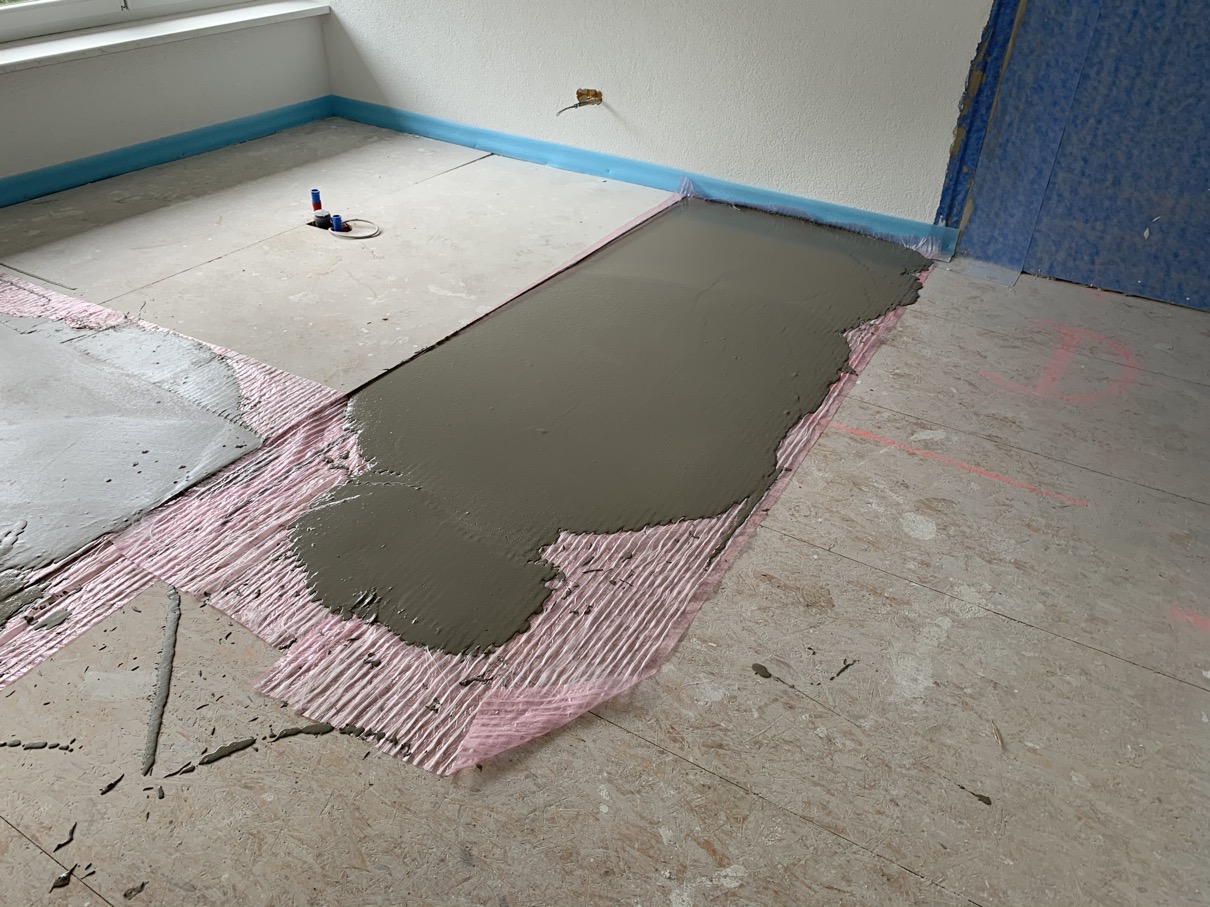 Im Bad nunmehr das noch fehlende Material besorgt, um den Boden auszugießen und damit die Schwingungen des Holzbodens zu reduzieren:
