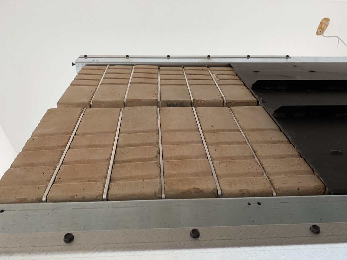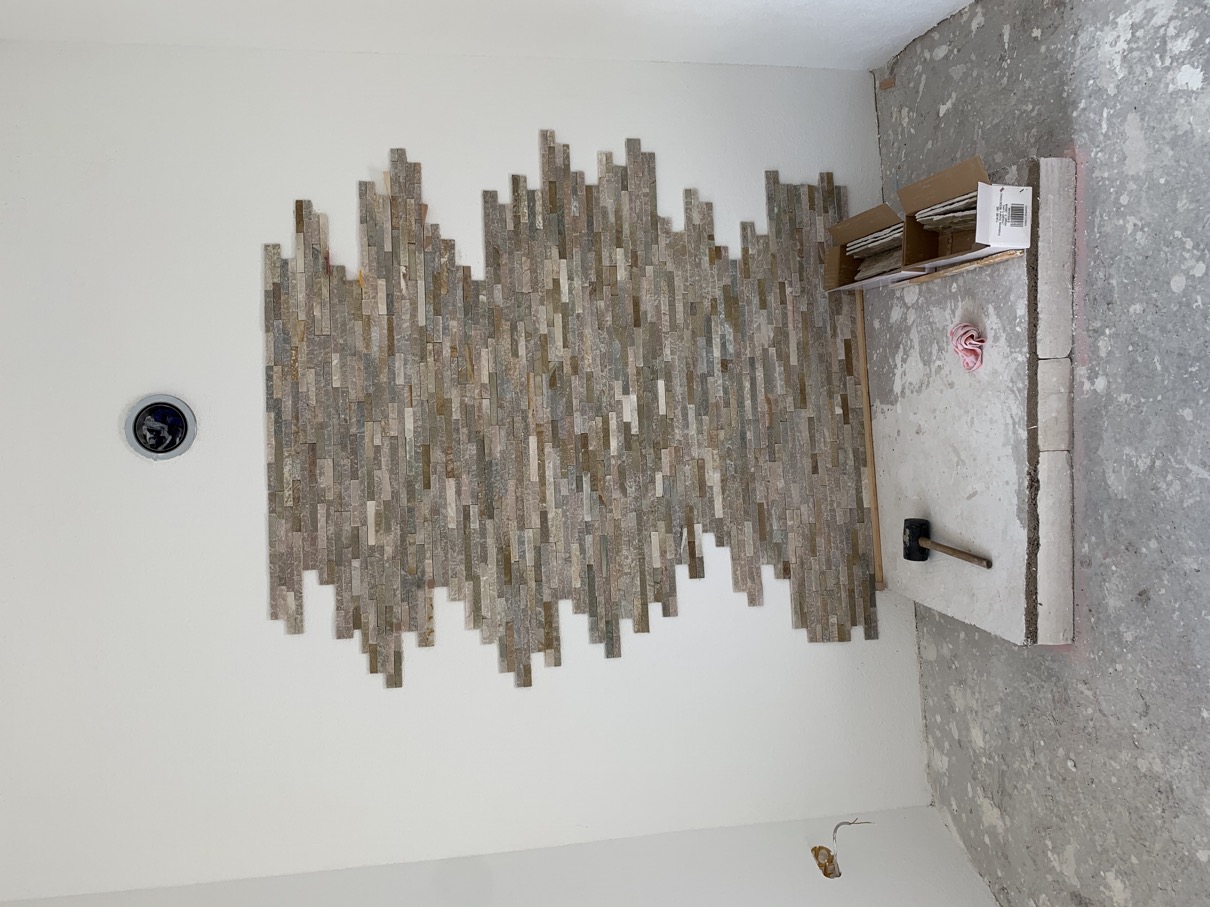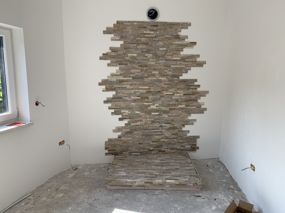 Naturstein in Weißkleber gesetzt - hier aber auch wieder zu wenig Material (diesmal waren 10 kg Weißkleber nicht genug), um bis zum Ofenrohreinlaß zu kommen. Es fehlen noch zwei Reihen - wird wohl am kommenden Wochenende erledigt werden können.