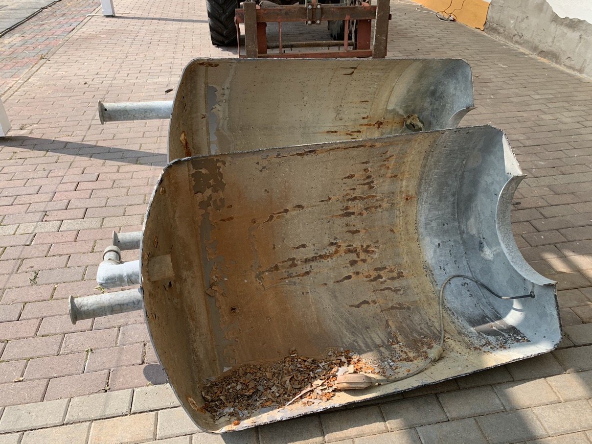 in zwei "tragbare" Hälften geschnitten (gut, waren trotz Plasmaschneider rd. 3 Std. Arbeit), dann ins Freie geschleppt und mit dem Traktor vorgezogen, damit unser Schrotti den "Müll" abholen kann. |