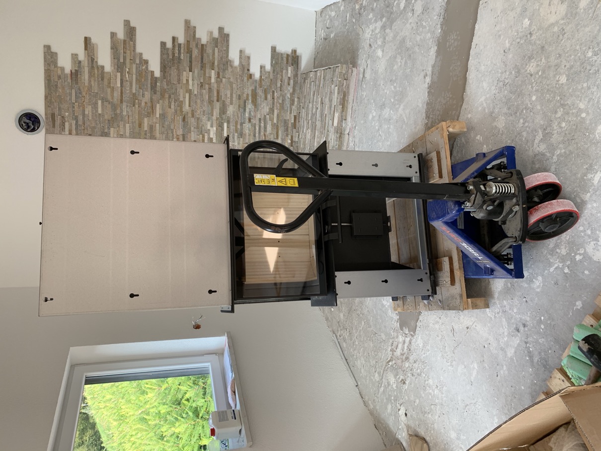 und wofür das Ganze? Na, damit der Heizkamin darauf Platz finden kann - nur müssen eben erst mal über 300 kg irgendwie da hin transportiert werden (gut, dass er schon mal im Raum stand) .... mit einem Hubwagen geht das sodann natürlich .....