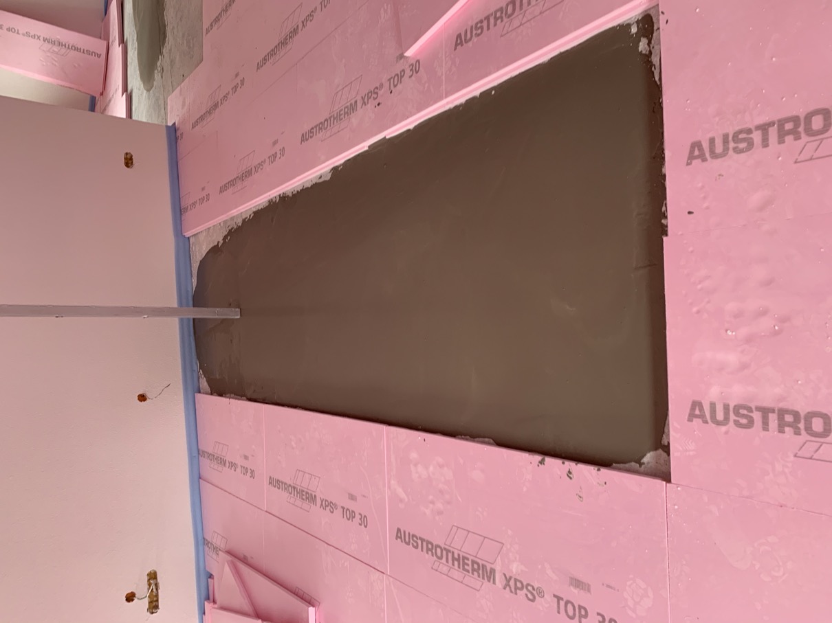 Sodann habe ich mir nochmals unser künftiges Bad angesehen - die Stirnseite hat mir zum Fensterabschluss einfach nicht gefallen, da hier ein Versatz war, der auch nicht verspachtelt werden kann; der Versatz zum Fenster beträgt 1,30 cm -> also noch eine Platte davor setzen, jedenfalls bis zur geplanten Dusche. Zudem haben wir das "Endmaß" der Dusche verändert, so dass ich auch den künftigen Duschkopf nochmals ein wenig nach rechts versetzen musste (sonst wäre er nicht mittig gewesen - sähe blöd aus ......). Und wenn man (also ich) schon mal dran ist, kann auch noch die Türlaibung erstellt werden, da mal eine Schiebetüre das Bad zieren soll.
