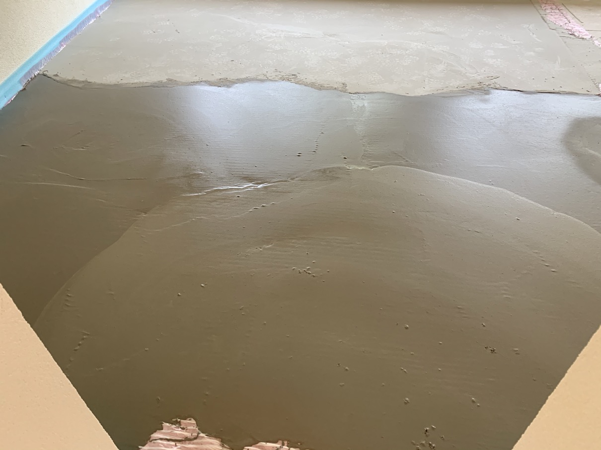 Wieder jede Menge Baumaterial bestellt, das auch schnell angeliefert worden ist - also kann damit begonnen werden, die Bodenunebenheiten und das Gewippe des Holzbodens im Bad ein wenig zu nivellieren. Das Ganze mit spezieller Nivelliermasse mit entsprechendem Armierungsgewebe darunter: