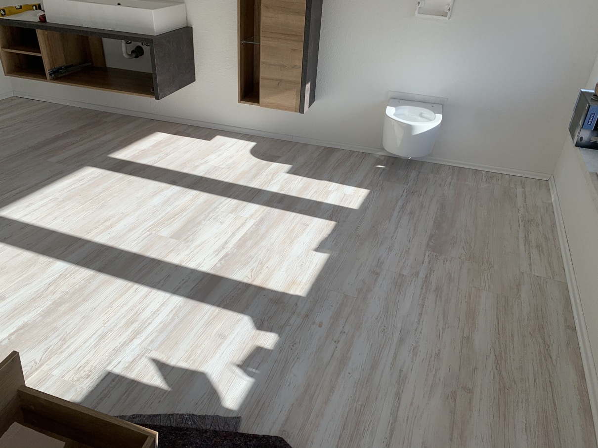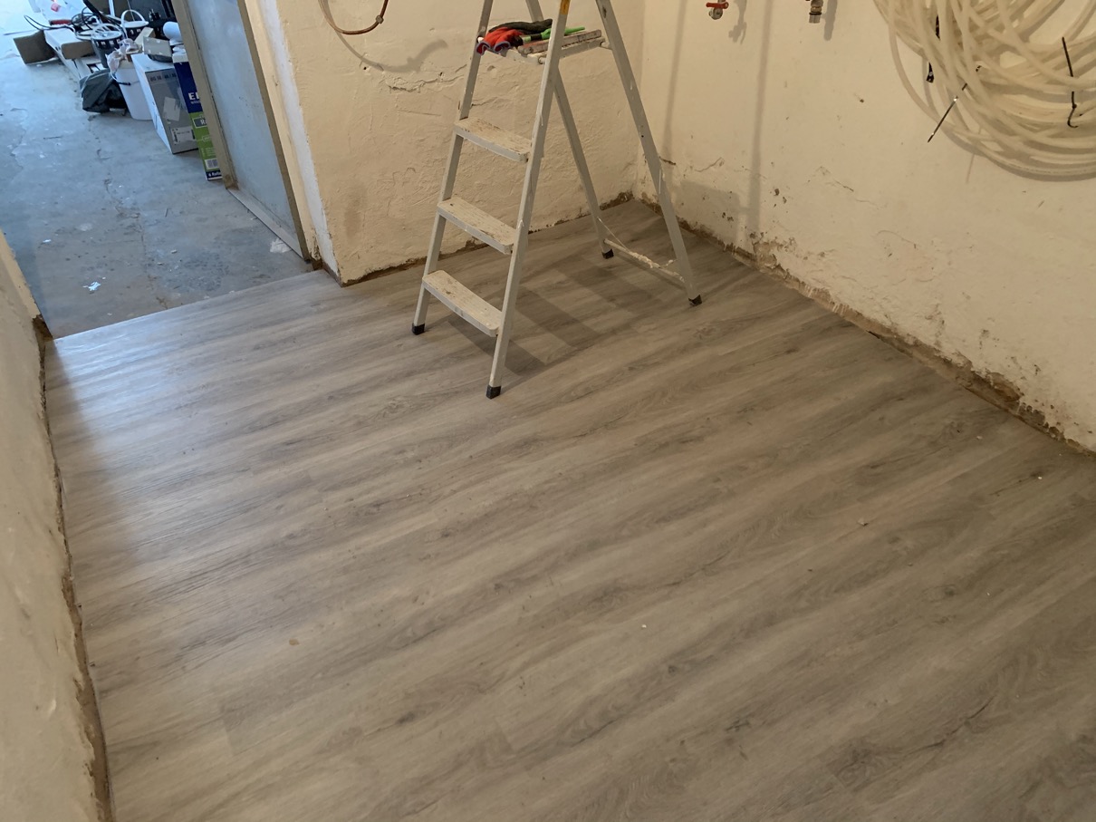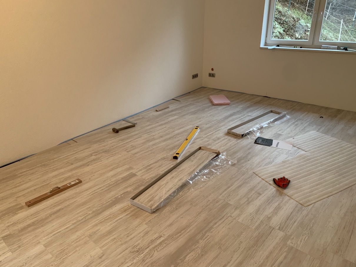 b) Samstag dann voll motiviert gestartet und den Boden im Heizungskeller mit Vinyl (gleicher Bodentyp wie Wäschekeller und Vorratsraum) verlegt: