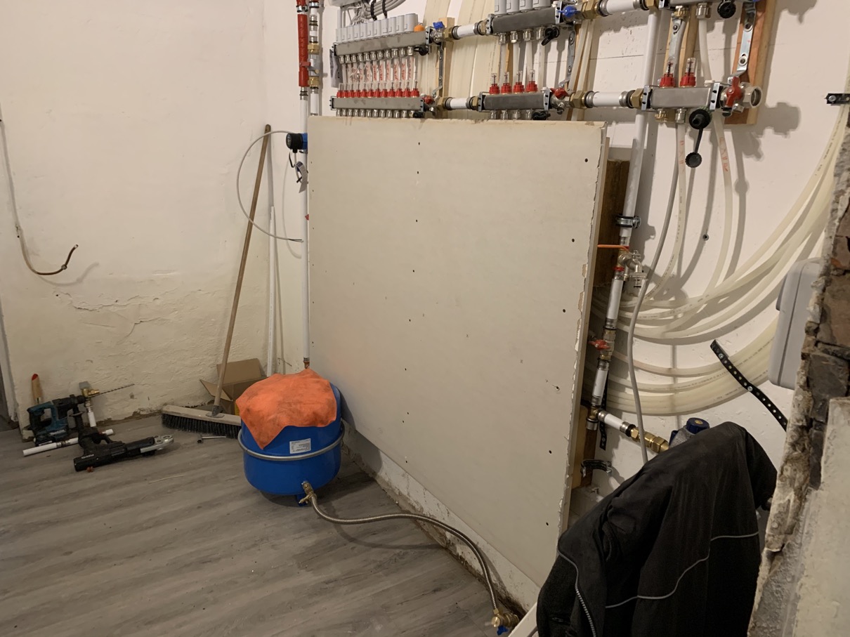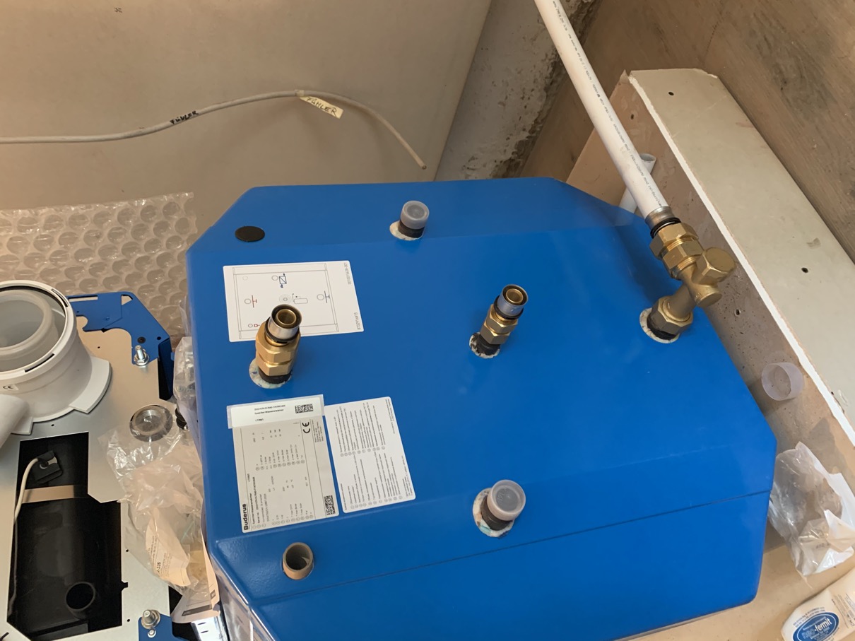 - Vorbereitung Heizungseinbau (also Verrohrung der Kaltwasserzuleitung und der Warmwasser-Zirkulationsleitung); alle Teile sollten nunmehr vorhanden sein.