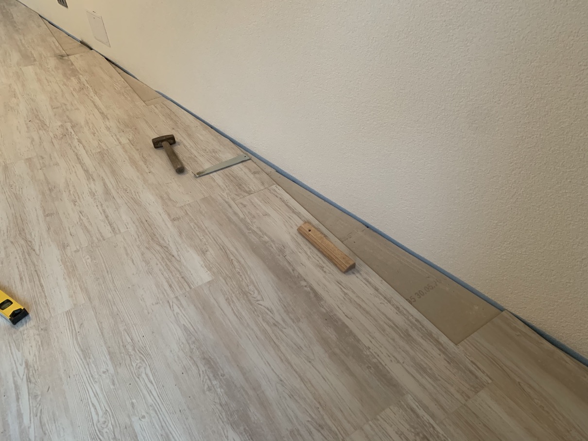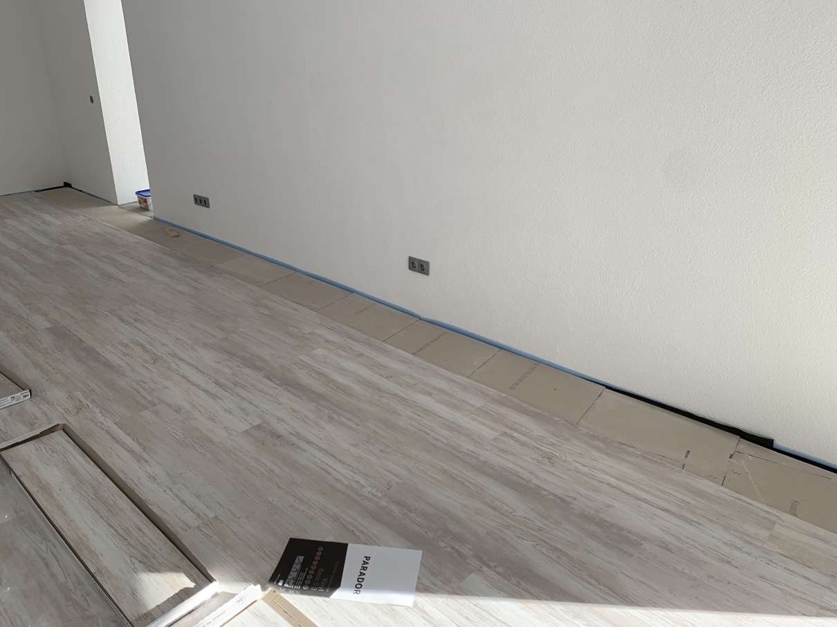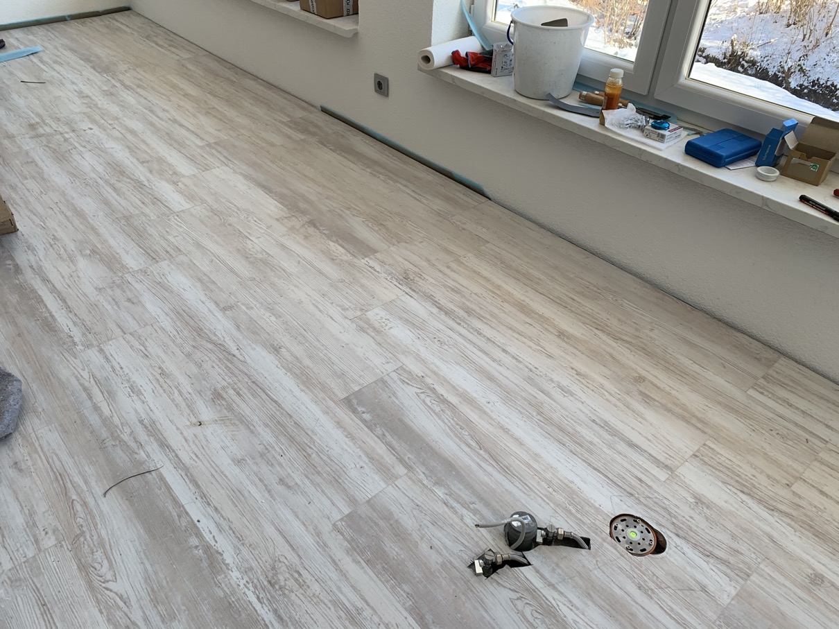 Dadurch, dass alles im Verbund gelegt ist und dieser Parador-5.3-Vinyl sich nicht auch nur 1/100stel mm biegen lässt und jeder Versuch, eine Paneele mit dem Hauholz in die Verriegelung zu bringen mit zerstörter Paneele endete habe ich irgendwann entnervt aufgegeben (genau genommen nach rd. 10 zerstörten Paneelen).