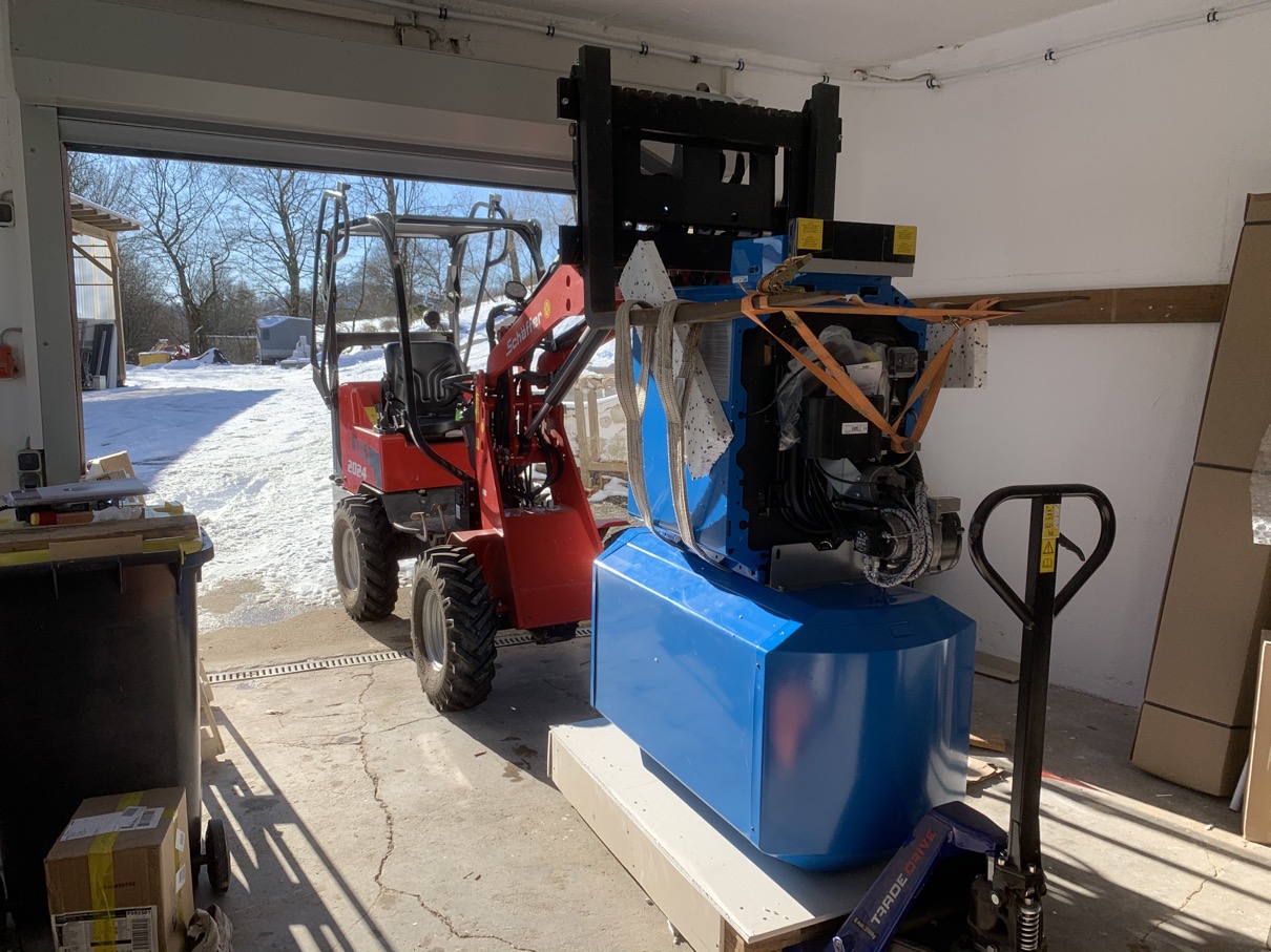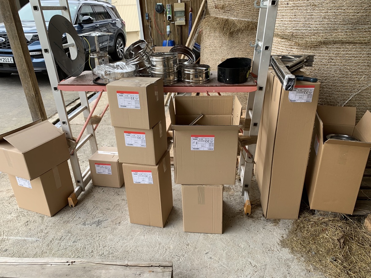 In einem zweiten Schritt will ich dann den 192-Kg schweren Kessel mit Hilfe unseres Hofladers auf seiner Einwegpalette neben den Warmwasserkessel auf entsprechende Höhe bringen und sodann auf den Warmwasserkessel ziehen .... ob das klappt: keine Ahnung, wird nächste Woche versucht.