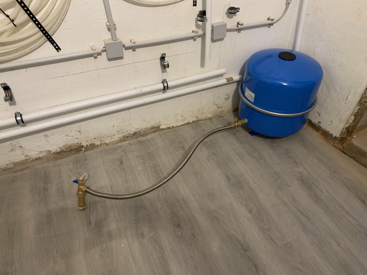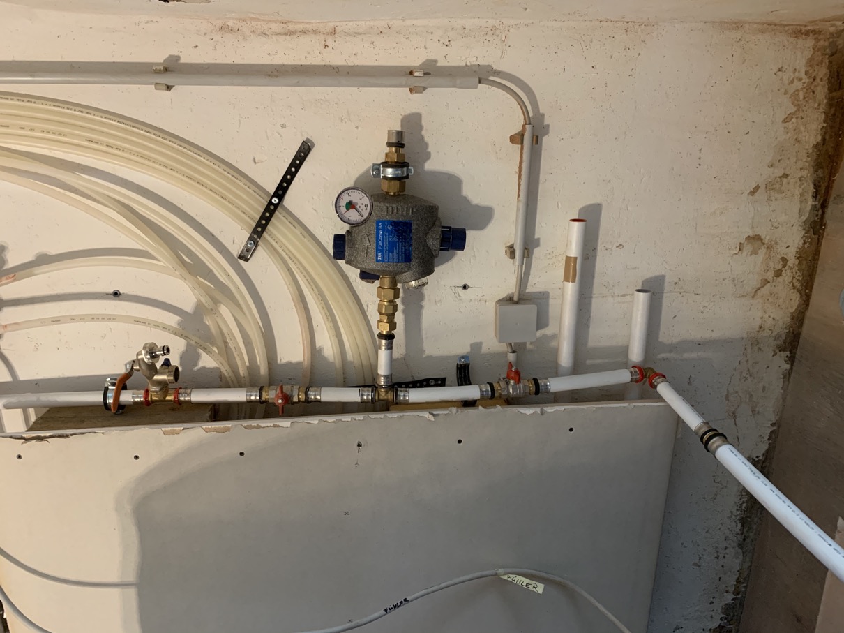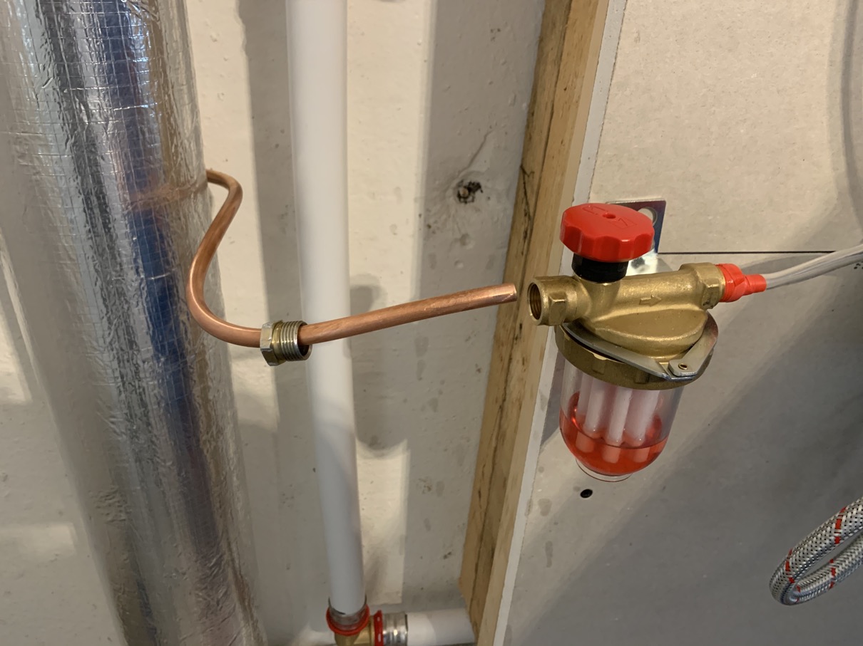 Nächster Schritt -> Druckprobe des Warmwassers-Systems -> Kessel gefüllt, Umwälzpumpe in Betrieb - alle Stellen im Haus kontrolliert -> in Marc-Andrés Bad ist die Kartusche undicht; Wasser wieder raus aus dem System und Kartusche mit neuer Dichtung wieder verschraubt; same procedure again ---> diesmal alles dicht und hält auch den Druck.
