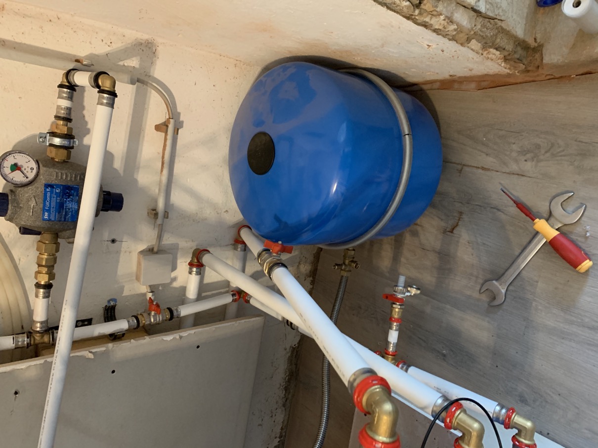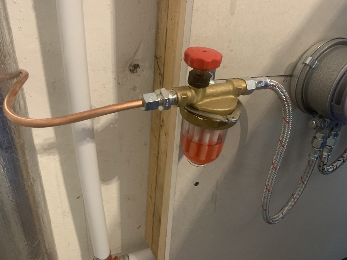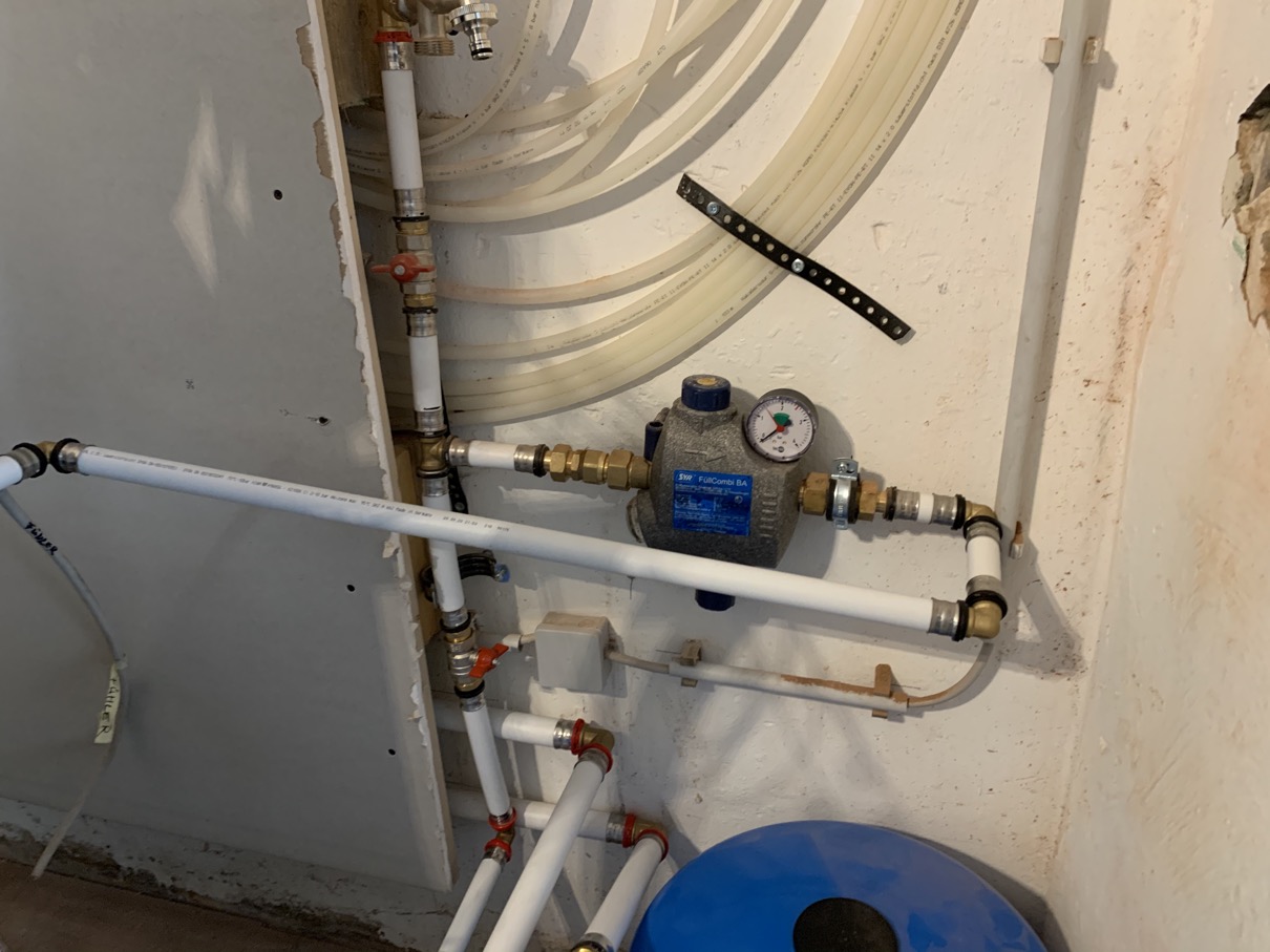 Nächster Schritt -> Druckprobe des Warmwassers-Systems -> Kessel gefüllt, Umwälzpumpe in Betrieb - alle Stellen im Haus kontrolliert -> in Marc-Andrés Bad ist die Kartusche undicht; Wasser wieder raus aus dem System und Kartusche mit neuer Dichtung wieder verschraubt; same procedure again ---> diesmal alles dicht und hält auch den Druck.