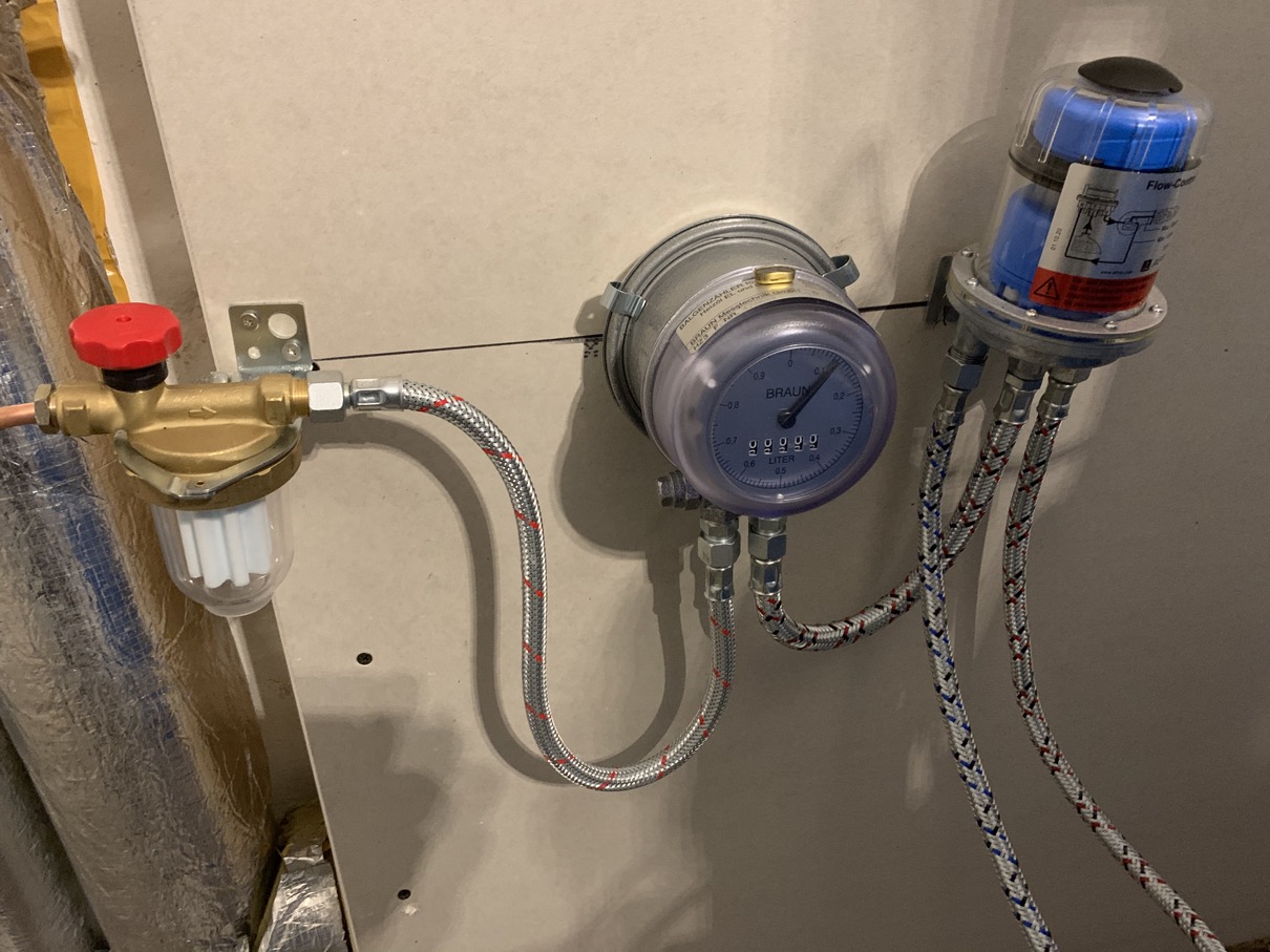 Leitung war zwar montiert, jedoch füllte sich vorgeschaltete Ölfilter nicht, entsprechend konnte die Leckfreiheit der Leitung nicht geprüft werden - also eine Ansaugpumpe gekauft und Marc-André hat dann Öl angesaugt .... Öl kommt .... jedoch schießt es in der Zuleitung zum Afriso-Filter raus. Alle Versuche, die Leckage zu stoppen scheiterten - Öl tritt immer aus.