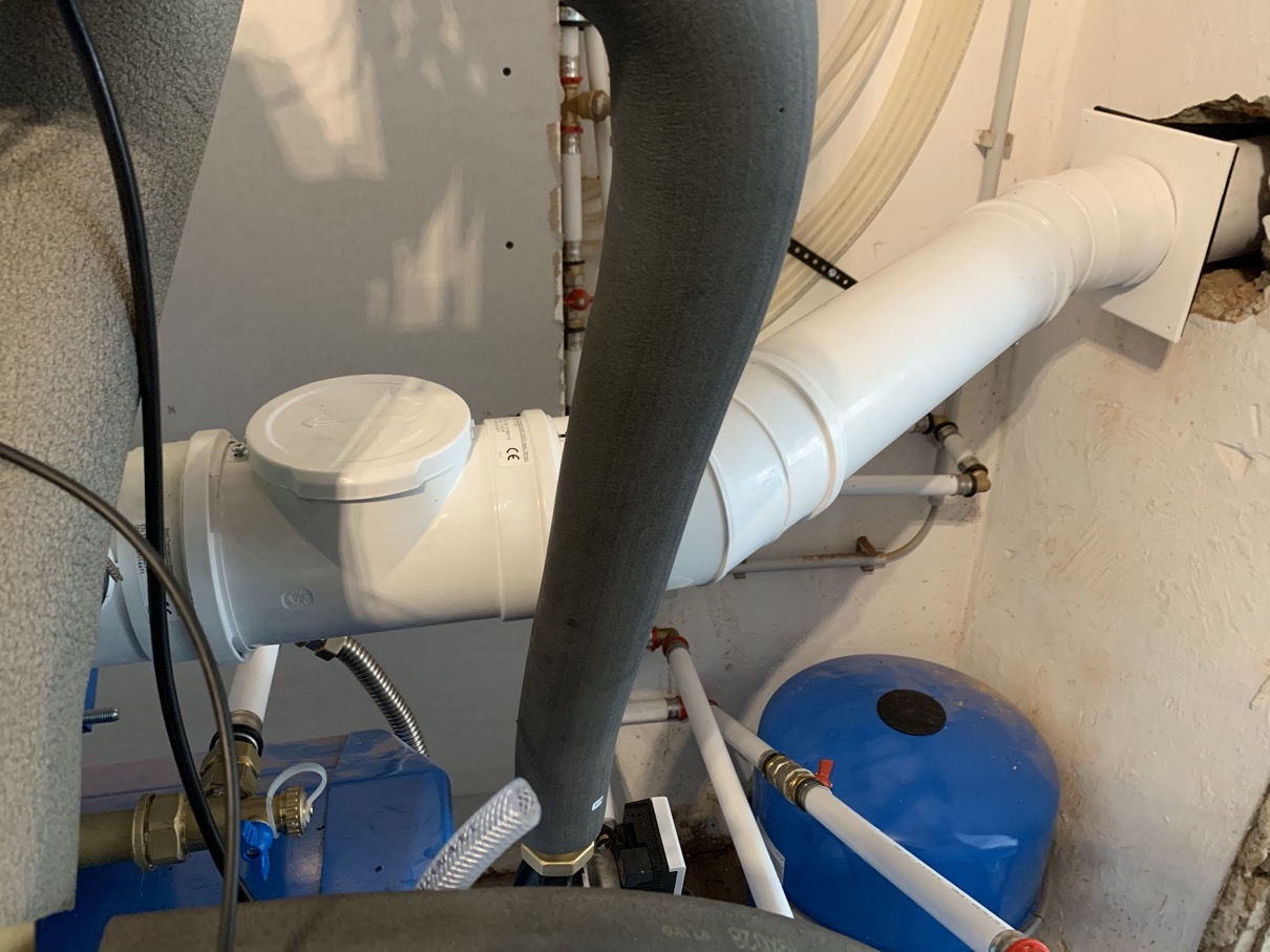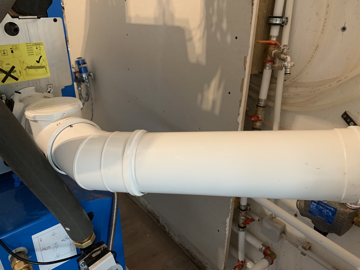 Das Kondenswasser der Heizungsanlage (vielmehr des Kamins) muss auch noch vernünftig über die Heberpumpe abgeleitet werden, also die Leitung mit kleinen Schlauchschellen befestigen, damit der Schlauch nicht unachtsam losgetreten werden kann .....