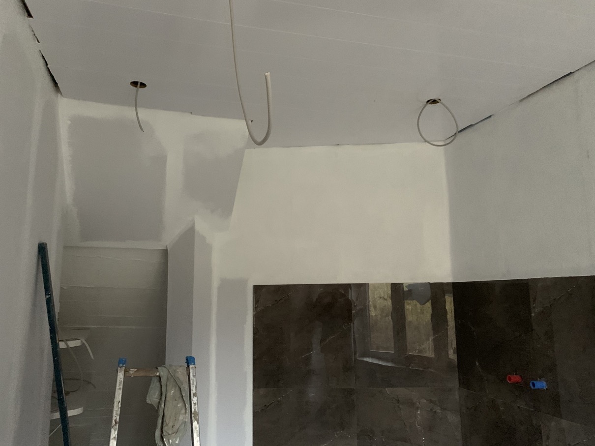 Einhausung mit Rigips fertig und schon mal zwei Putzschichten aufgetragen - muss jetzt trocknen, damit das Ganze gefinished werden kann .... |
