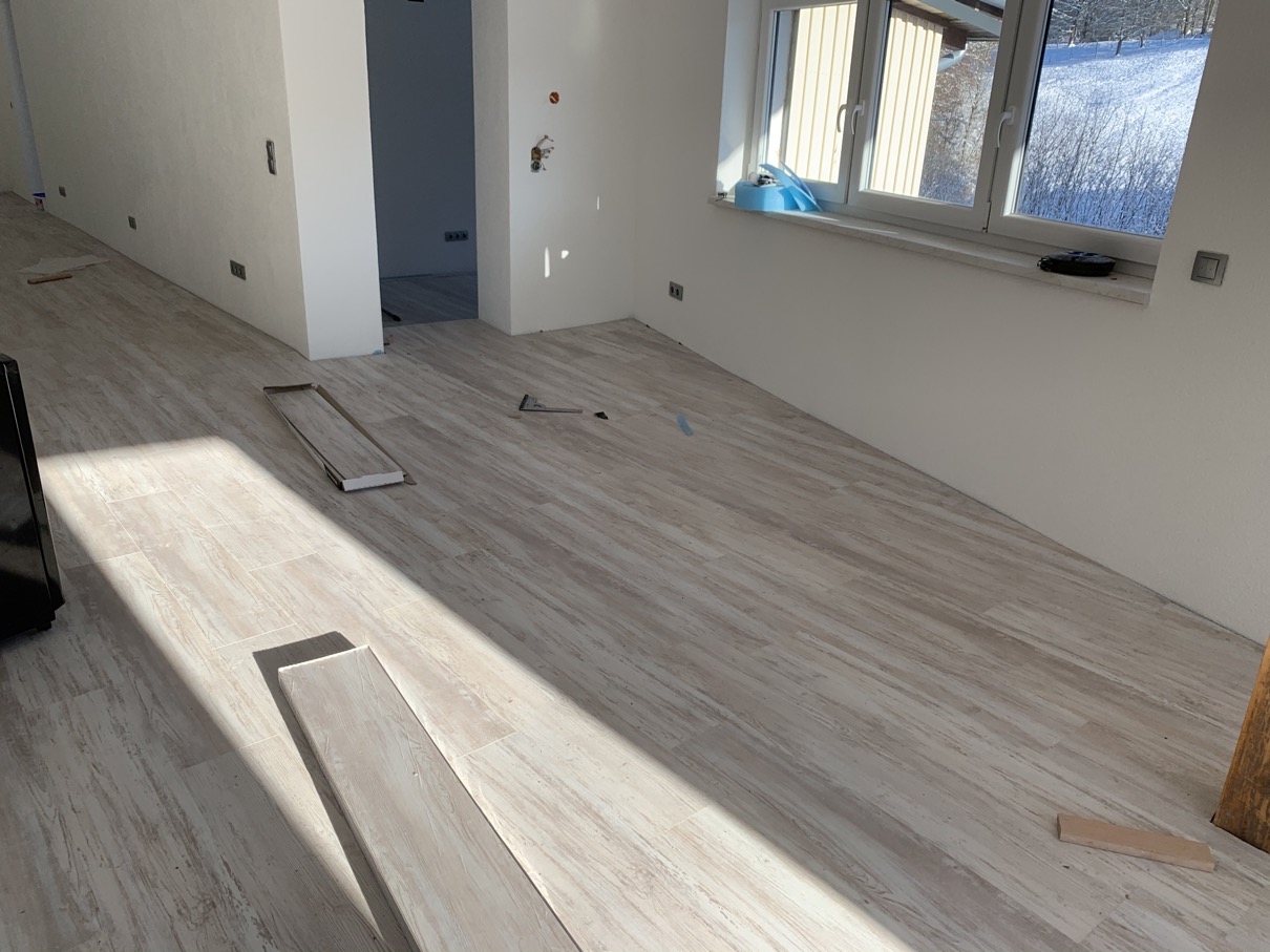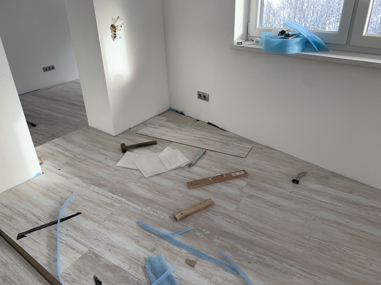 Das "Drama" nahm aber seinen Lauf, als wir auch noch ein paar schadhafte Stellen (gerissene "Verriegelungen" im Vinyl bzw. gebrochene Eckchen durch hochgebogenes Vinyl --> ich denke mal durch die Kälte) im Durchgang Flur/Esszimmer "bereinigen" wollten.