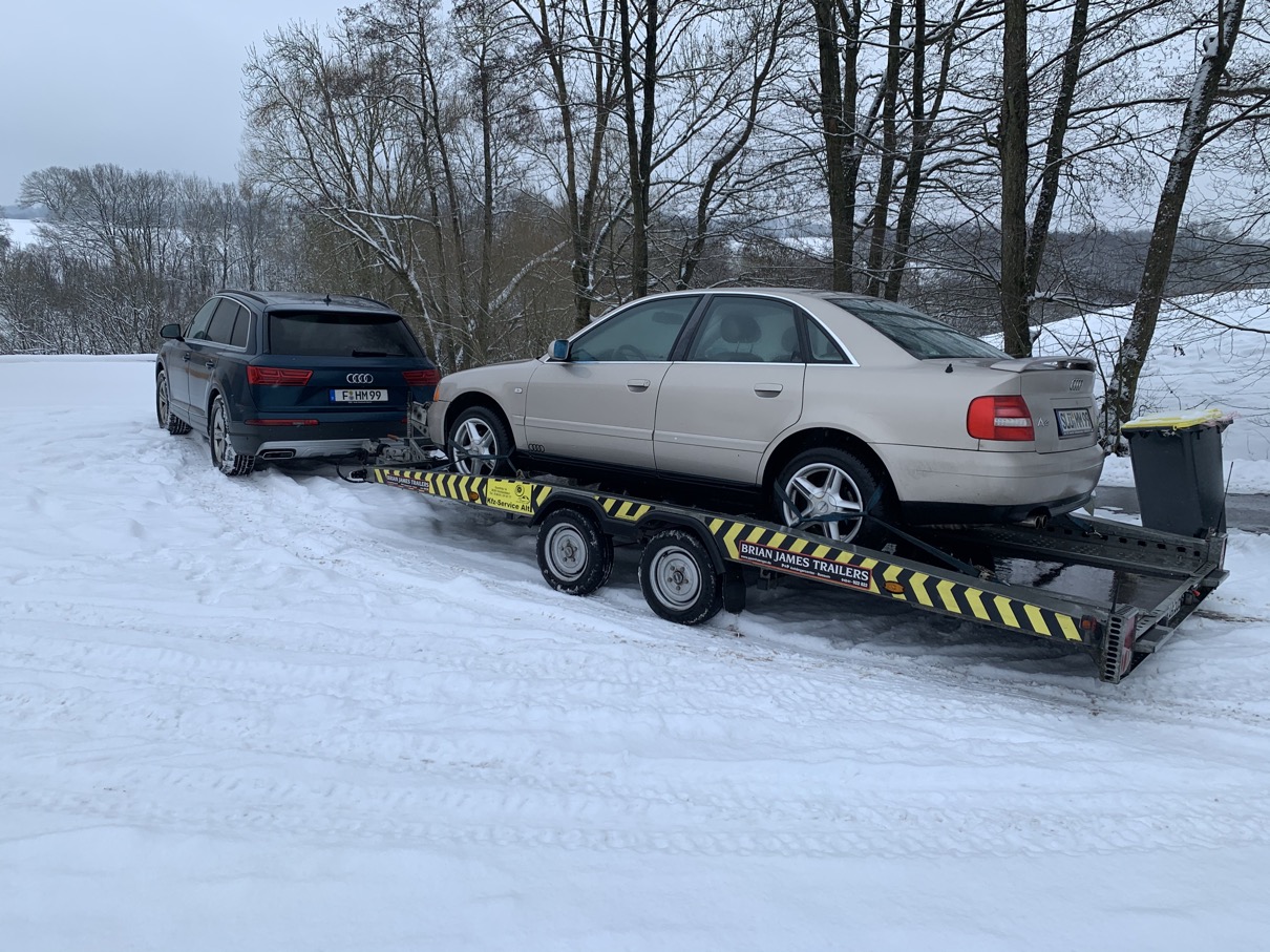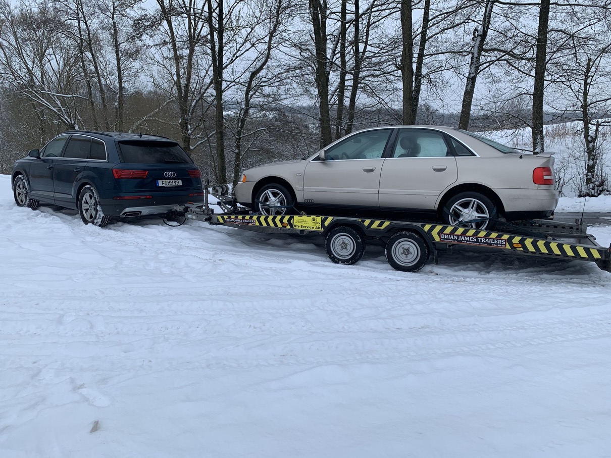 Heißt: PKW-Anhänger besorgen (glücklicherweise hat unser Nachbar eine KFZ-Werkstatt und damit einen passenden Anhänger) und Sonntag früh bei heftigem Schneetreiben dann zuerst den Leihwagen wieder in Fulda abgeben und anschließend Richtung Bayreuth mit 100 km/h zuckeln, um das havarierte Fahrzeug zu holen.