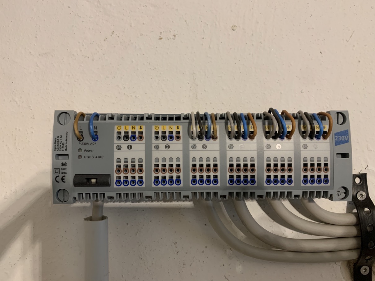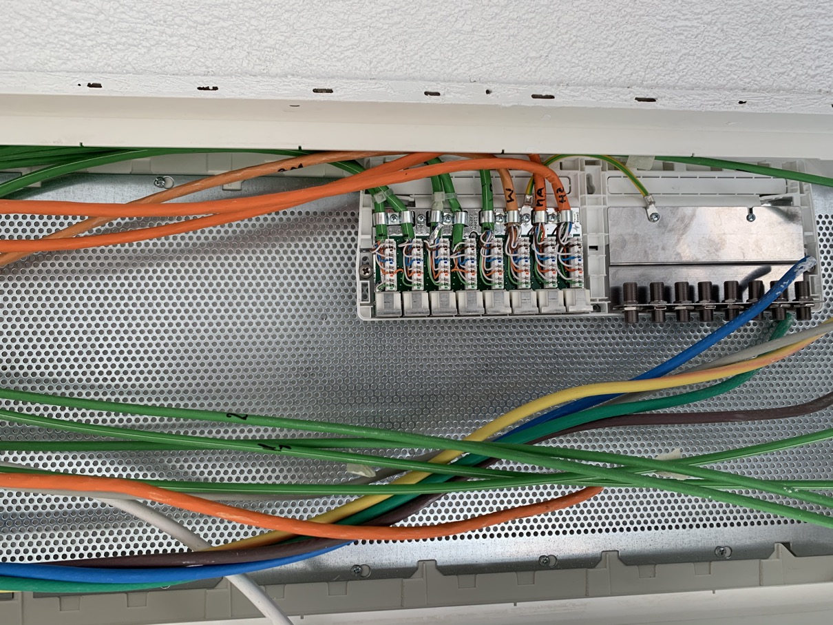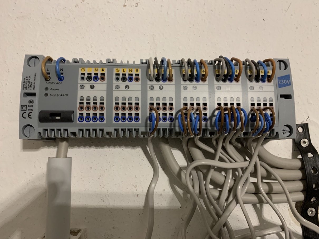 Jeder Thermostatverteiler (und da brauche ich 2 Stück von) benötigt natürlich seine eigene Stromversorgung (und hier wähle ich Permanentstrom, also nicht vom Heizungsnotschalter aus gesteuert, da sonst ja meine Thermostate in der Wohnung bei jeder Wartung ausfallen würden .... ne ne ne ....); und wieder Filigranarbeit, die einzelnen Adern genau in den Vorrichtungen zu platzieren - und dann die einzelnen Adern "einlochen" - da brechen einem doch glatt die Finger weg 😭; .... und zu allem Überfluss wollen auch die beiden Adern der Stellmotore dort noch zusätzlich eingefädelt werden ....