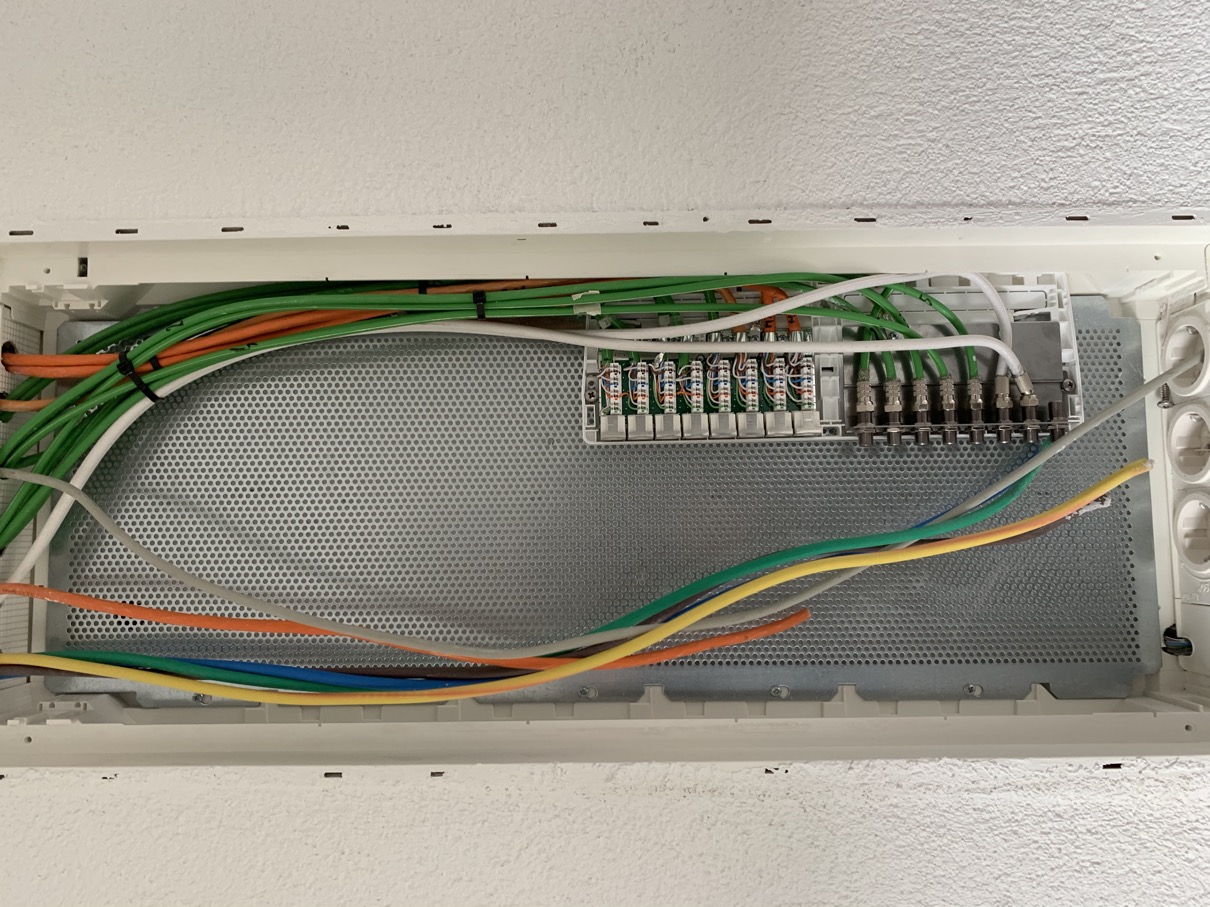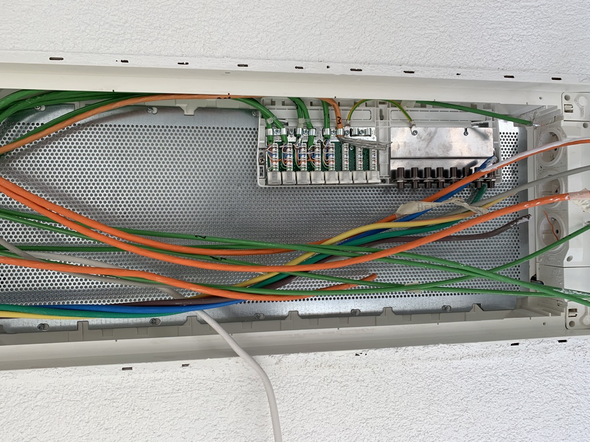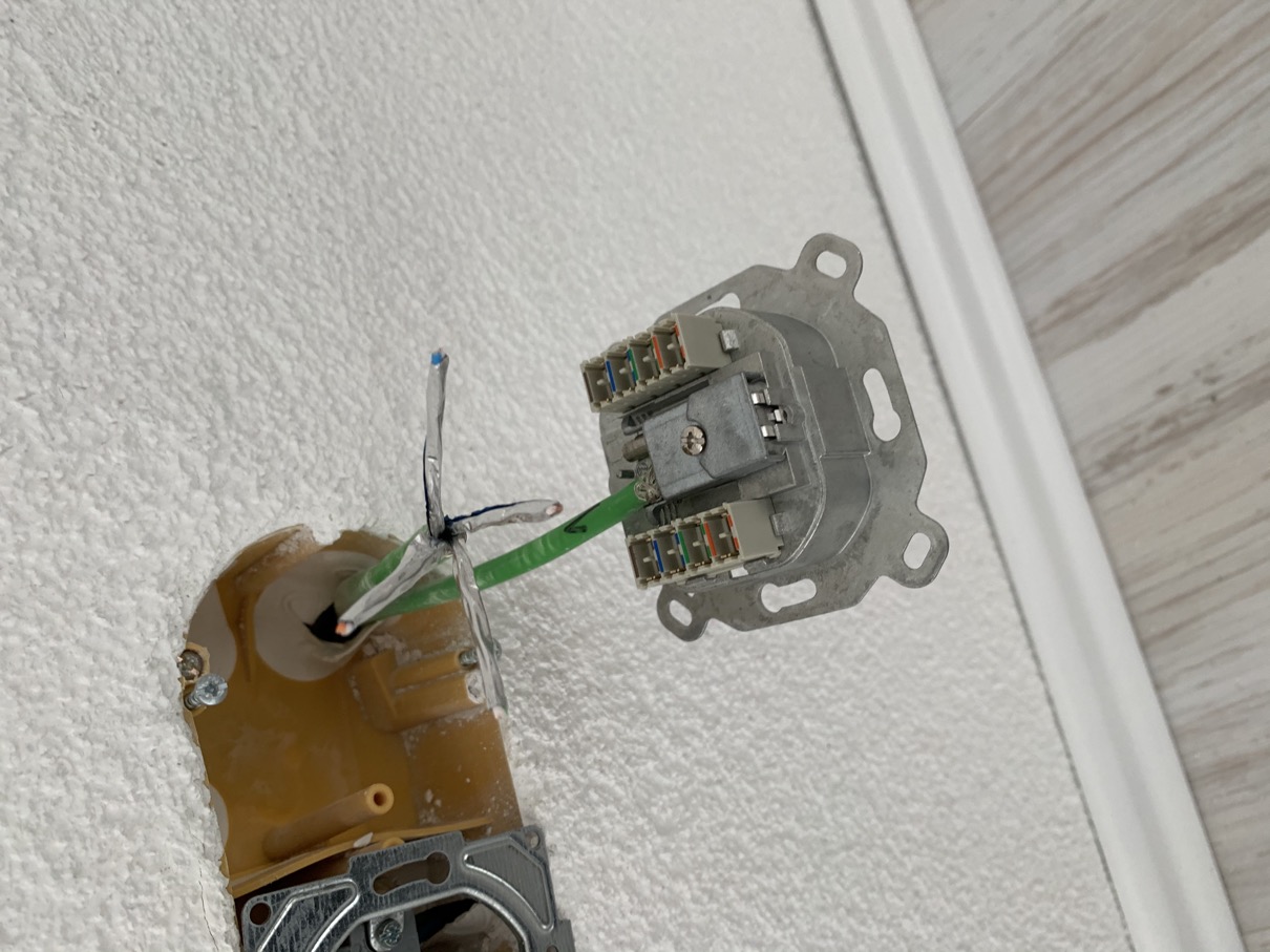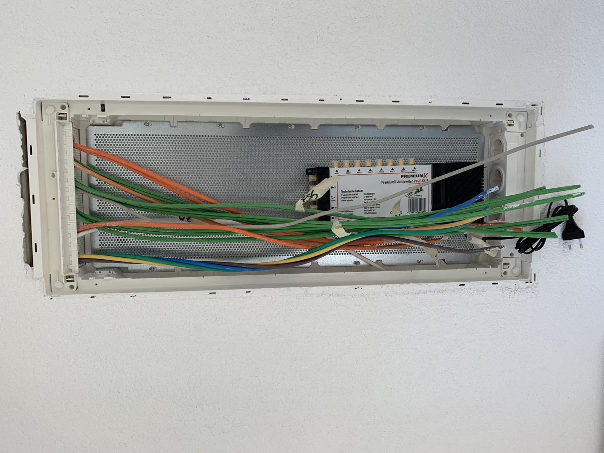 umpositioniert: erst einmal die Homeway Installationsbox positioniert und die CAT-6-Verkabelung vollzogen. Aber ohne Koaxialkabels-F-Stecker geht es hier wieder nicht mehr weiter |