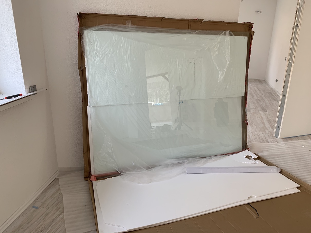 .... und da waren doch auch noch die 100 Kg -> also die Walk-In-Duschabtrennung, bei der Befestigungsteile fehlten und jetzt expressmäßig nachgesandt worden waren. Dennoch ist es eine Herausforderung, eine 100 kg schwere Scheibe zu transportieren: