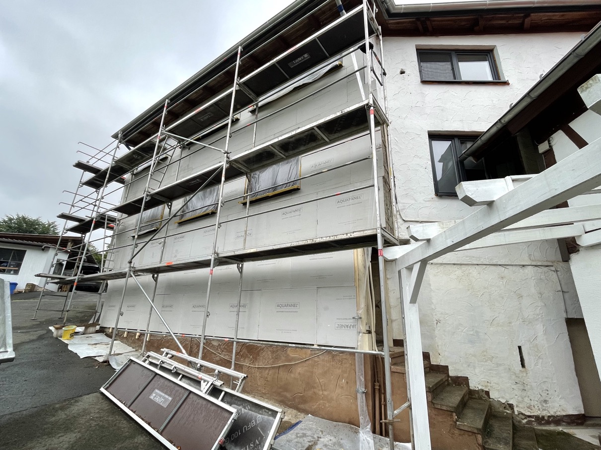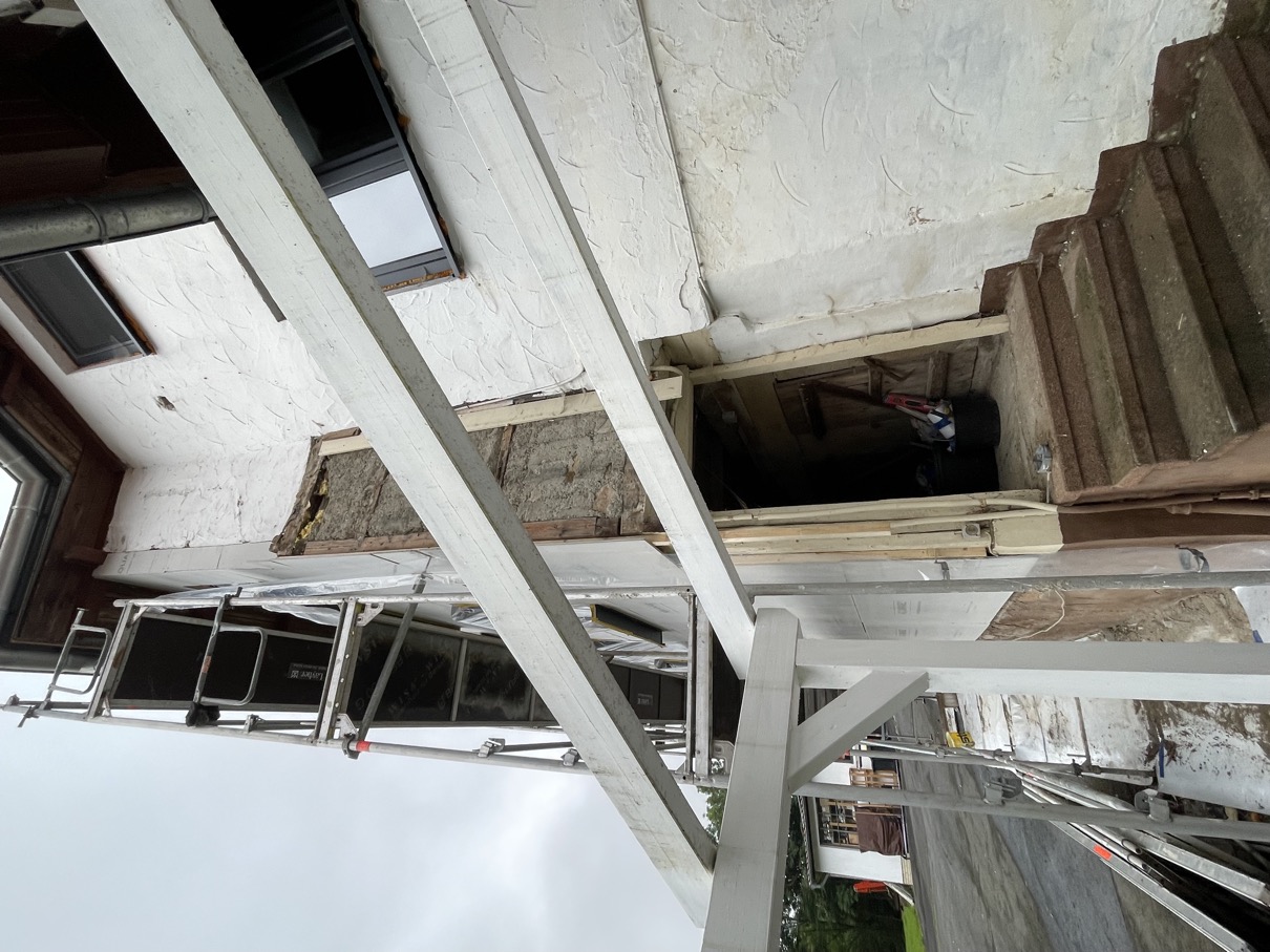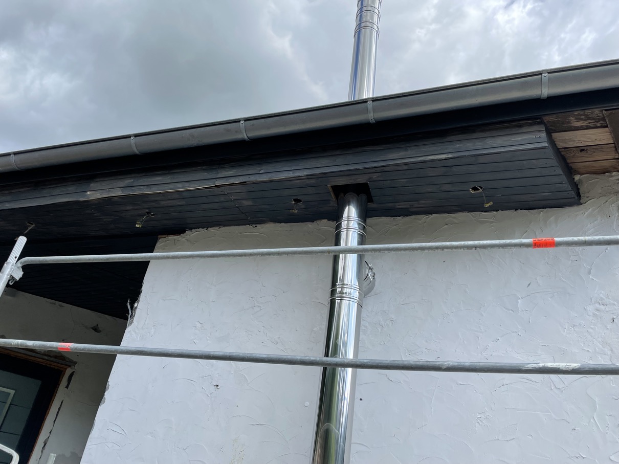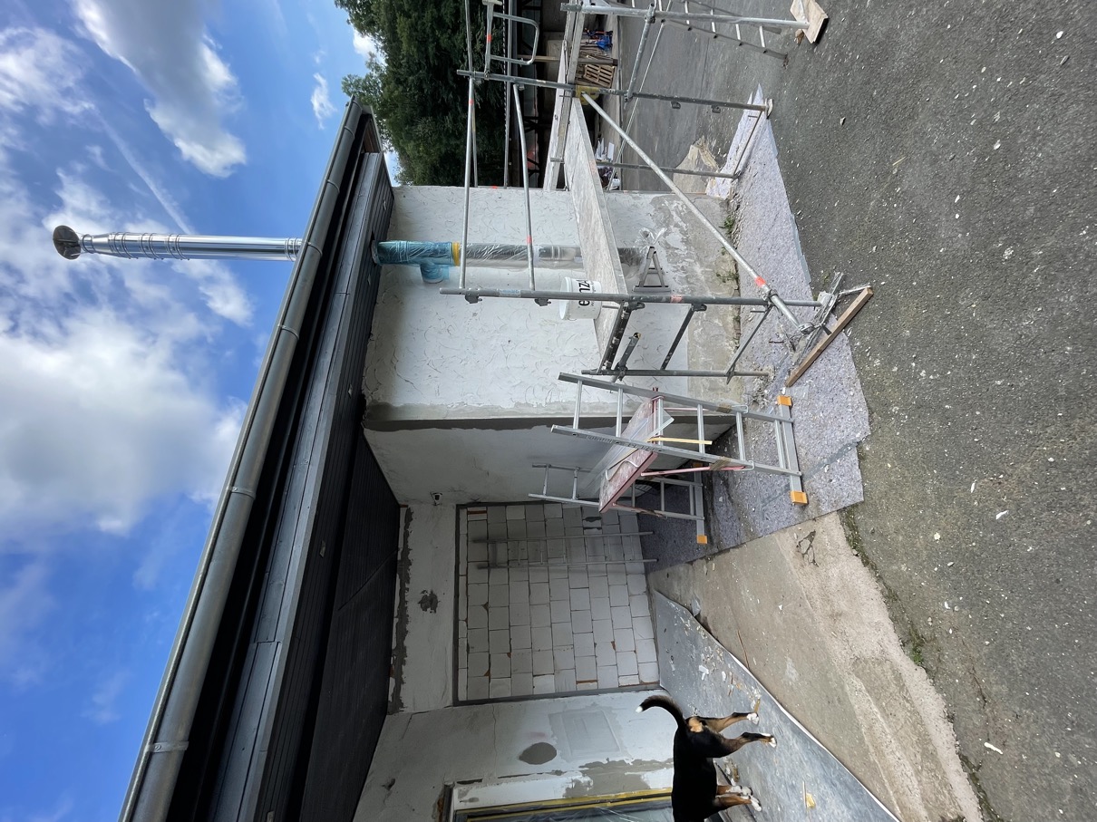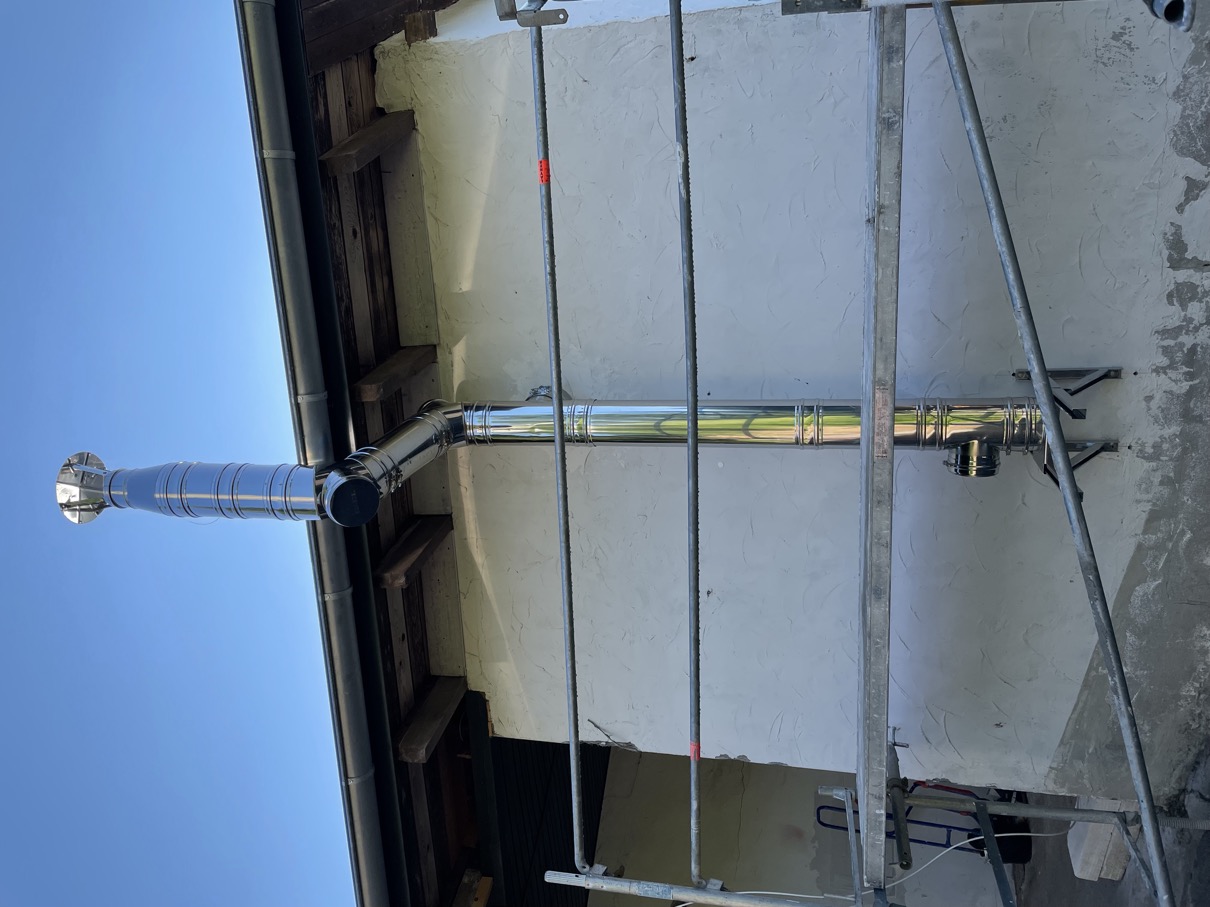Donnerstag/Freitag (12./13.08.2021) wurde dann das Haus eingerüstet ... eine gute Gelegenheit, den nächsten (nicht ganz so kleinen) "Kleinkram" abzuräumen: unser Außenkamin sollte ja, so der Wunsch unseres Bezirks-Schonsteinfeger-Meisters lieber gerade durch das Dach geführt werden .... also ran: