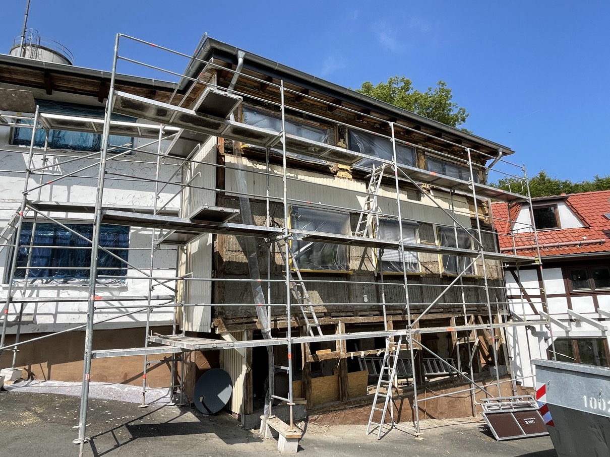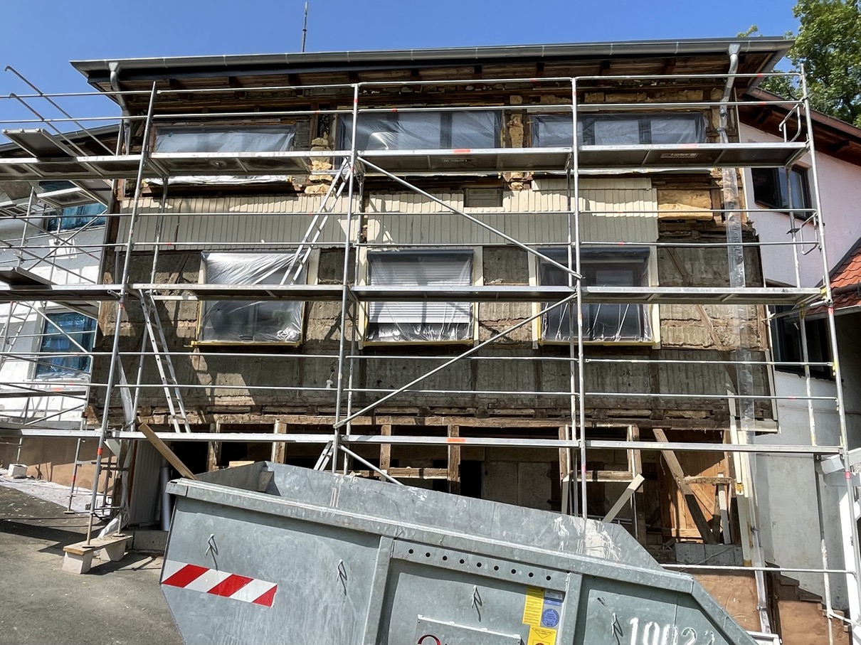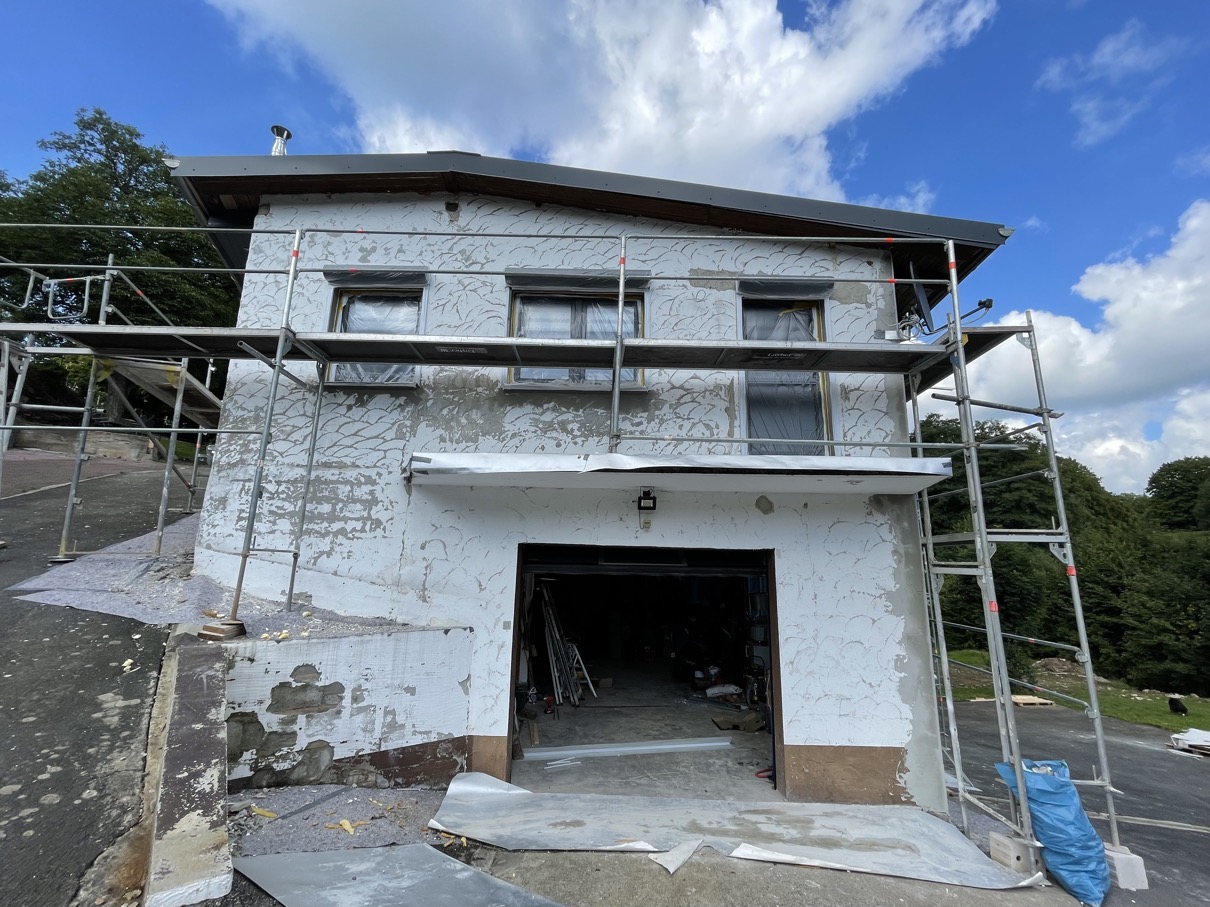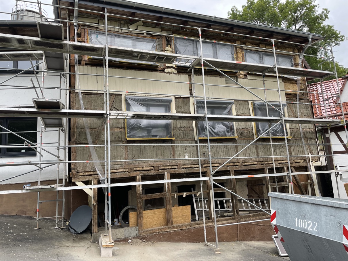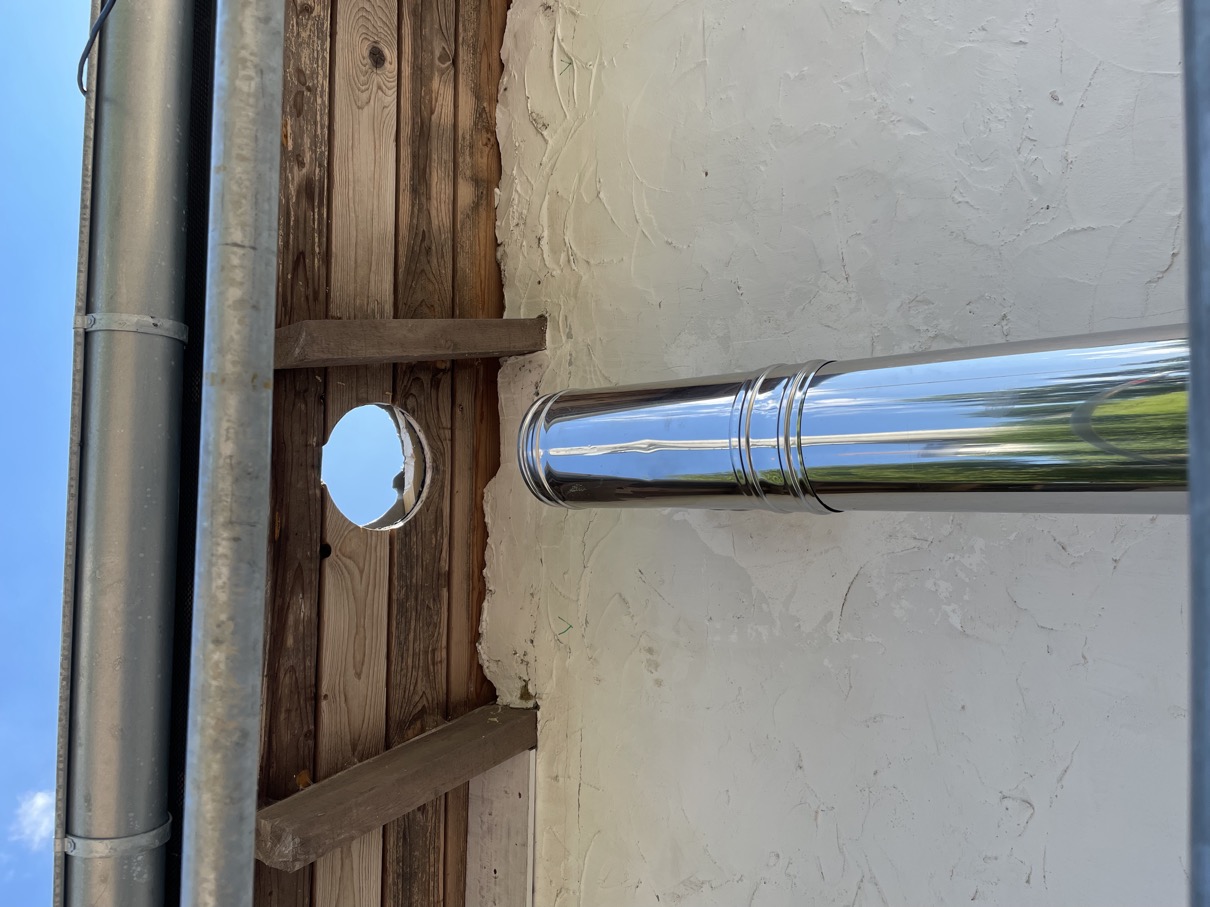 Donnerstag/Freitag (12./13.08.2021) wurde dann das Haus eingerüstet ... eine gute Gelegenheit, den nächsten (nicht ganz so kleinen) "Kleinkram" abzuräumen: unser Außenkamin sollte ja, so der Wunsch unseres Bezirks-Schonsteinfeger-Meisters lieber gerade durch das Dach geführt werden .... also ran: