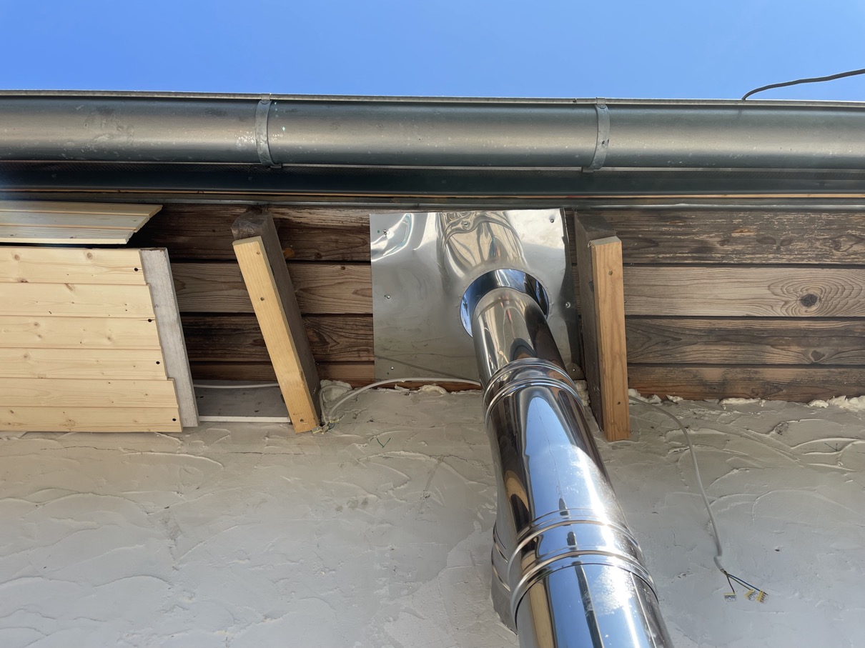 natürlich mit Metalldurchführung durch Holz/Teerpappe und Metalldach .... so wie das sein muss; jetzt noch die Schlagregenabdeckung drauf ... dann fertig - fast ein ganzer Tag Arbeit -- hat sich aber gelohnt.