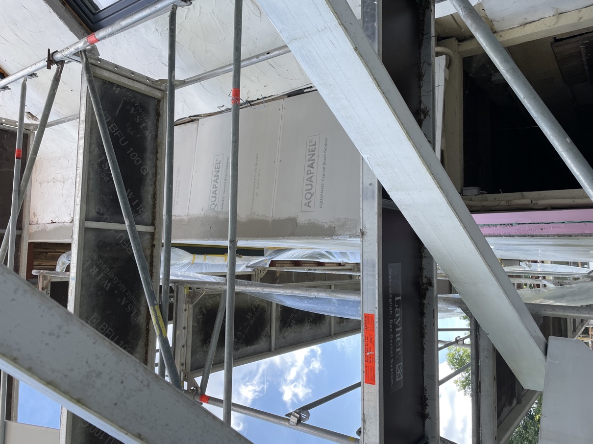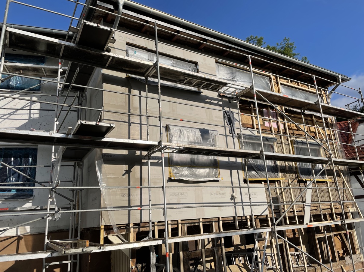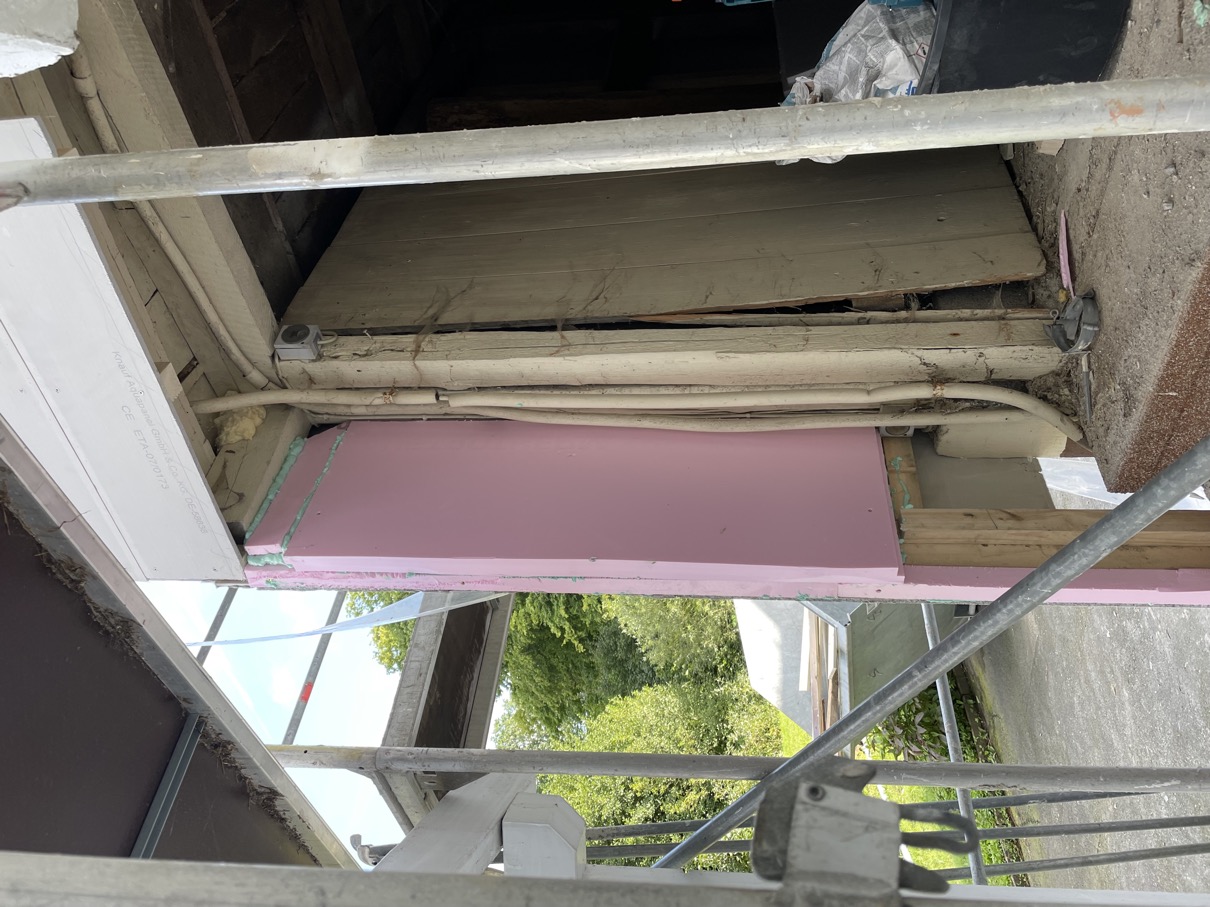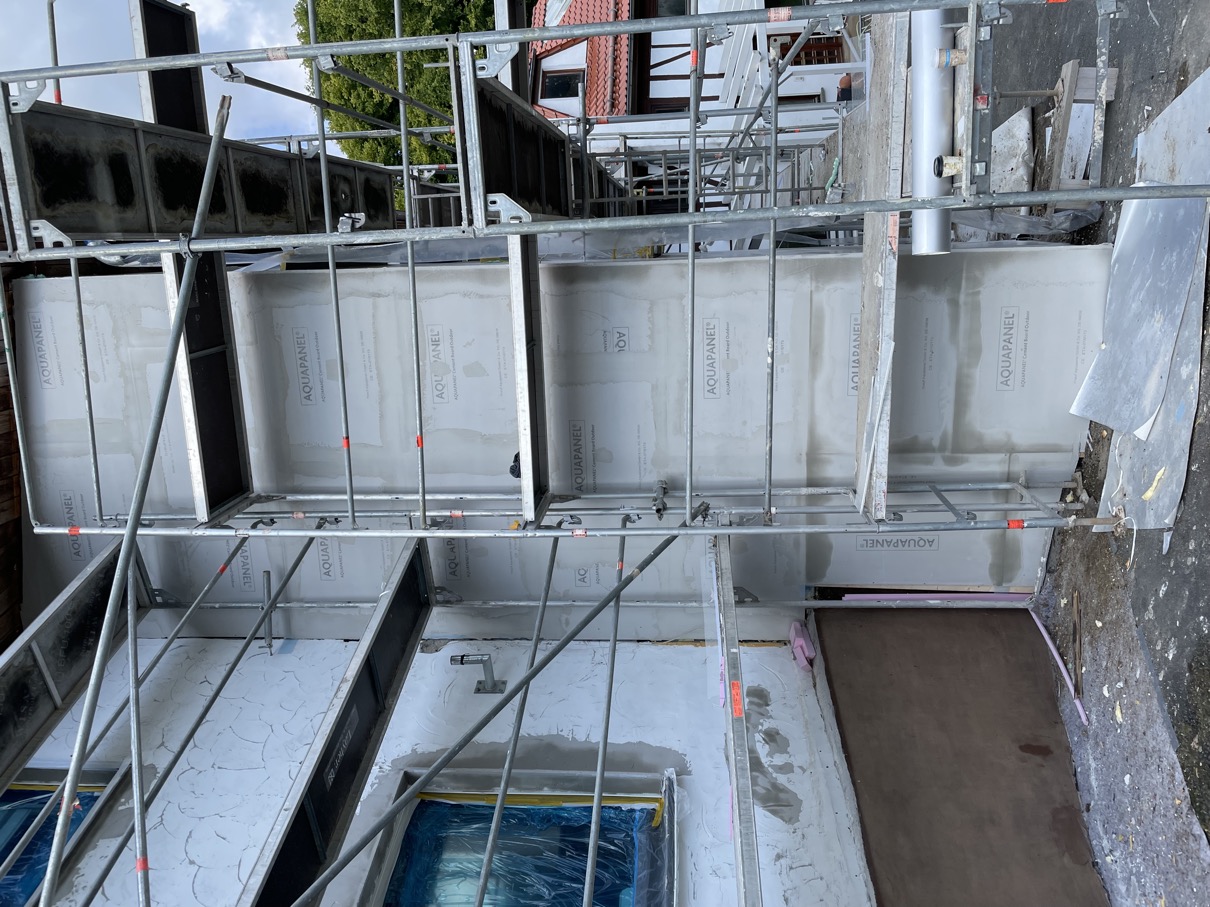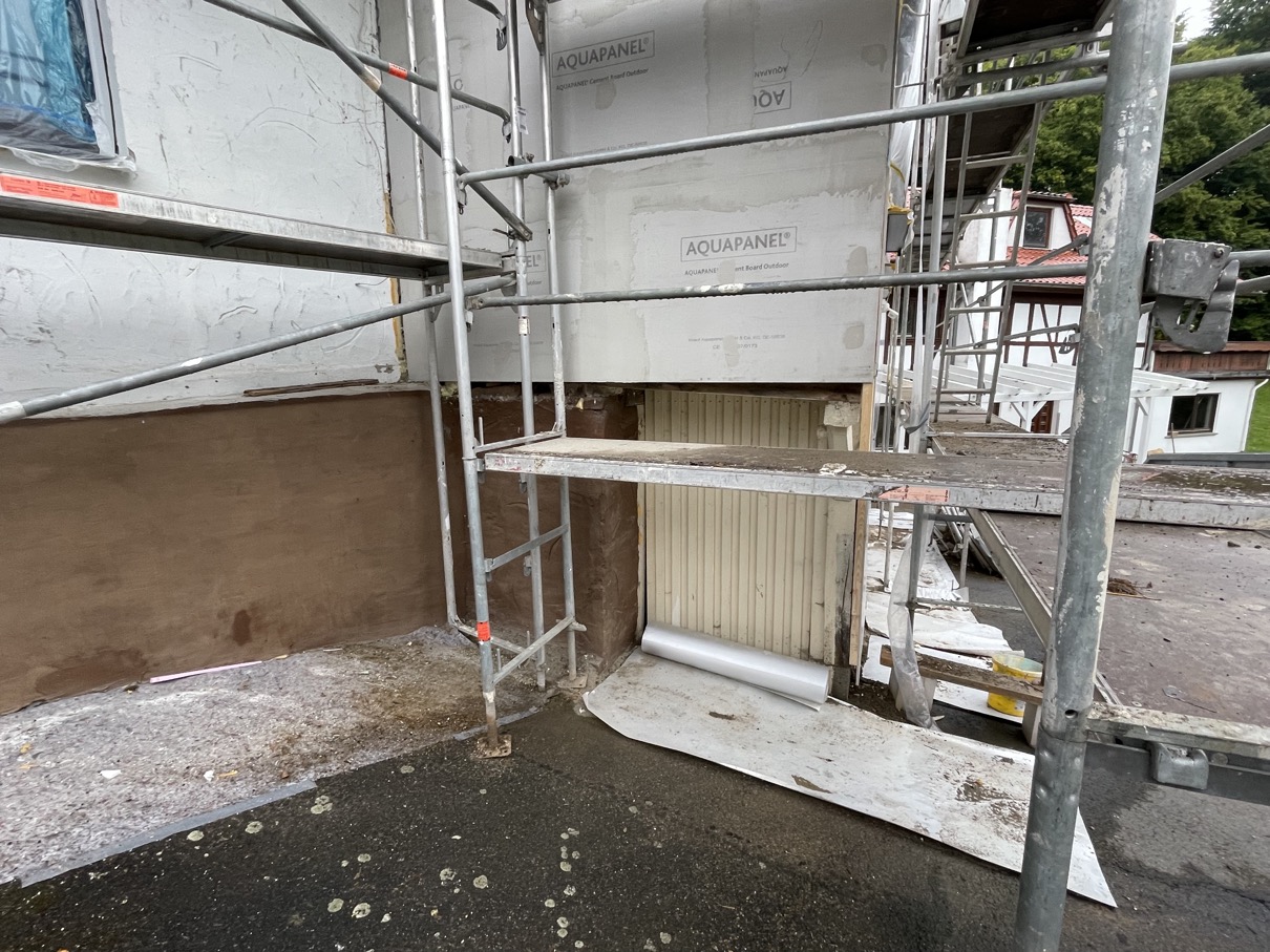Nach einiger Diskussion mit dem Verputzer haben wir uns entschieden, hier eine Vorwand aus Aquapanel Outdoor, also einer zementgebundenen Putzträgerplatte, auf ein Lattengerüst zu erstellen. Nicht ganz einfach, aber mithin die einzige Möglichkeit, die Angelegenheit fluchtend hin zu bekommen.