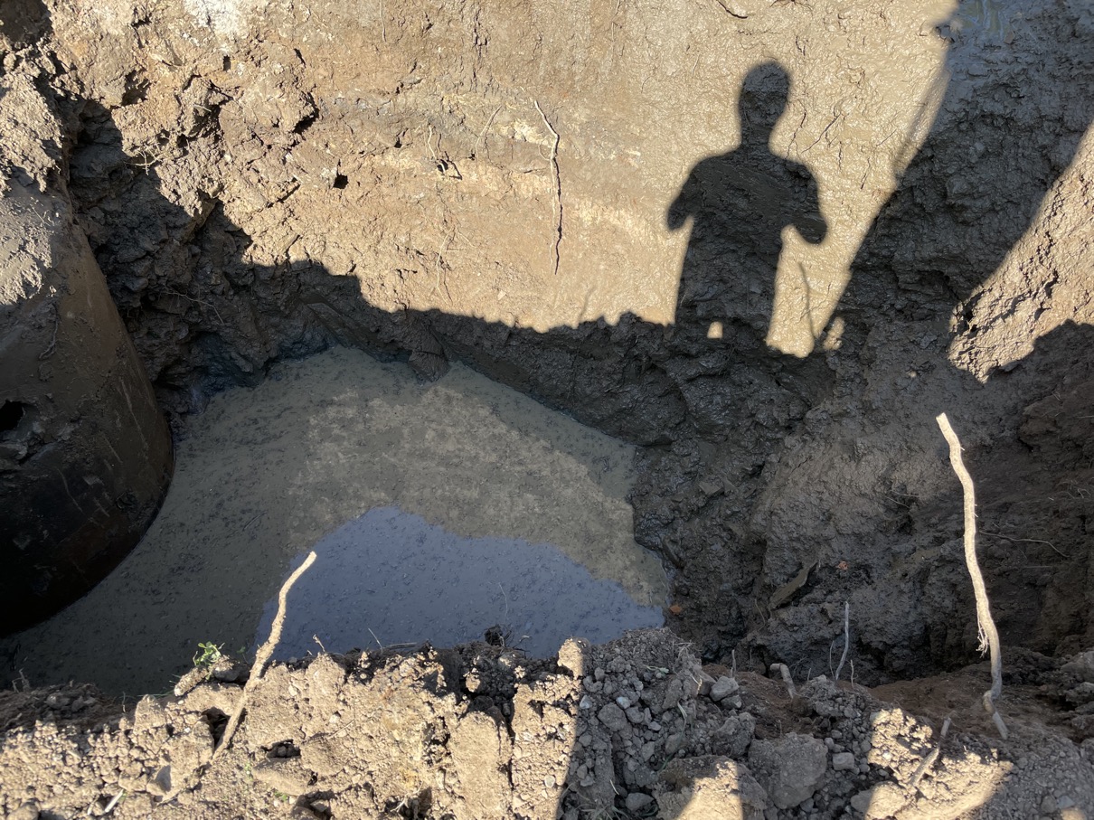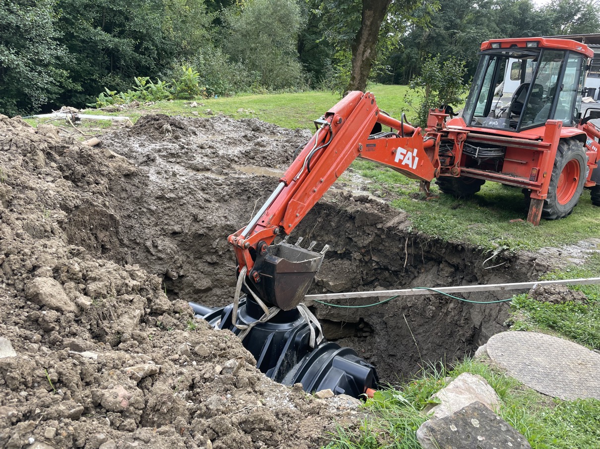 Regen hat aufgehört und jetzt kommt das "Urlaubsprojekt" doch noch ans Laufen: neuen Ablaufkanal für die Kläranlage ausheben und verrohren->