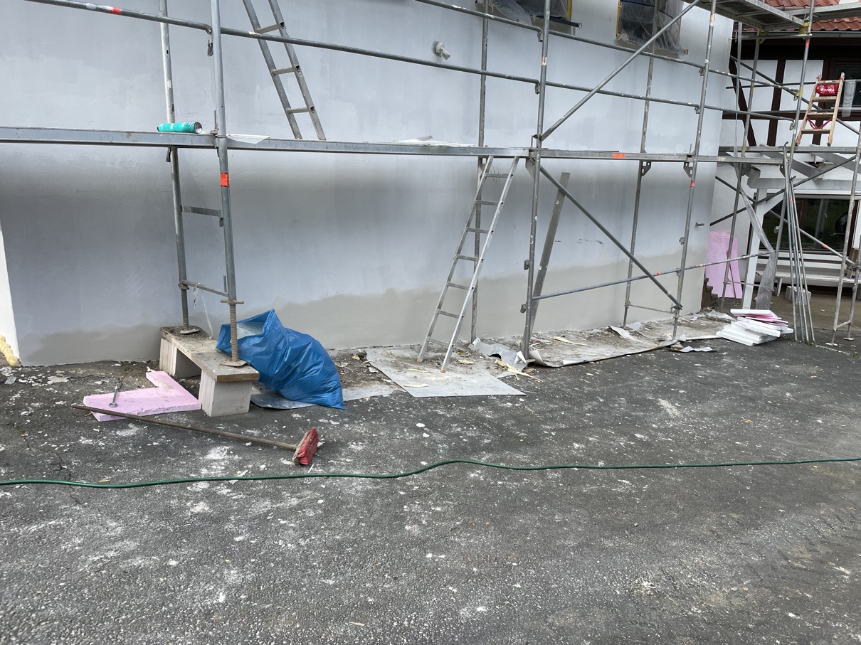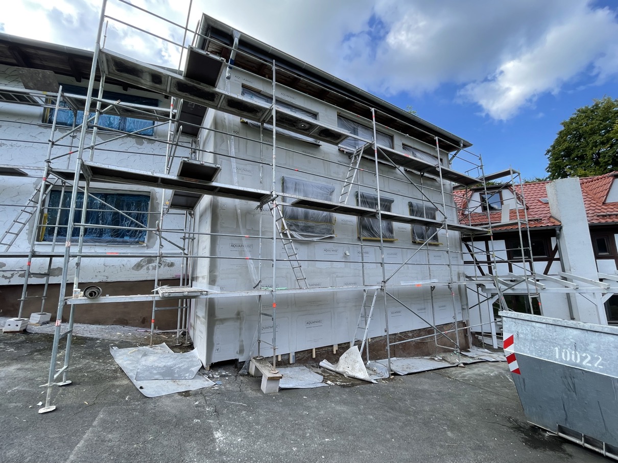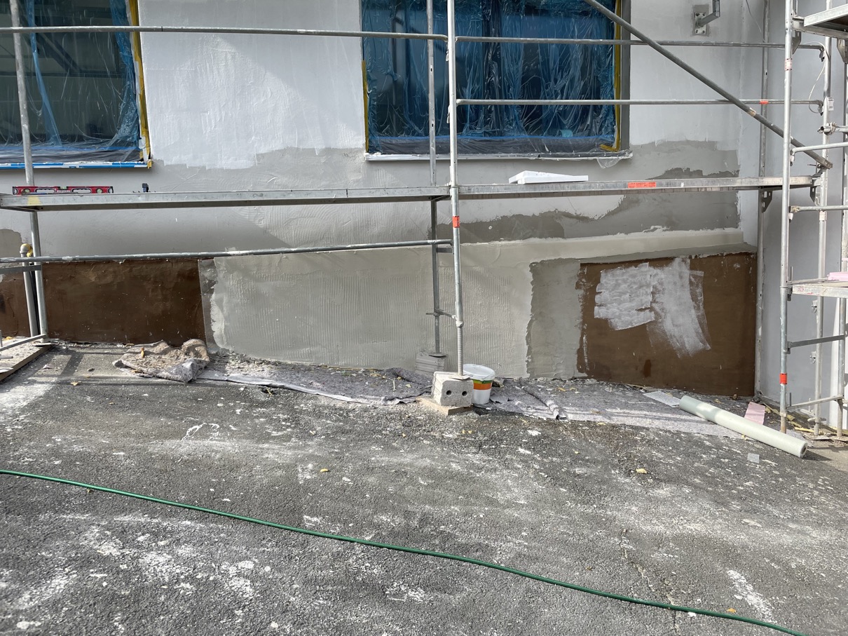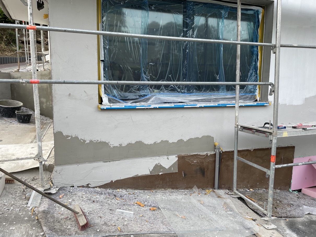 mittlerweile ist fast die gesamte Fassade einmal armiert nachdem sie komplett abgedampft (gekärchert) worden ist. |