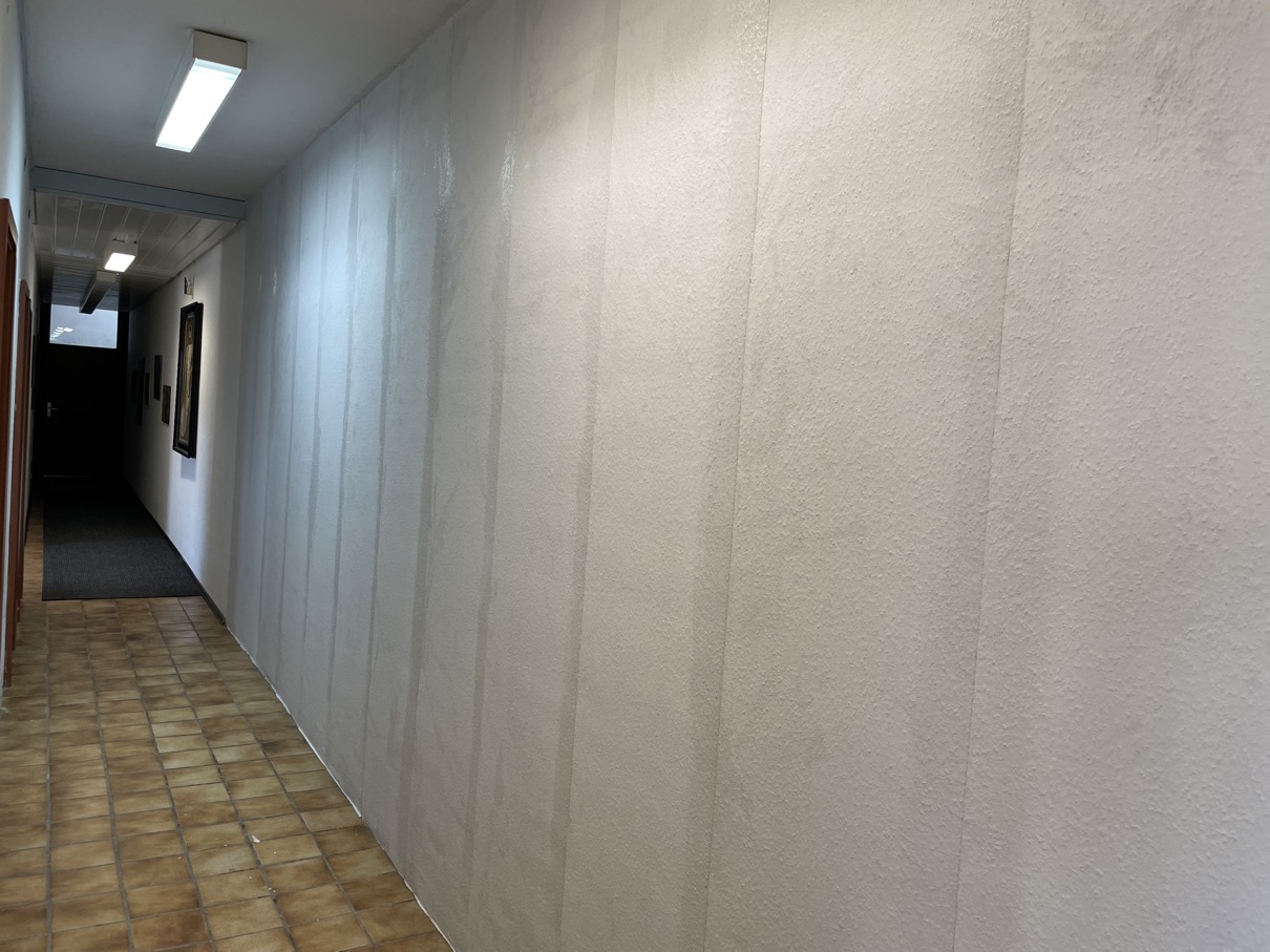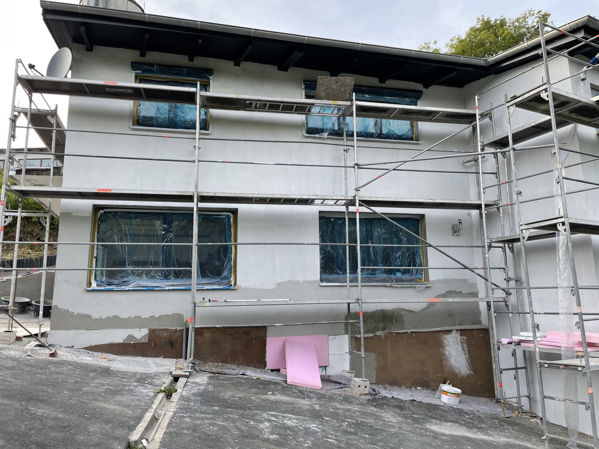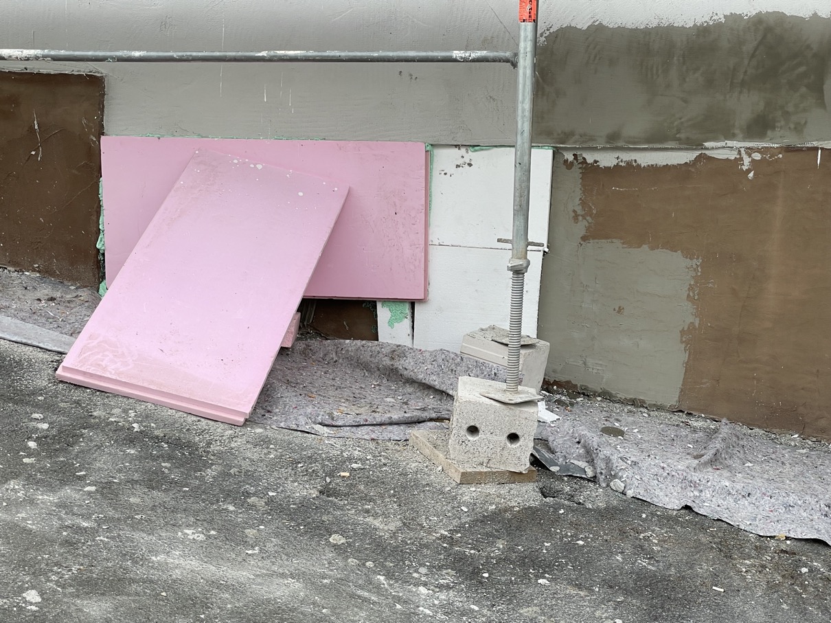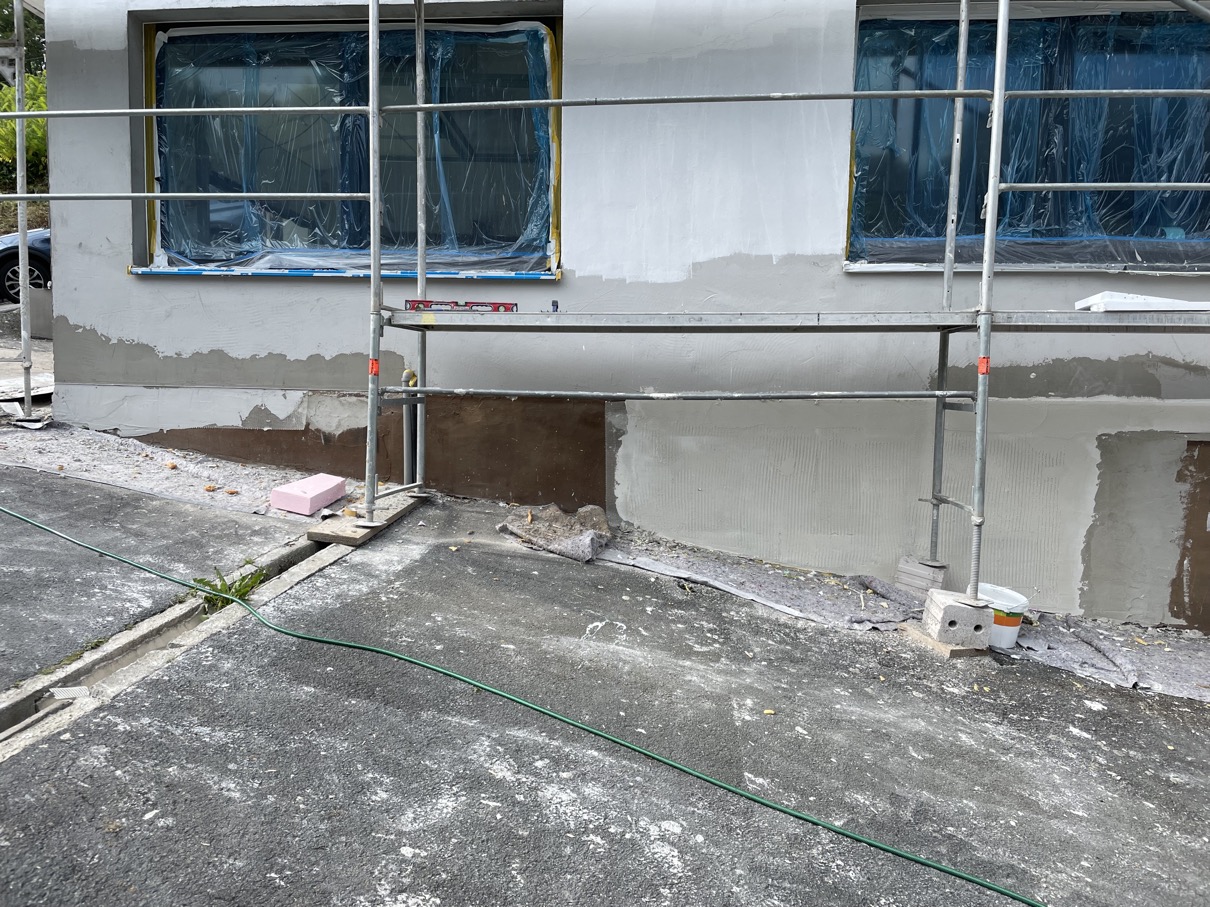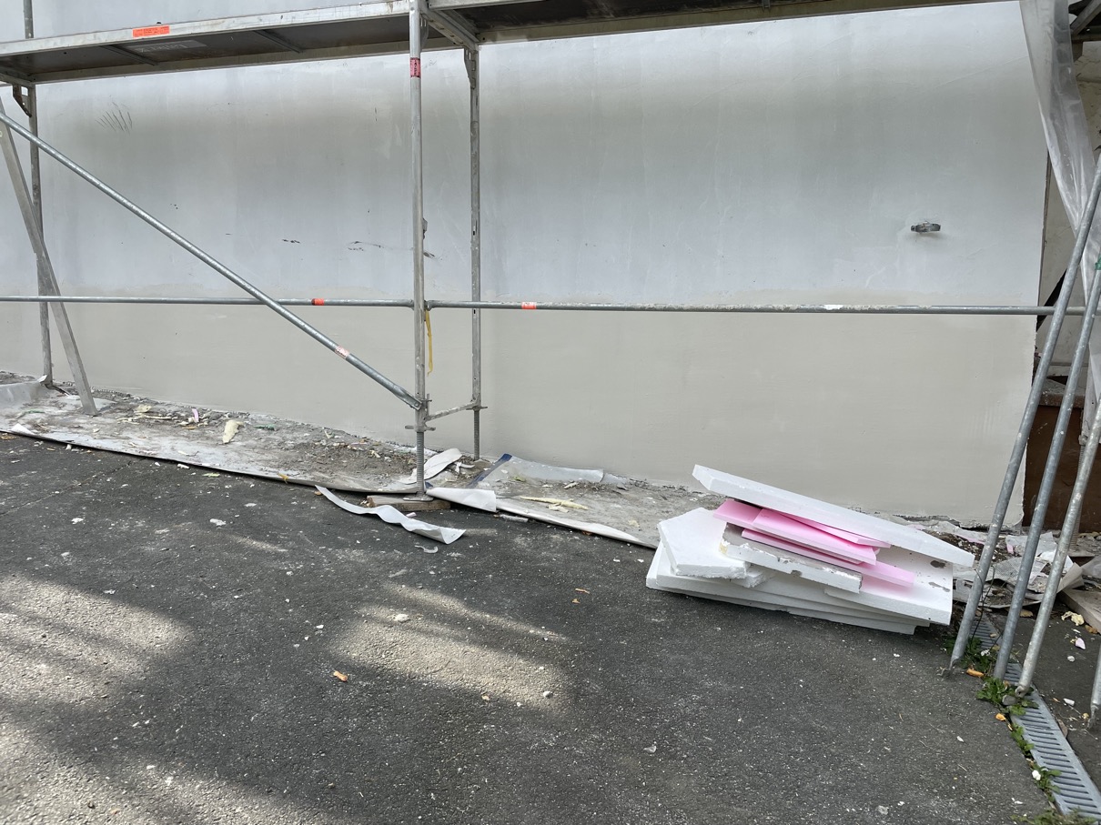 mittlerweile ist fast die gesamte Fassade einmal armiert nachdem sie komplett abgedampft (gekärchert) worden ist. |