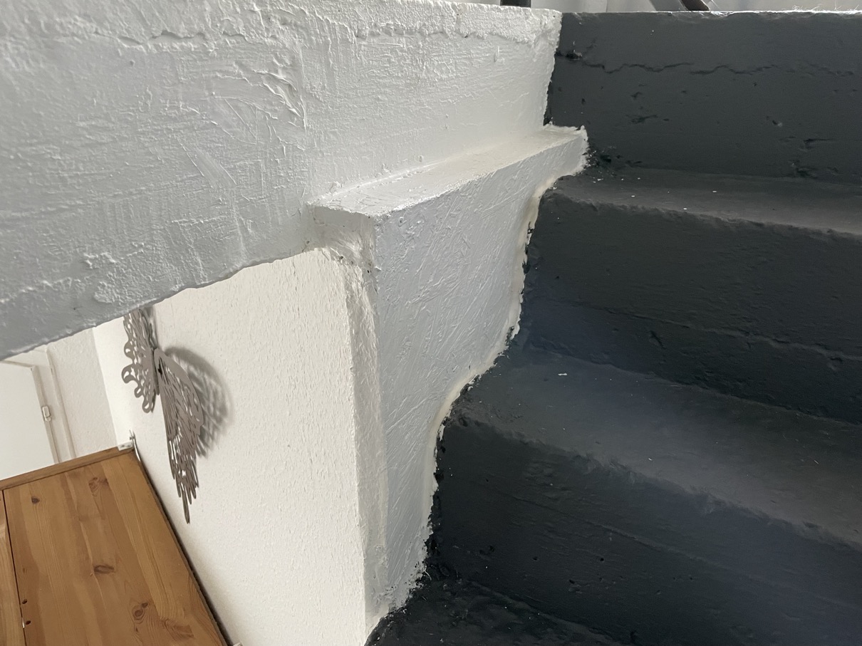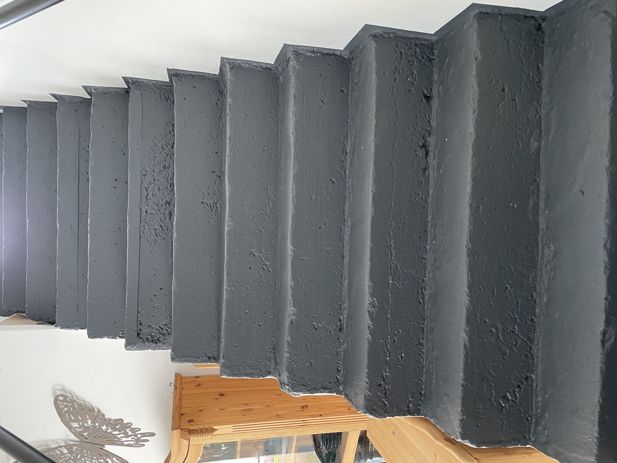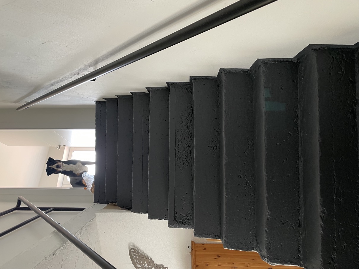 Wenn es nun mal regnet, muss im Inneren gearbeitet werden - und (manchmal 😏) hat sogar Marc-André Lust dazu .... und hat die Kellertreppe und den Absatz zum Heizungskeller neun gestrichen:
