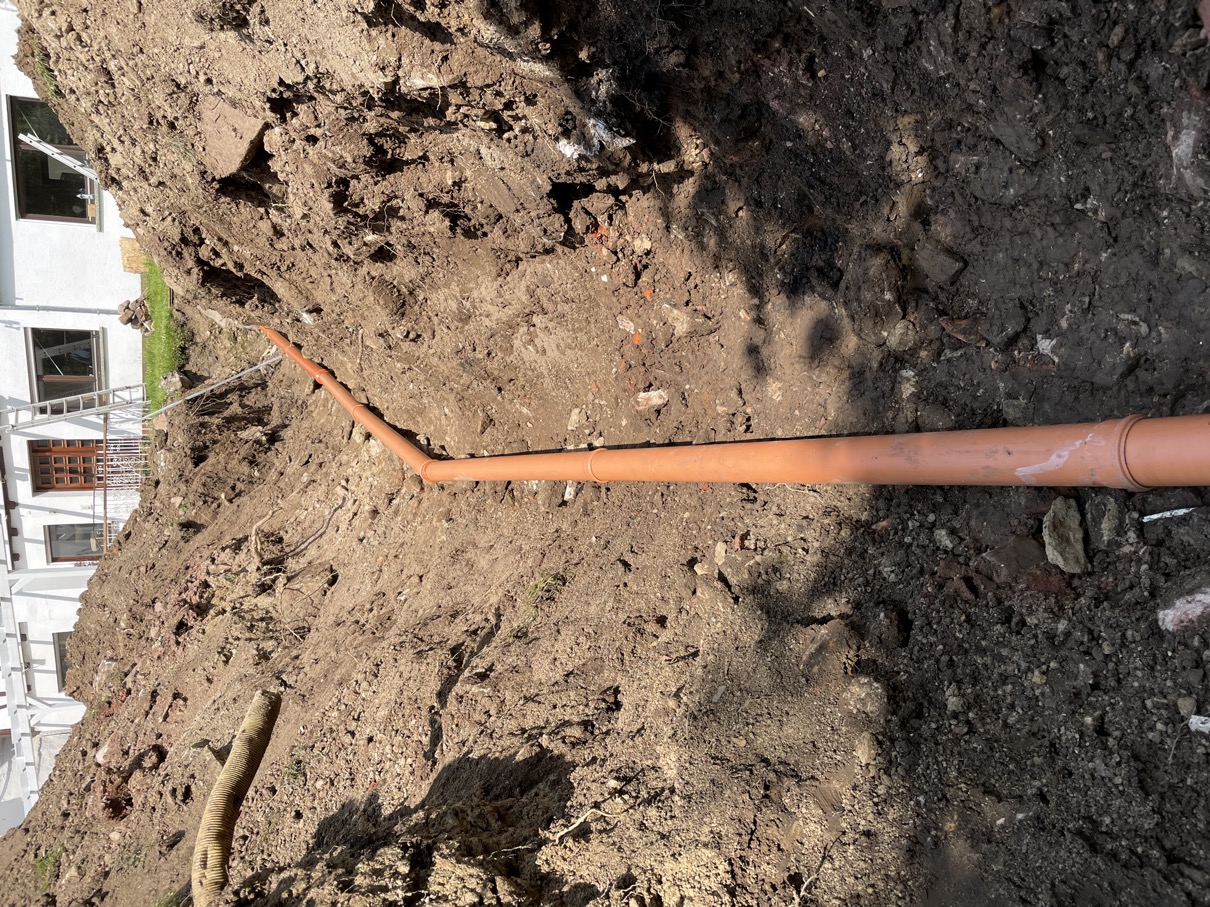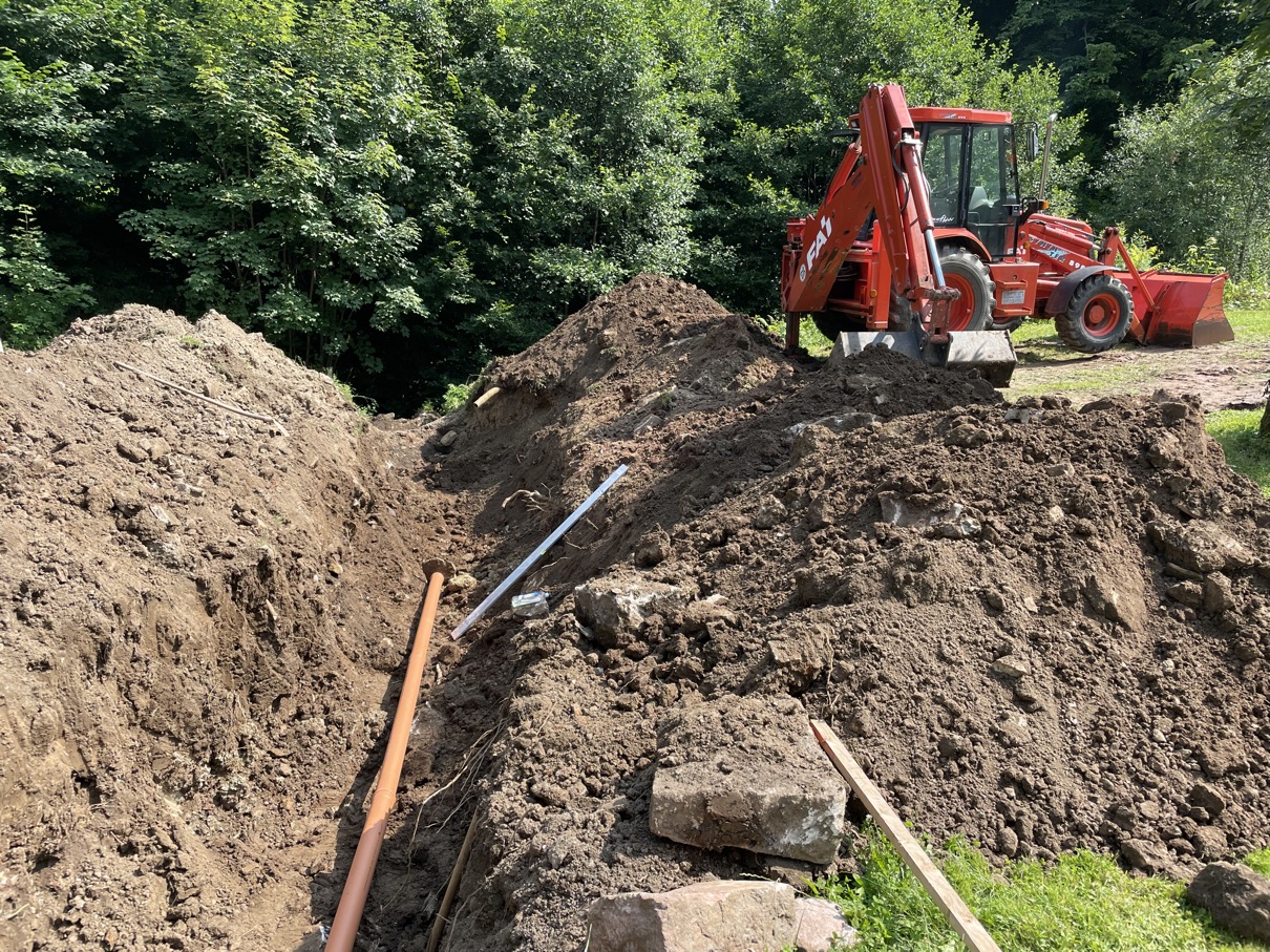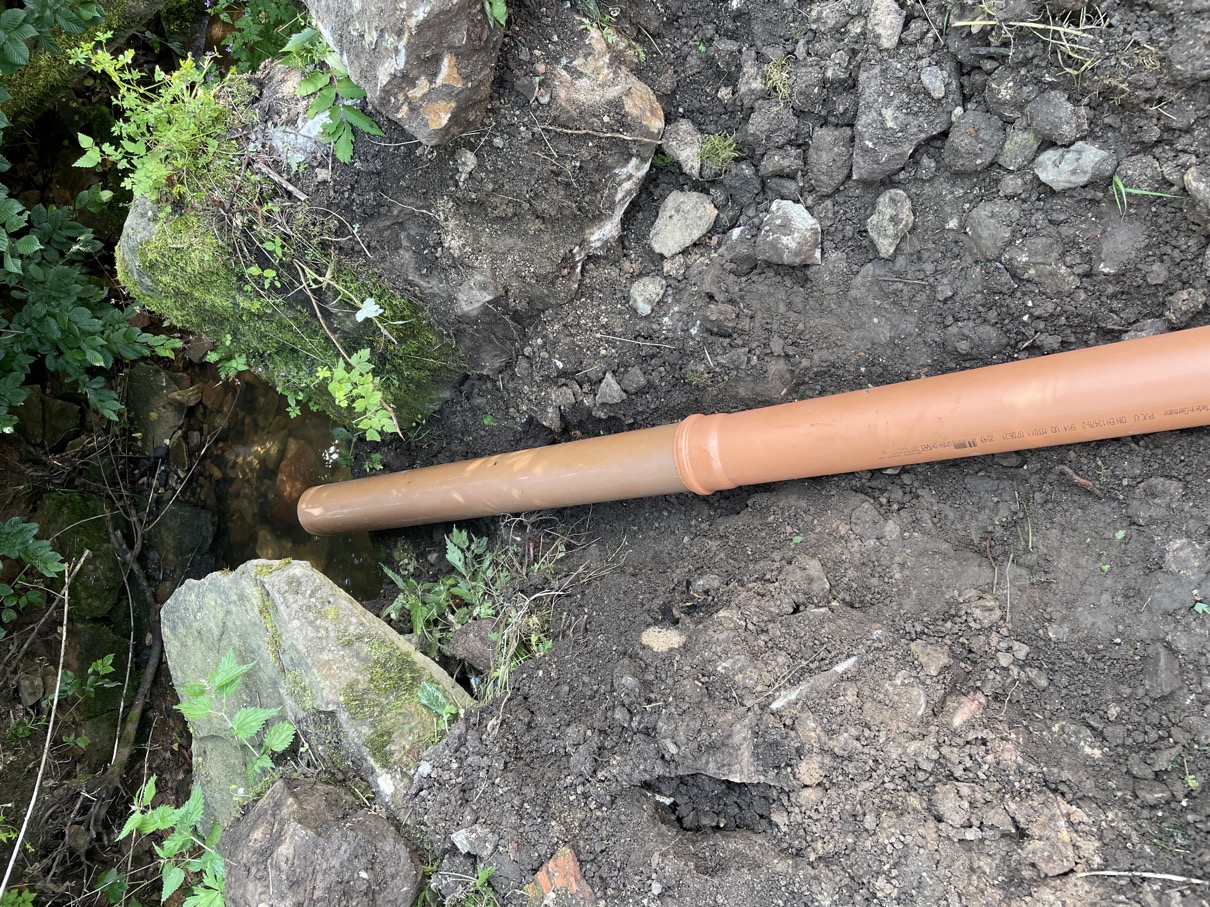 Als hätten wir nicht schon Arbeit genug - das also auch noch: hilft ja nicht, muss gemacht werden: Bagger anschmeißen und loslegen. Nach mehreren Stunden des Baggerns und Verlegen der neuen Leitung dann der Test: Wasserschlauch rein und schauen, ob das Wassert auch im Schwarzbach ankommt. funktioniert.