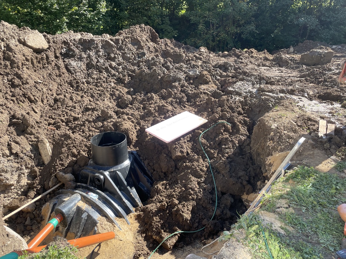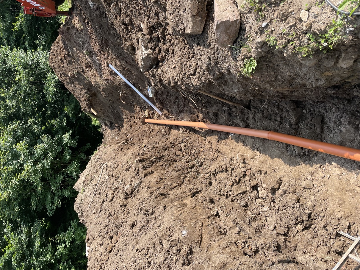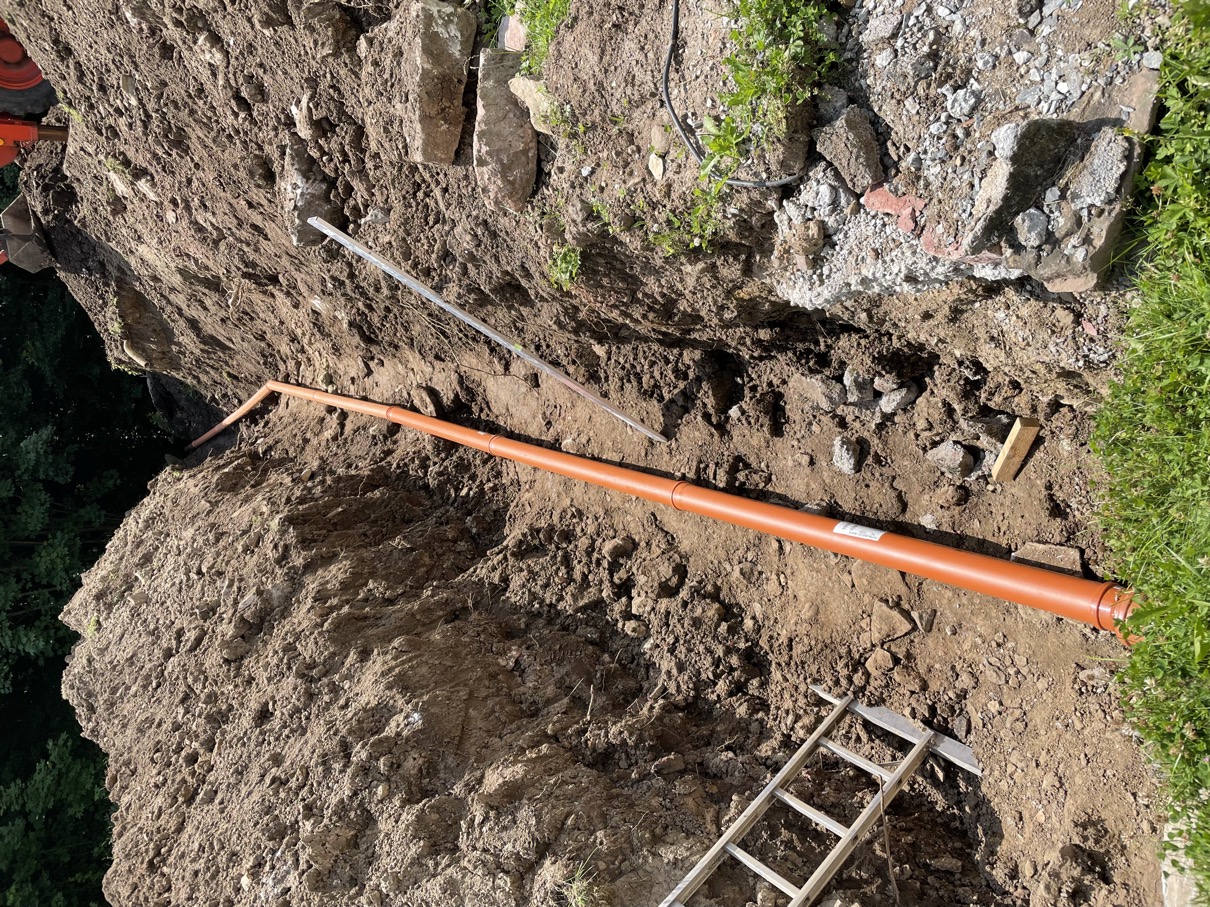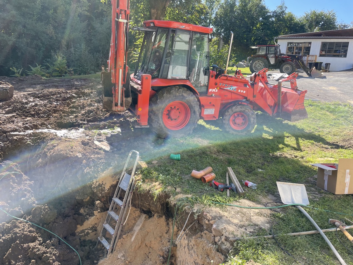 Nachdem wir nochmals alle Höhen überprüft hatten .... mußten wir leider feststellen, dass der für die alte Anlage ausgebaggerte und neu installierte Ablauf des geklärten Wassers in den Schwarzbach zu hoch lag (ca. 15 cm) --> was leider bedeutete: nochmals einen kompletten Graben ziehen vom Tank zum Schwarzbach und ein neues GK-Rohr legen mit entsprechendem Gefälle zum Schwarzbach hin.