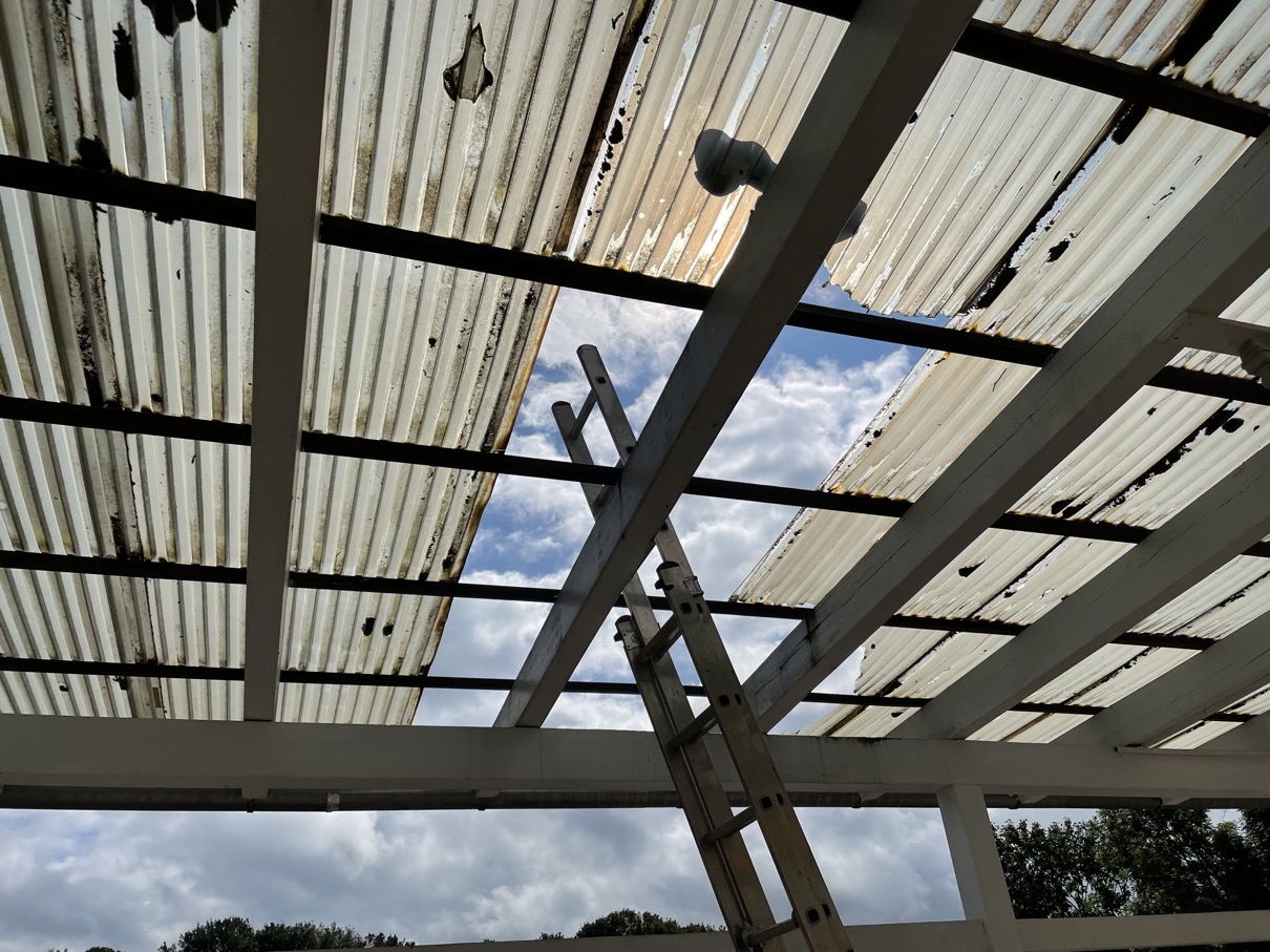 Der Plan ohne Plan zu arbeiten hat sich bezahlt gemacht -> alle Sturmschäden binnen knapp 3 Stunden behoben; mindestens 30 mal die Leiter umgestellt - aber was soll's - nur das Ergebnis zählt: das Dach ist wieder dicht - allerdings: bei der Begutachtung erkannt, dass fast die komplette Querlattung verfault ist und die Wellplatten oberhalb der Querlattung thermisch verformt sind (weil auf der Oberseite nicht weiß gestrichen - diese Vollpfosten). Das bedeutet, dass im kommenden Jahr das komplette Vordach erneuert werden muss (aber diesmal werde ich wohl, wenn finanziell passend, Doppelstegplatten legen).