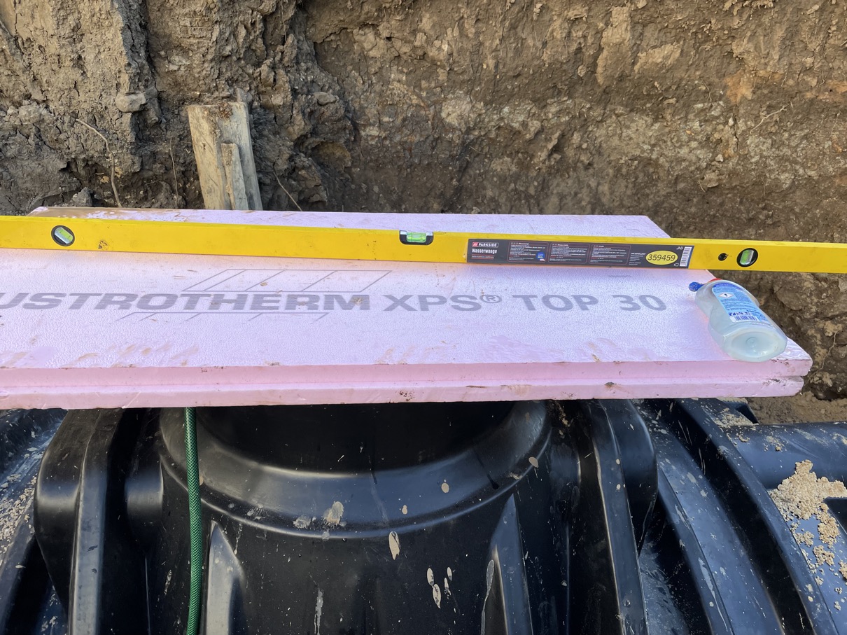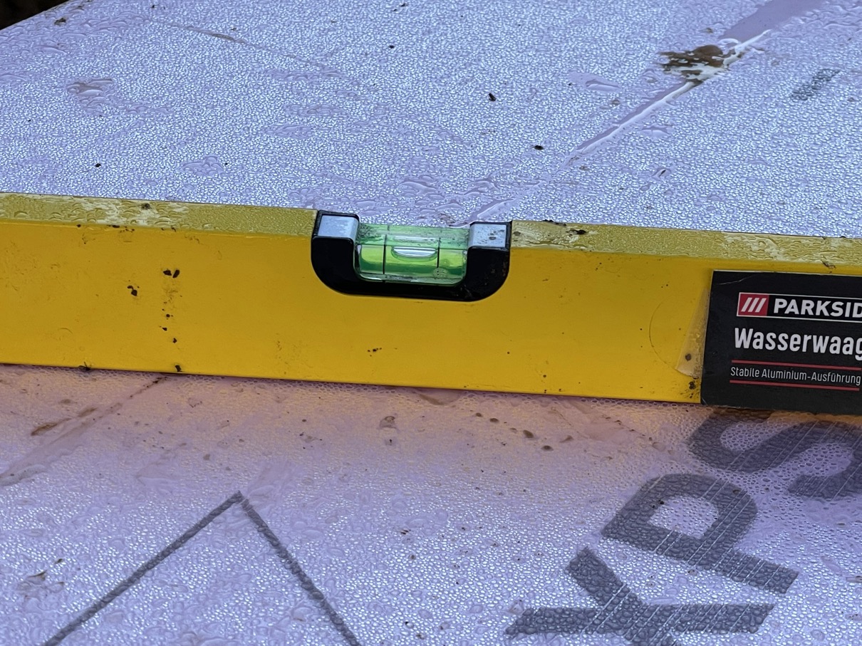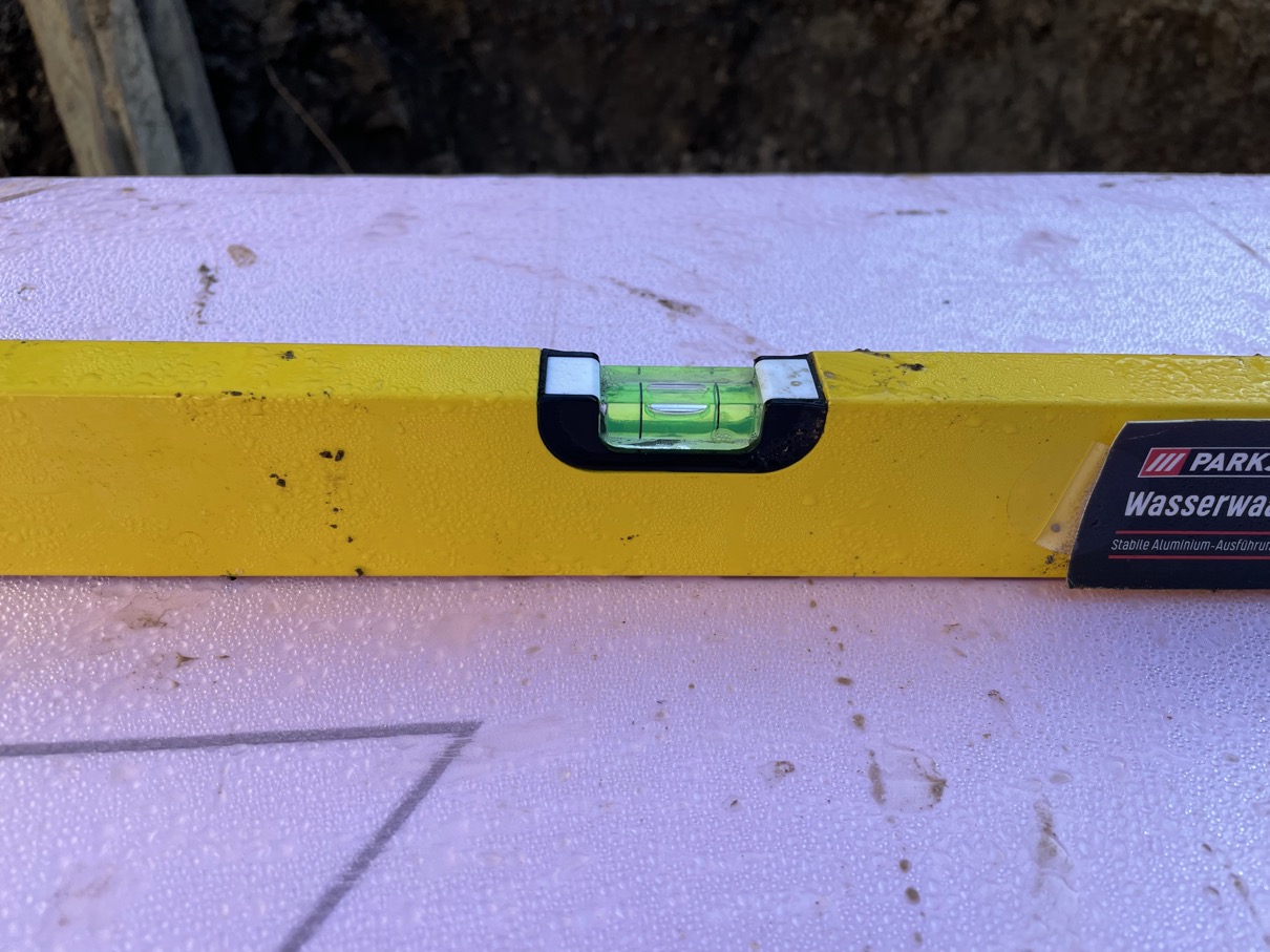 Nachdem wir den Tank ausgerichtet hatten (und er natürlich durch das Grundwasser bedingt) leicht aufschwamm haben wir ihn mit Klarwasser (zumindest teilweise) gefüllt, um die wirkliche Lage des Tanks zu prüfen. Selbstverständlich senkte er sich noch ungleich, so dass wir Stützmaßnahmen ergriffen haben (mit Stützhölzern) und danach versucht, das Ganze zu sanden. Dabei ham der Tank wieder leicht hoch, so dass wir nochmals Wasser zugeführt haben, um ihn möglichst schwer zu machen.