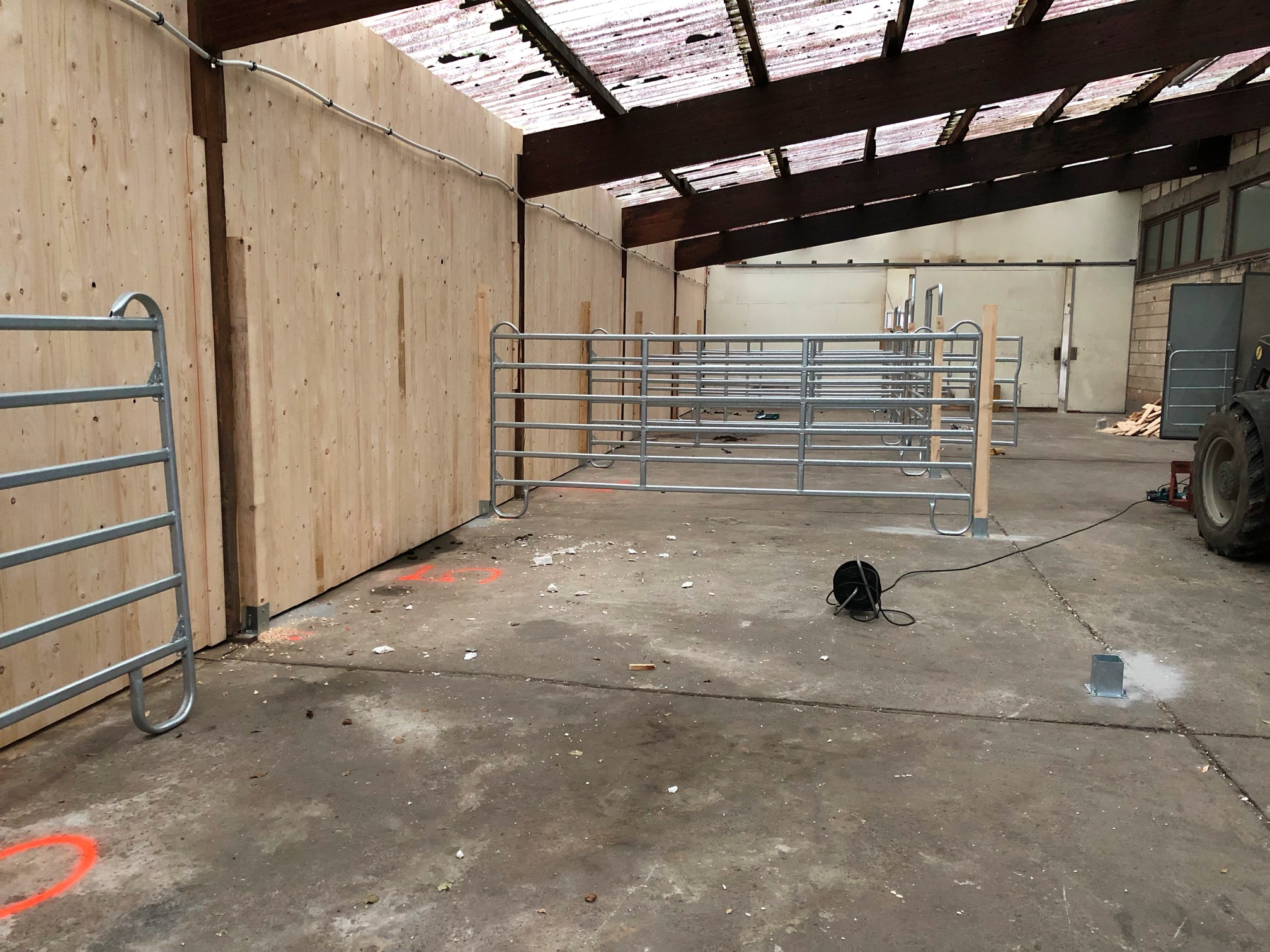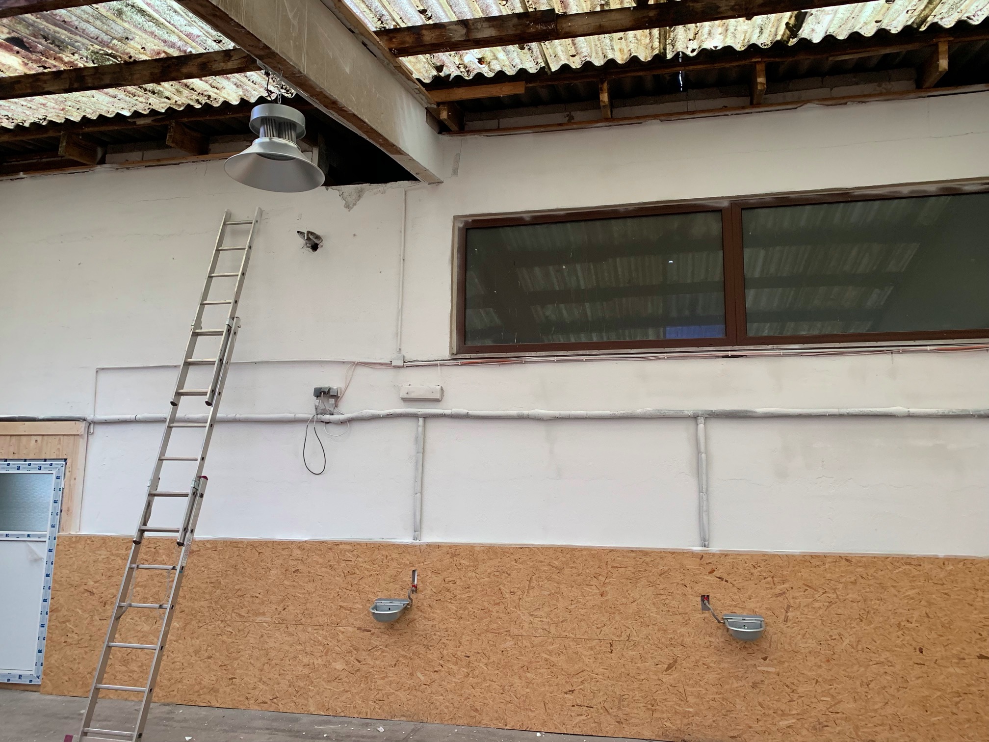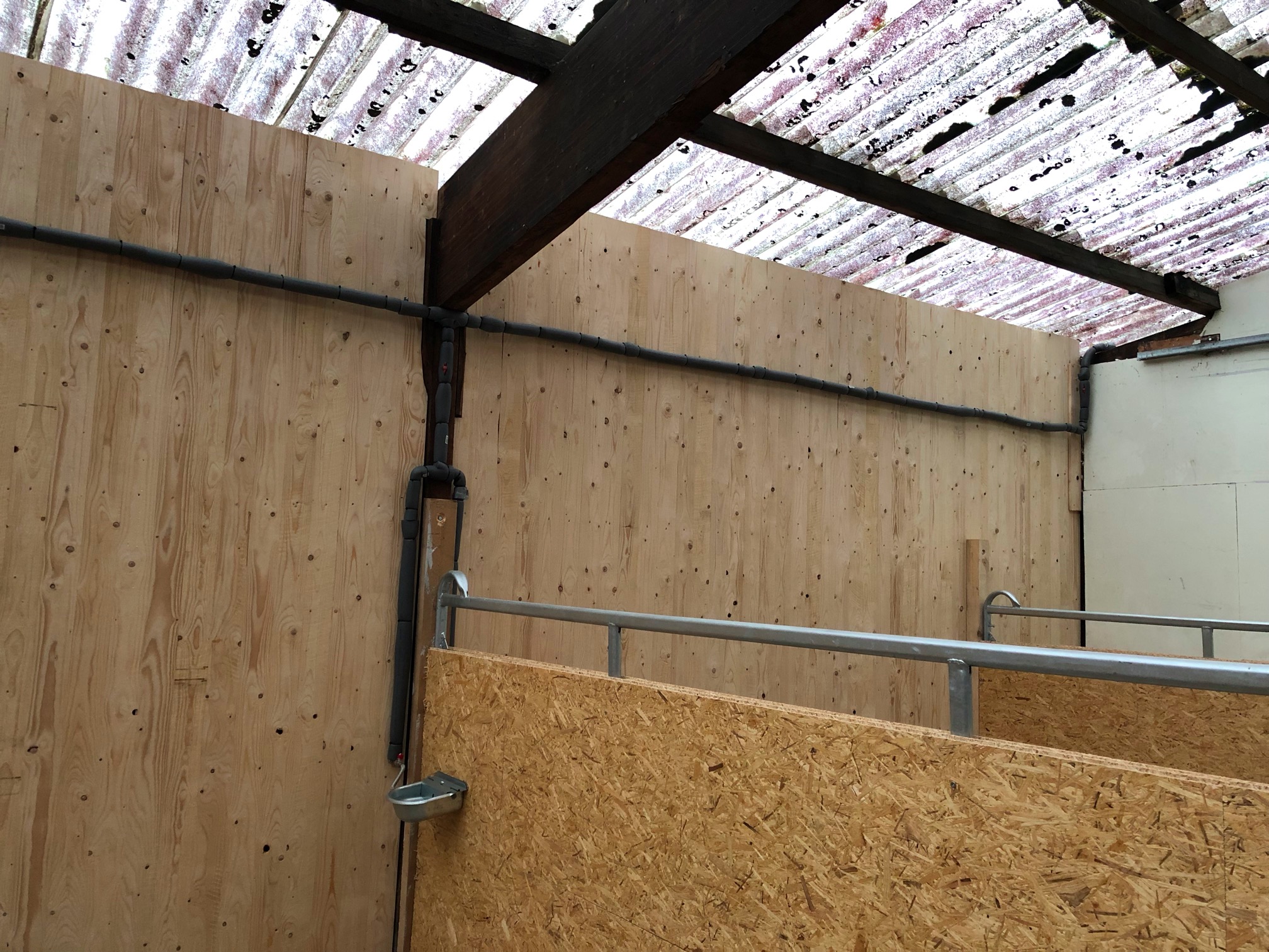 Bevor mit der Hallenbande weitergemacht werden kann muss zunächst noch im künftigen Offenstall weitergearbeitet werden - es muss ein Starkstromkabel (eher nicht gut für Pferde) verlegt (vielleicht wird es ja irgendwann mal wieder benötigt) und auch abgeschaltet werden und in diesem Zusammenhang auch gleichzeitig die Wand verkleidet werden: