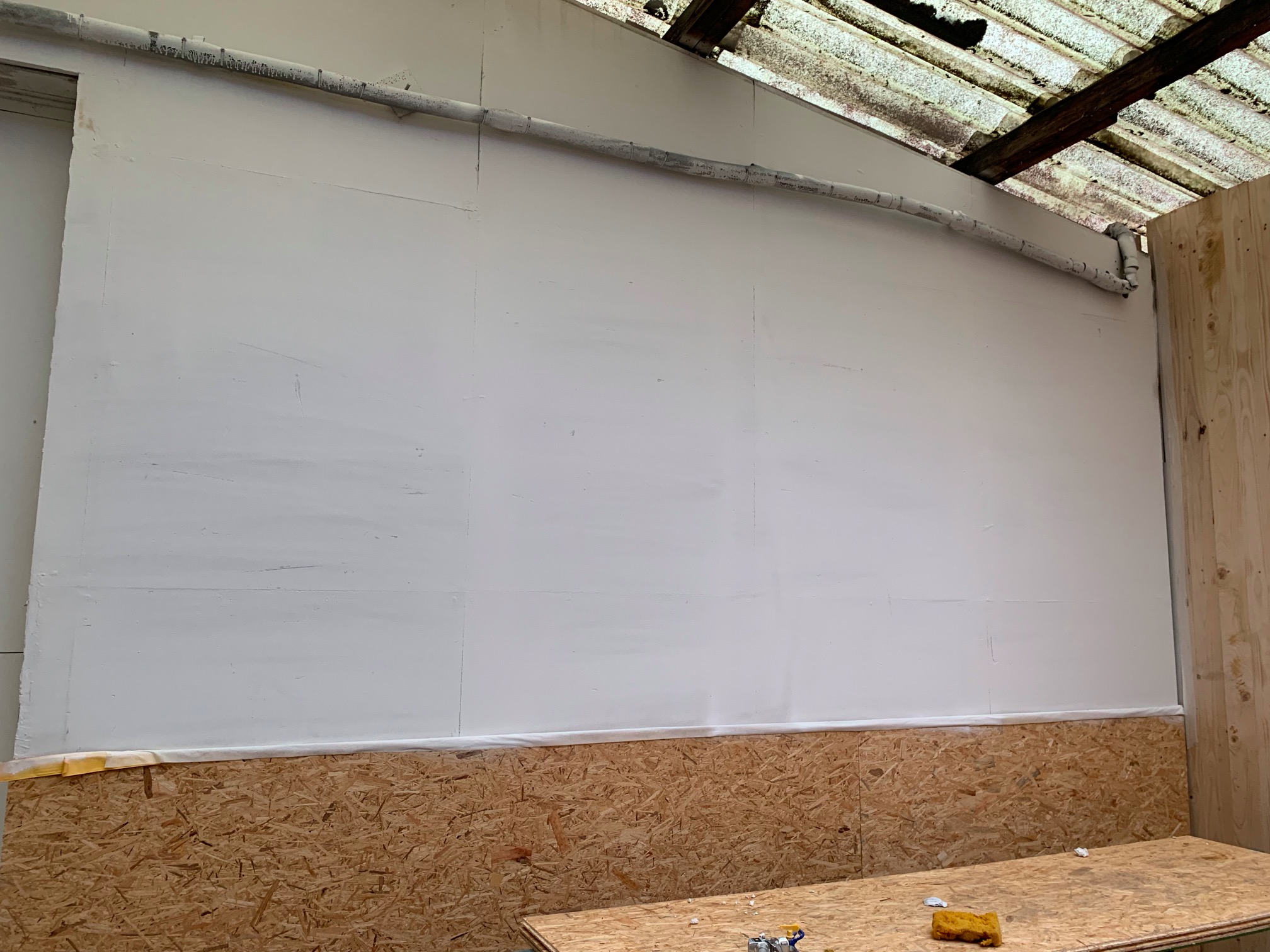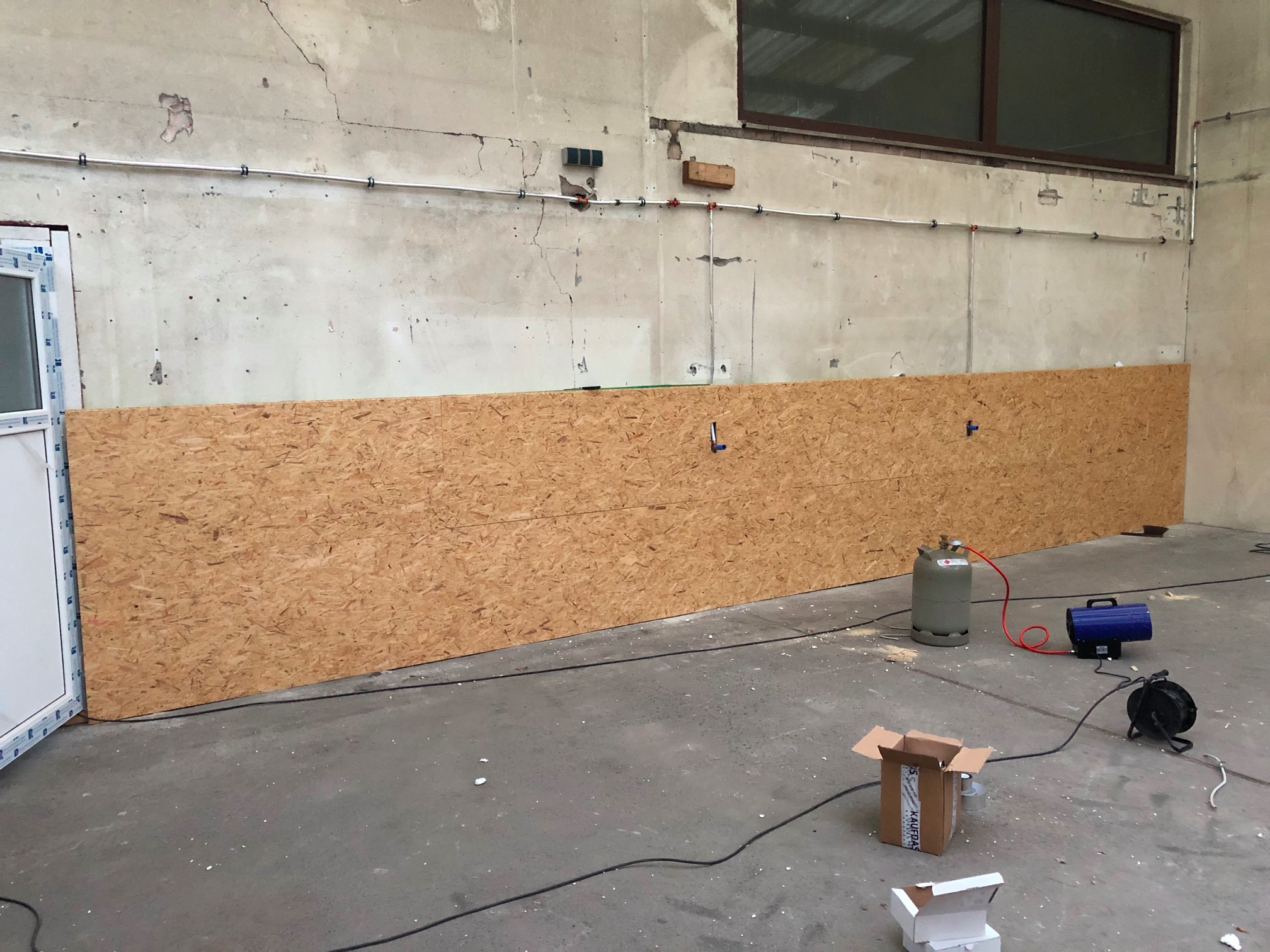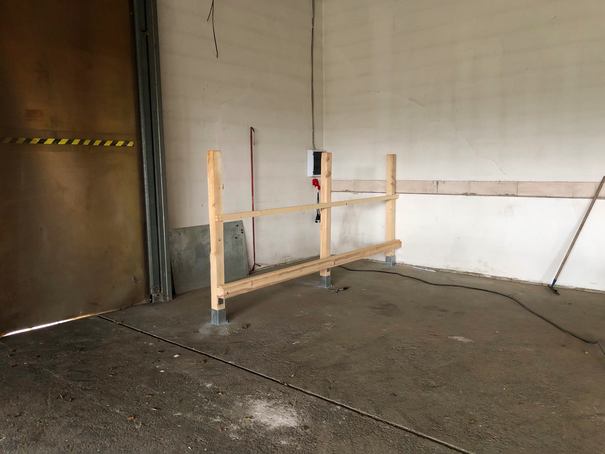 Bevor mit der Hallenbande weitergemacht werden kann muss zunächst noch im künftigen Offenstall weitergearbeitet werden - es muss ein Starkstromkabel (eher nicht gut für Pferde) verlegt (vielleicht wird es ja irgendwann mal wieder benötigt) und auch abgeschaltet werden und in diesem Zusammenhang auch gleichzeitig die Wand verkleidet werden: