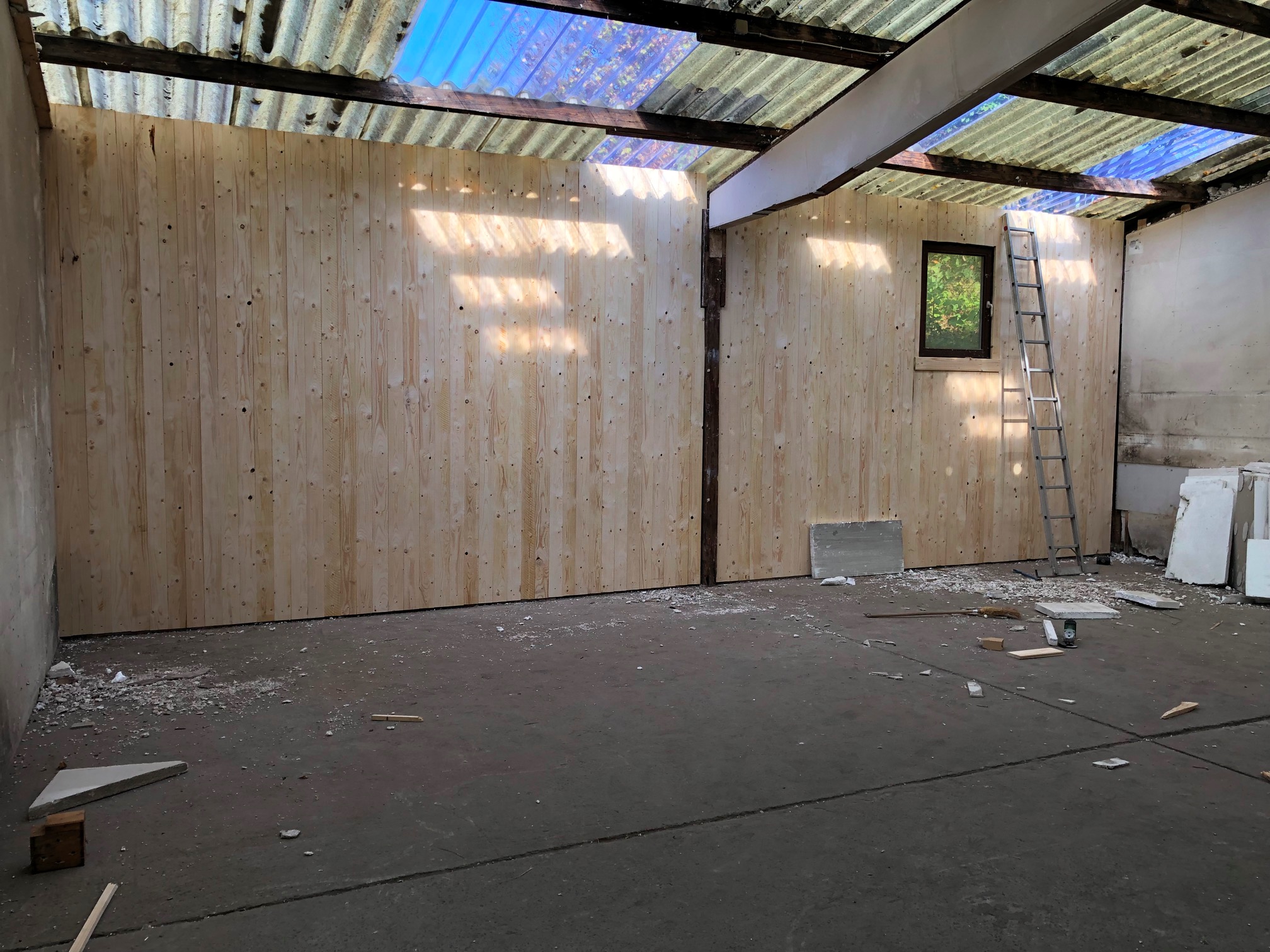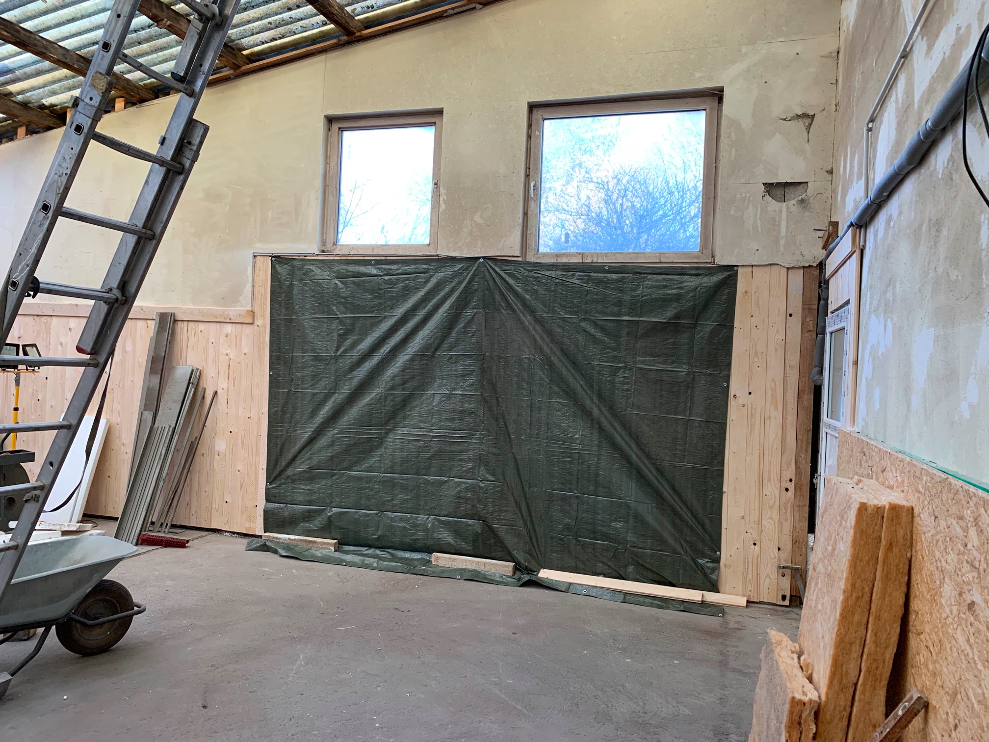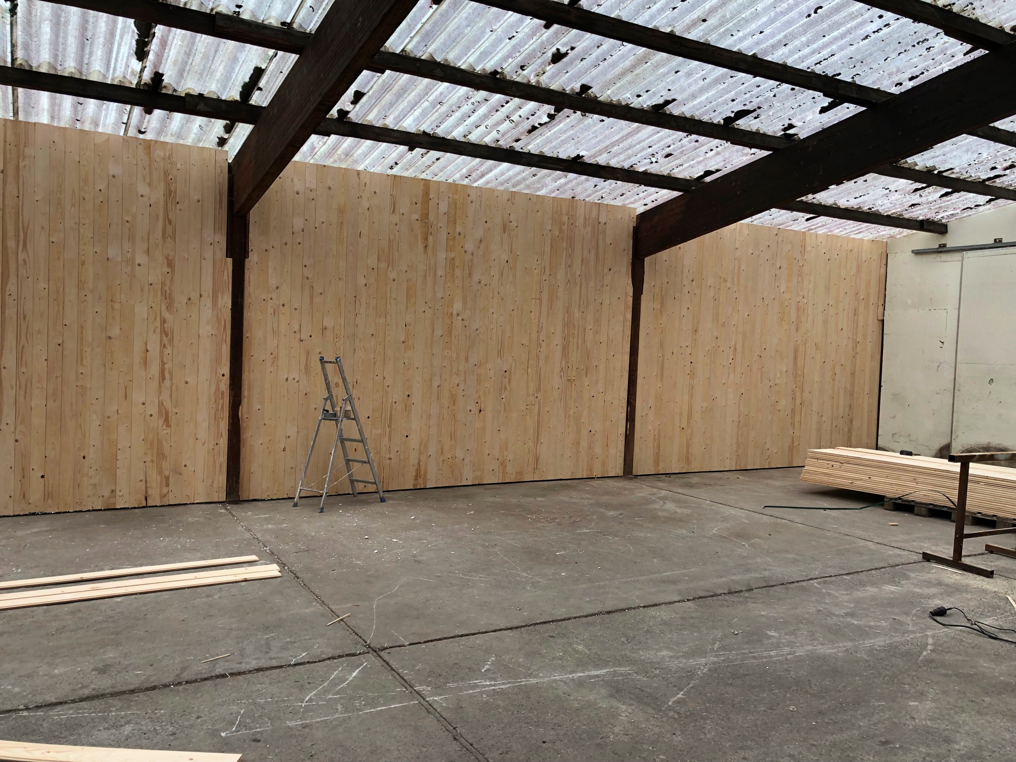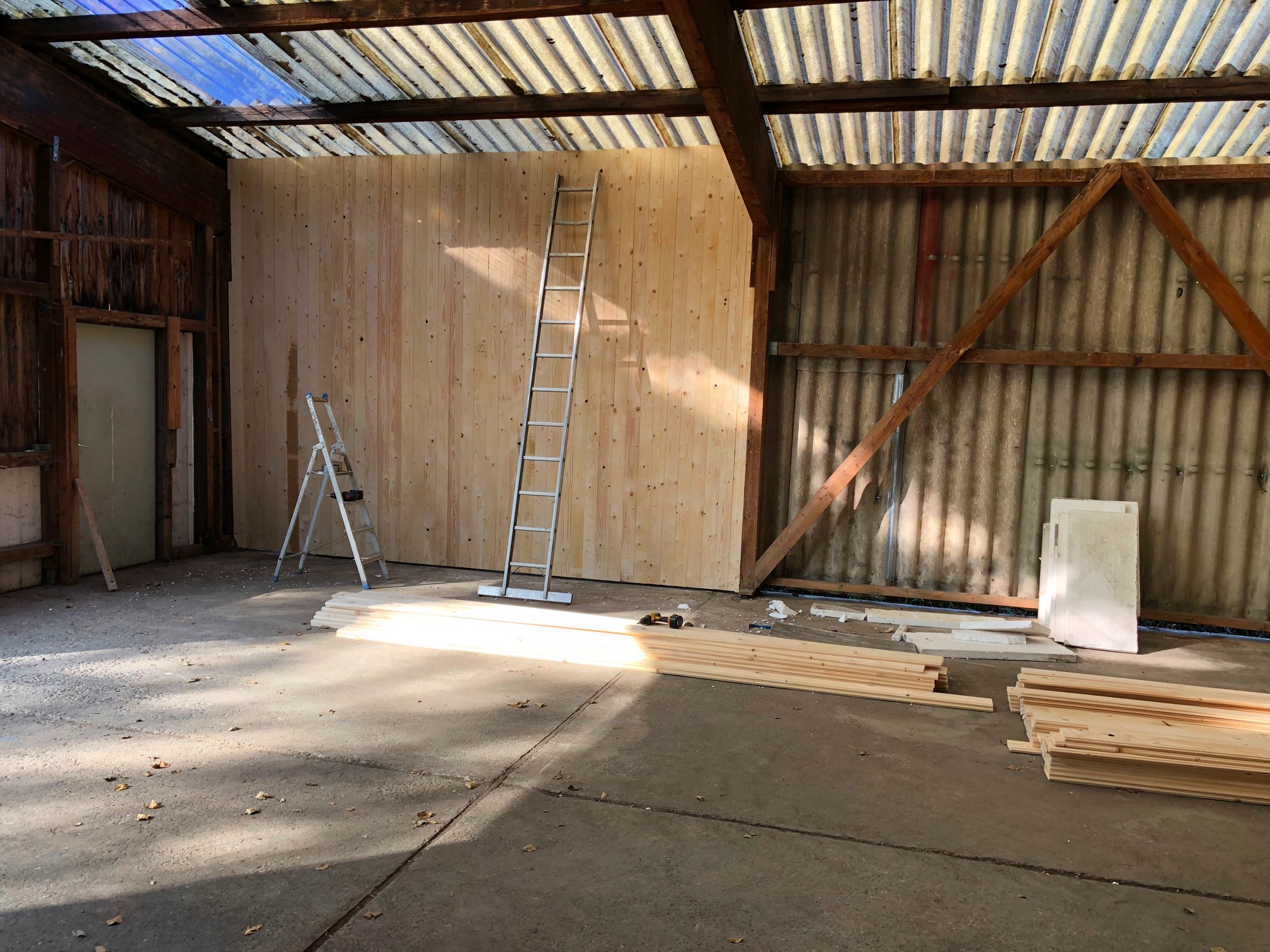 Es beginnt mit der Holzverkleidung (Rauspund) der Außenwand im künftigen Offenstall: